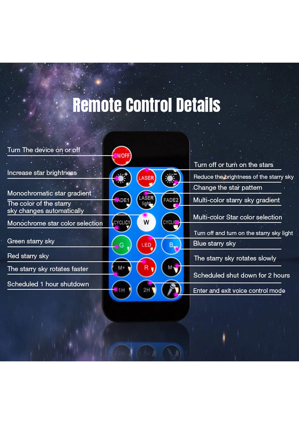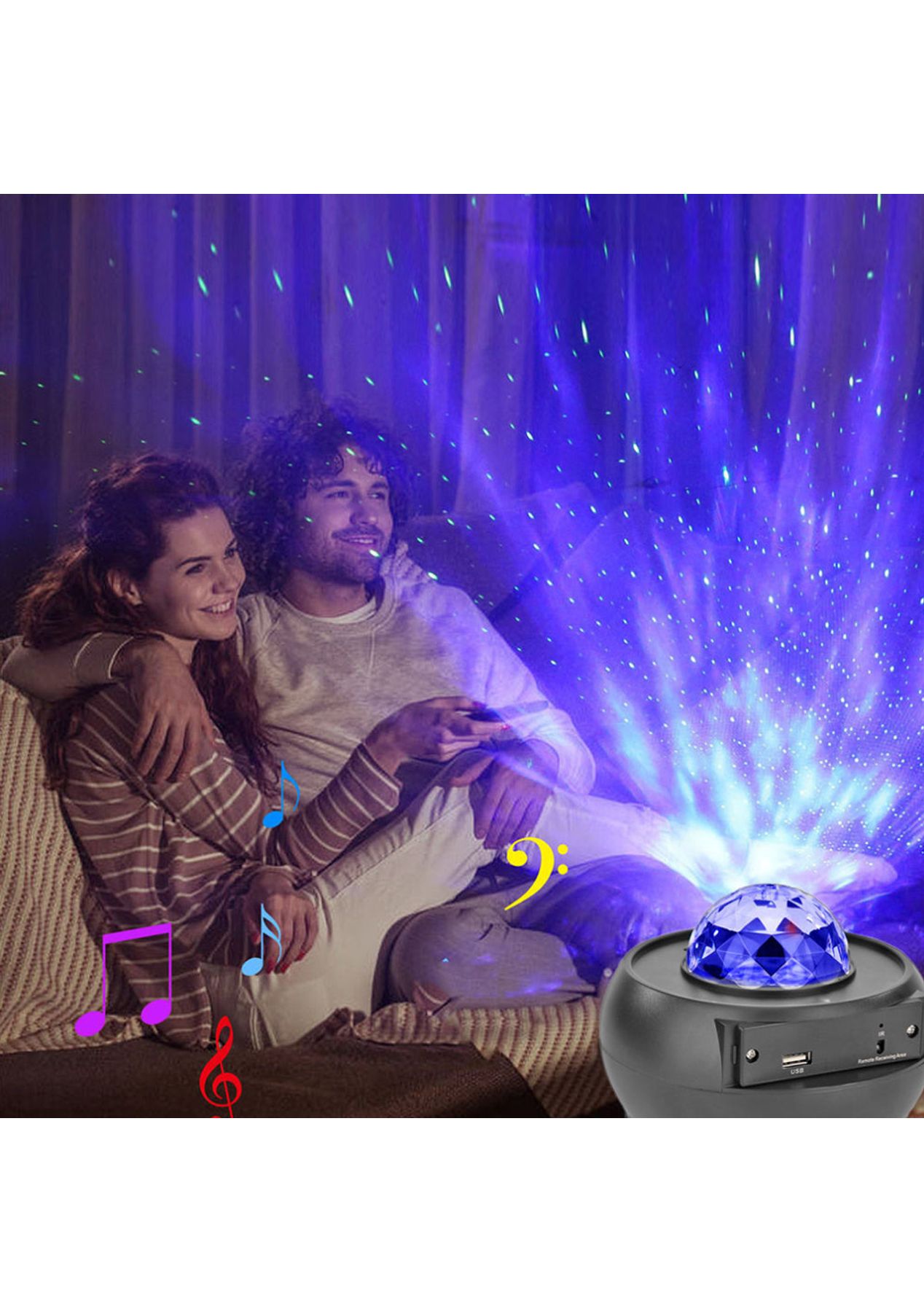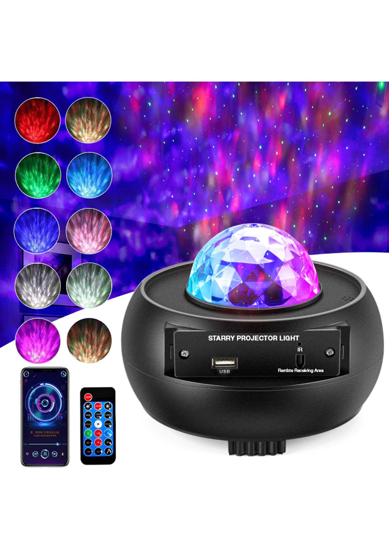 Product Description: This kind of projector is a good supply for parties, birthdays, festivals, holidays, and other occasions and activities, helping to build a warm and interesting atmosphere for your room.The USB projection lamp can be placed on the desktop to decorate the room, and it works with a starry sky lighting effect. You can also mix and match colors according to your liking.You can adjust the brightness and lighting through the use of the remote control that is included in the package, controlling the light conveniently to meet your different needs.This light projector is suitable for indoor and outdoor use, this projection light is easy to store and carry because of its small size and lightweight, and it works with a large lighting area that is about 5-50©O.This device has a USB Interface. You can connect the light to the power bank, computer, and phone adapter, the USB design makes it easy to work.Automated control timer. The star projector light built-in 1H, 2H, and 4H auto-off timer, the night light projector light will automatically shut off after the preset time.Product Specification:Material: ABSColor: BlackSize: 145 * 115 mmLight Source: LED LightLight Source Power: 7.5WMusic Mode: BT connection/Card reader/U-diskInput voltage: 100-240V AC 50/60Hz 1.5A (V)Output voltage: 5V/1000MA* Projector Light: Powered by USB Cable* Remote Control: Powered by 1 * CR2025 Button CellController: 1H/2H?wireless remote control?Package Inclusion:1 * Starry Projector Light1 * USB Cable1 * Remote Control1 * User Manual ?