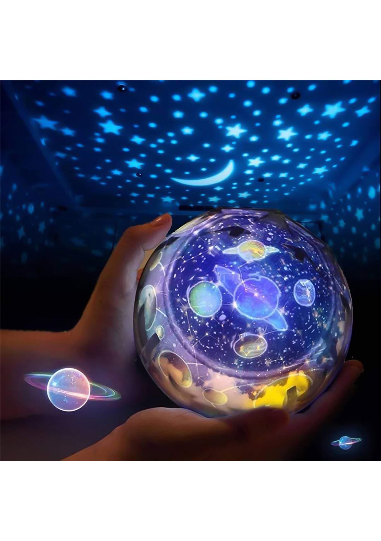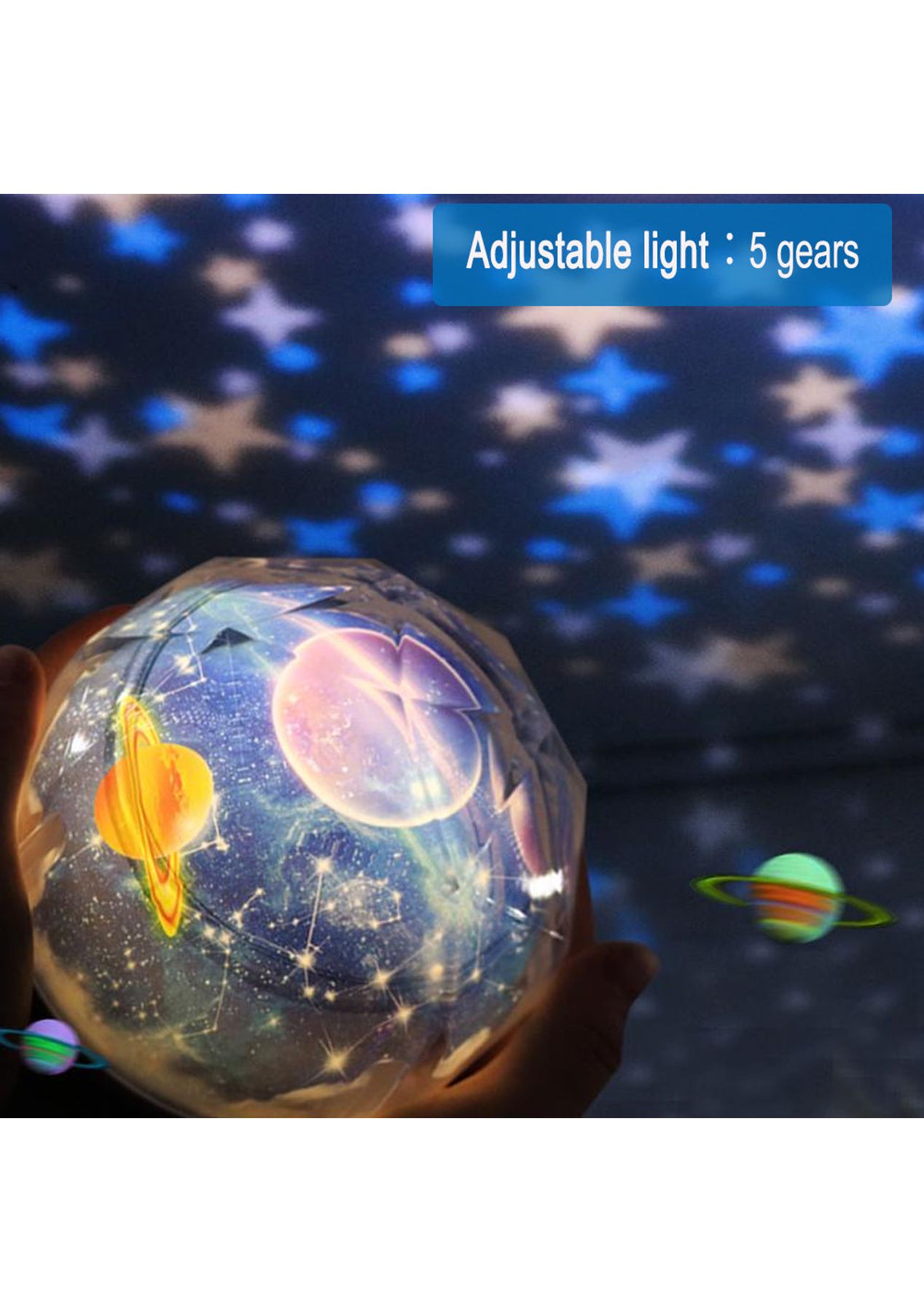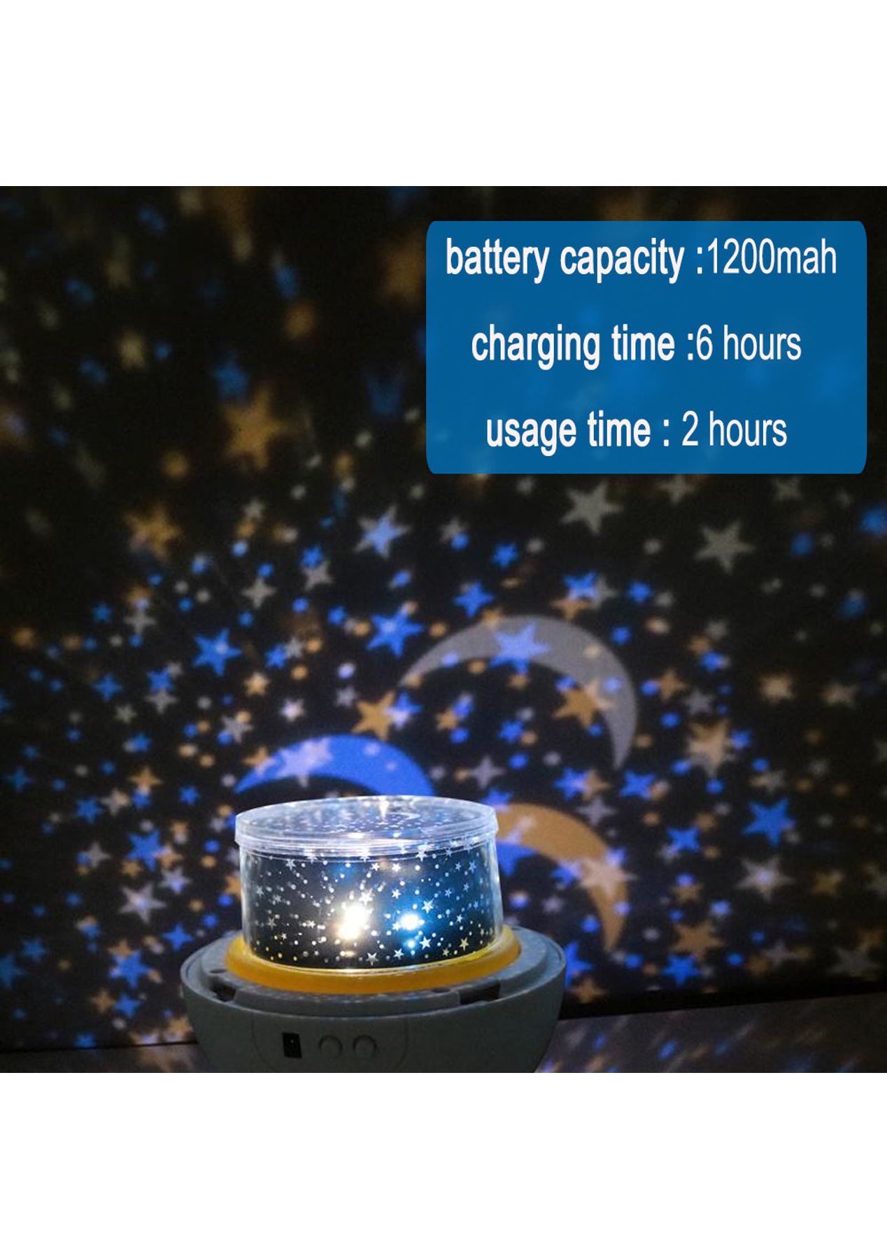 Product Description: Different Patterns:?Get closer to the planets of the galaxy, ocean, and skies and give your child a good night's rest with this night light for the kid's room. This light can help your kids be familiar with the different planets and the vast oceans and help your children get a good night s sleep.360-degree rotation of the base:?the base of this children s night light can rotate for up to 360, with this function, there will be a different color space, to view and understand the planets. The high-power beads are brighter and more beautiful, and the lighting range is higher than the previous versions.High-Capacity Battery:?This night lamp is equipped with a 1200mAh large-capacity built-in battery that takes 6 hours to fully charge and gives you up to 2 hours of usage time. You can charge this lamp by using the USB data cable (not including a power adapter). ?Product Specification:Light Colors: Blue, White, Green, Yellow, RedPatterns: Color universe, Ocean, Starry sky, Birthday, MoonMaterial: ABS, PCSize: 13*13cmWeight: 411gCable Length: 0.5mFunctions: Night LampAdjustable Light: 5 gearsUsage Time: 2 hoursCharging Time: 6 hoursBattery Information: 1200mAhPower Supply: USB?Package Information:1 * Night Lamp5 * Patterns1 * USB cable1 * User Manual?