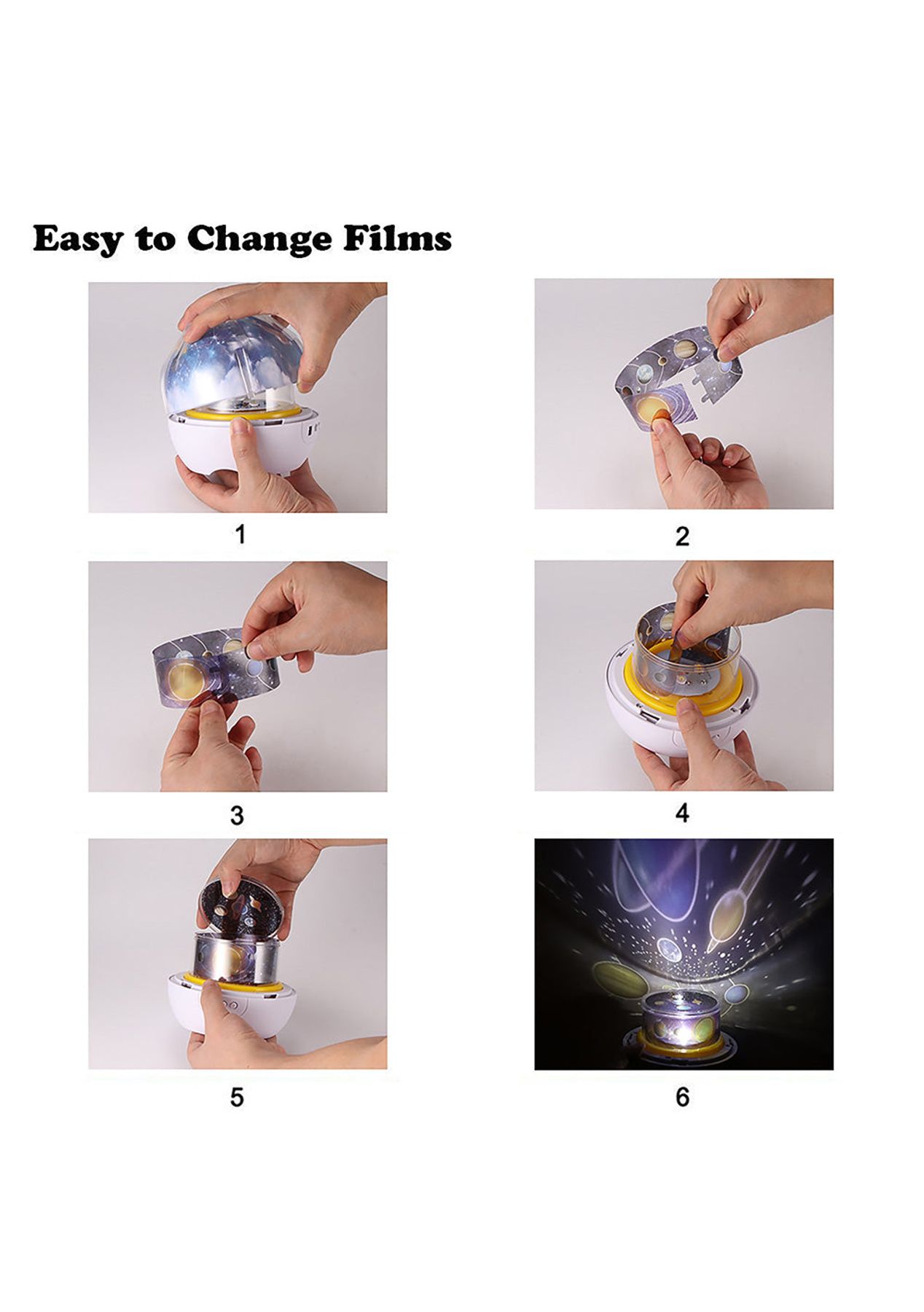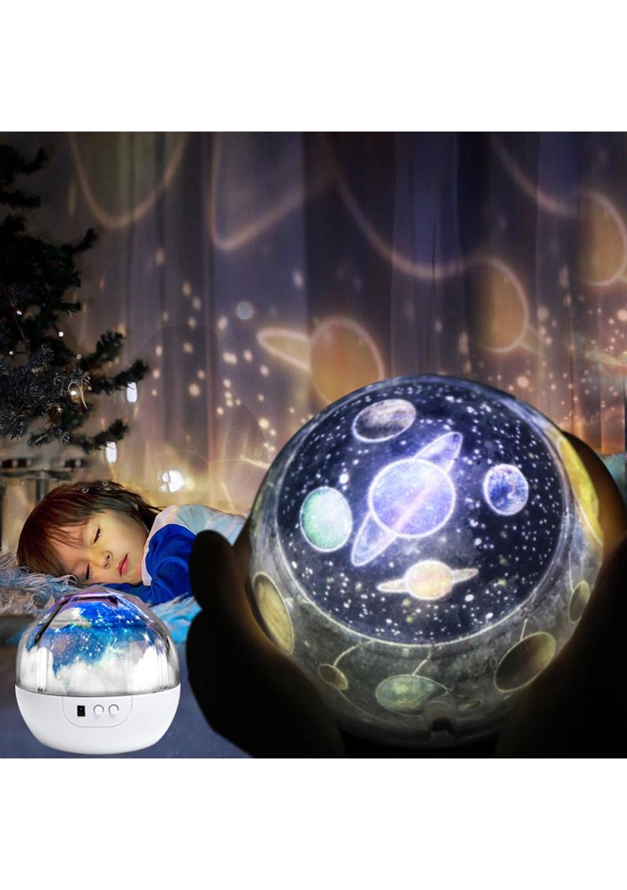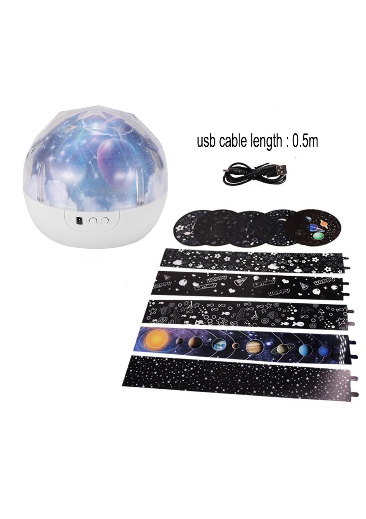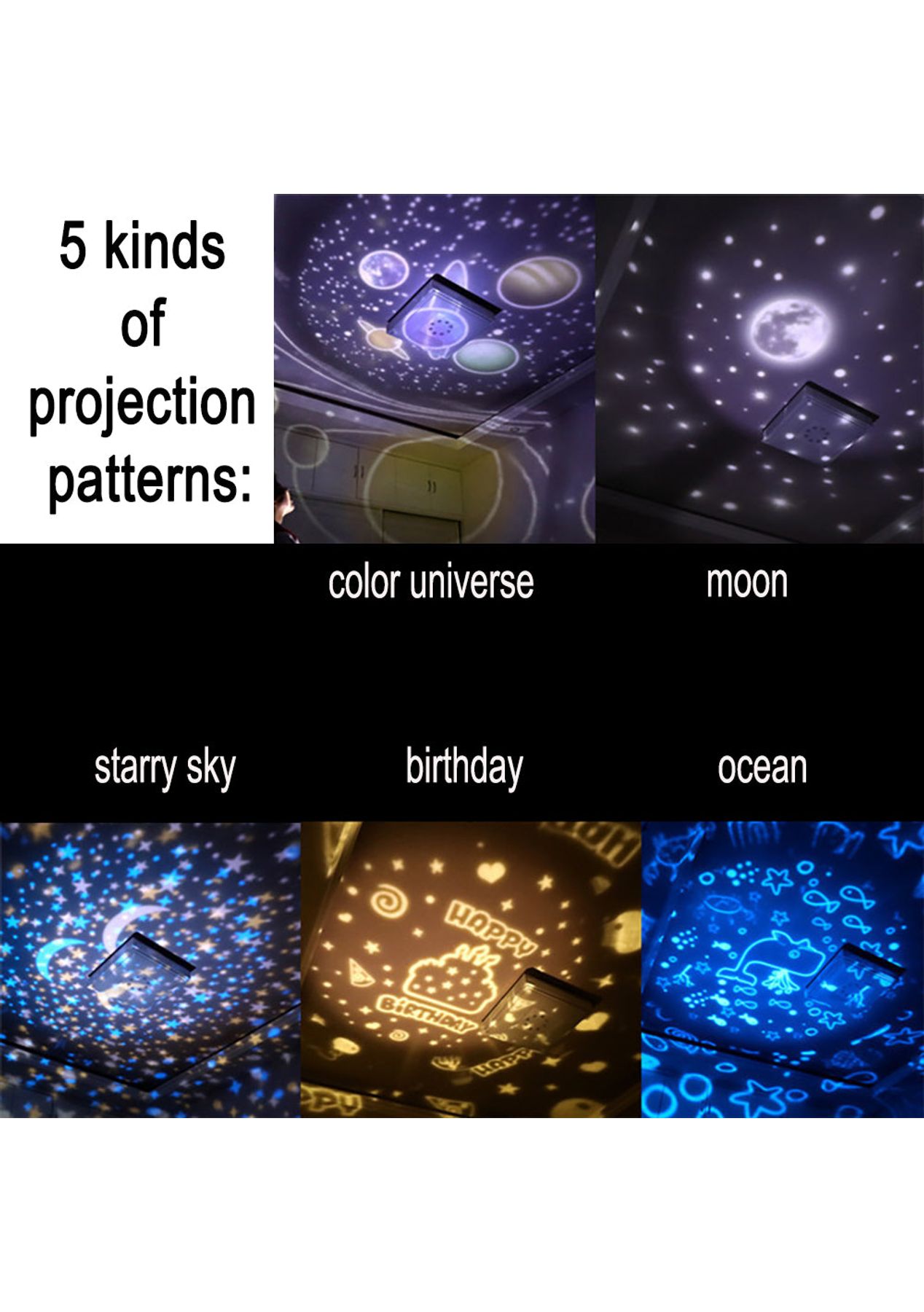 Product Description: Different Patterns:?Get closer to the planets of the galaxy, ocean, and skies and give your child a good night's rest with this night light for the kid's room. This light can help your kids be familiar with the different planets and the vast oceans and help your children get a good night s sleep.360-degree rotation of the base:?the base of this children s night light can rotate for up to 360, with this function, there will be a different color space, to view and understand the planets. The high-power beads are brighter and more beautiful, and the lighting range is higher than the previous versions.High-Capacity Battery:?This night lamp is equipped with a 1200mAh large-capacity built-in battery that takes 6 hours to fully charge and gives you up to 2 hours of usage time. You can charge this lamp by using the USB data cable (not including a power adapter). ?Product Specification:Light Colors: Blue, White, Green, Yellow, RedPatterns: Color universe, Ocean, Starry sky, Birthday, MoonMaterial: ABS, PCSize: 13*13cmWeight: 411gCable Length: 0.5mFunctions: Night LampAdjustable Light: 5 gearsUsage Time: 2 hoursCharging Time: 6 hoursBattery Information: 1200mAhPower Supply: USB?Package Information:1 * Night Lamp5 * Patterns1 * USB cable1 * User Manual?
