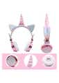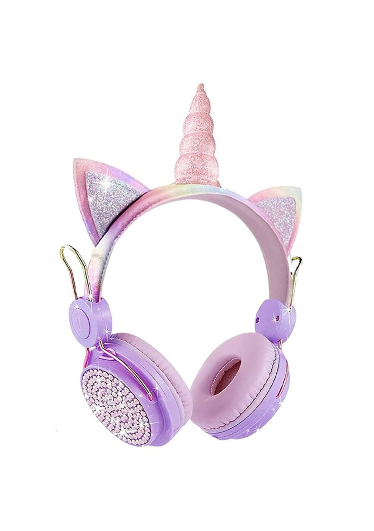 Product Description: With lovely trendy and glitter unicorn design and cushioned earpads headband, let your little one loses themselves in audio book and their favorite songs with these fun on-ear headphones. Also comes with a nice unicorn gift box, it would be a great gift for unicorn lovers girls children and teens.??This wired headphone features soft padded cushions and adjustable headband, long-wearing without any stress. Adjustable handy headband to ensure fit different sized heads, suitable for ages among 3-12, girl headphones also can be used in the car, school, airplane, home or cosplay.?The unicorn headphones are capable of Crisp, clear sound and bumping bass which make for a complete surround sound experience, provide maximum listening enjoyment for your kids and allow them indulge in music, audiobooks and multiple learning resources in comfort.?Long press the switch button (the middle one) for three seconds, the Bluetooth will be on, pair it up your device, such as smartphone, TV, iPad, kindle...Product Specification:Color: Pink, Purple, Gold, Rose Gold, BlueWeight: 350gMaterial: BPA Free Non-ToxicSize: 25 x 20 x 7 cmPower Supply: USB RechargeableFunction: Wireless Bluetooth Kids Unicorn Headphones?Package Inclusion:1 x Unicorn Headphones1 x USB Charging Cable ?1 x 3.5mm Audio Line1 x Manual