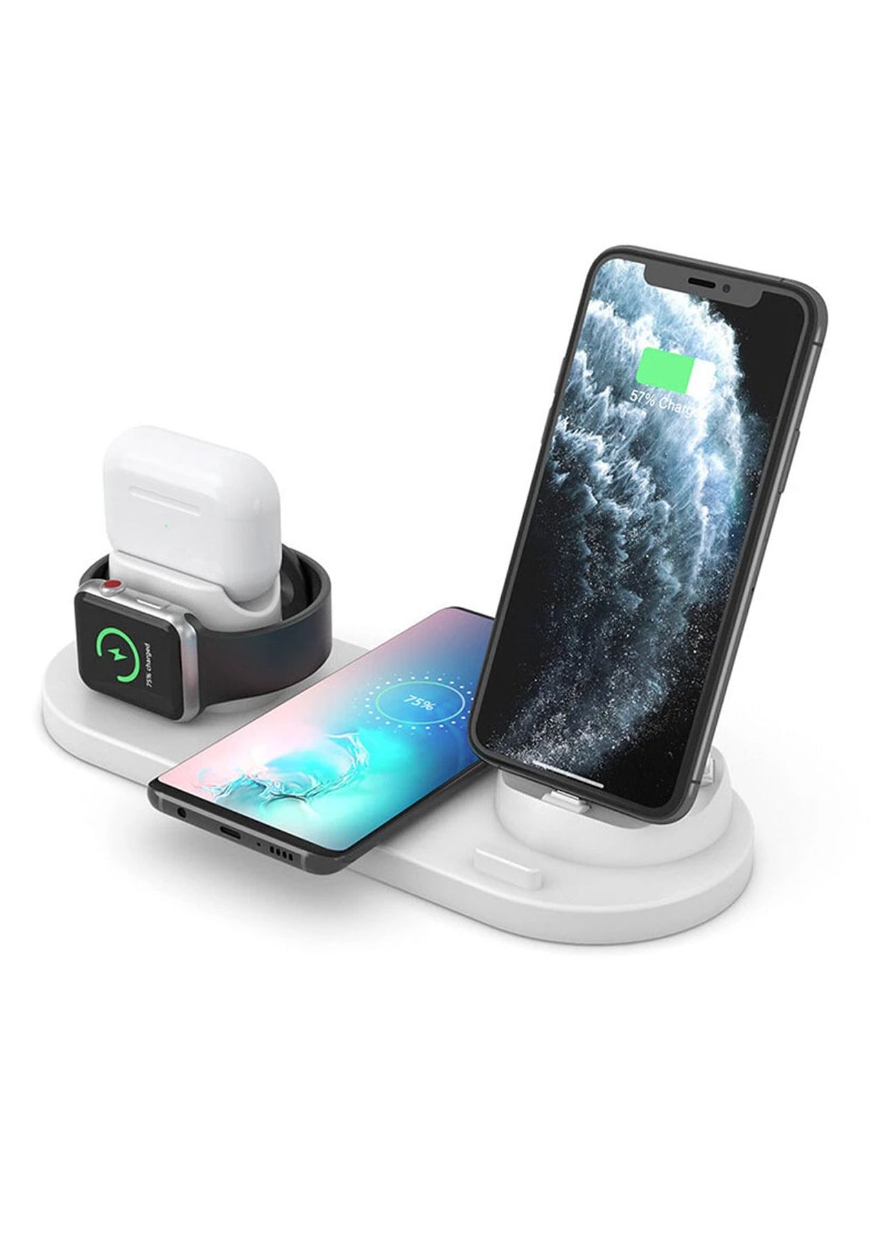 Product Description: This?Enhanced Wireless Charging Station can charge?up to?six?devices at the same time. It supports Apple, Micro USB, and Type C interface, and can also charge your headphones and smartwatch.?It is the most flexible choice which can?satisfy all cargo equipment. Please note that for faster and safer charging, please use 12V / 2A or 9V / 2. 7A or QC3 adapter(not?included).?This is a six-in-one wireless charging compatible with iWatch series 5/4/3/2/1, Airpods 3/2/1, iPhone 11/11 Pro, Xs, Xs Max, Xr, X, 8, 8 Plus, Samsung Galaxy S10, S10 Plus, S9, S9 Plus, S8, S8. Plus / S7. / S7 Edge / S6 Edge Plus / Note 9 / Note 8.The metal support plate of the wireless charger can be adjusted to different angles, and the two large charging coils can support vertical or horizontal mobile phone charging, and enjoy programs or video calls. It has a lightweight design making it convenient to put in a backpack, it can also be used to charge two phones at the same time, suitable for home, office, and travel.It has a fast-charging?wireless charger design.?It comes with?over-current protection, over-voltage protection, and over-temperature protection, as well as a foreign object detection function, it can prevent damage from equipment battery overcharging.?The charging stand can?effectively match the current that should be supplied to your device according to its specific needs to prevent the device from short circuits and to guard your devices against overpowering.?Product Specification:Color:?Black, WhiteMaterial:?ABSSize:?9 * 23 cmWeight:?266gFunctions:?Wireless Charging StationOutput power: 10WInterface: USB Type C?Package Inclusion:1 * Wireless Charging Station1 * Type C Cable1 * User Manual ?