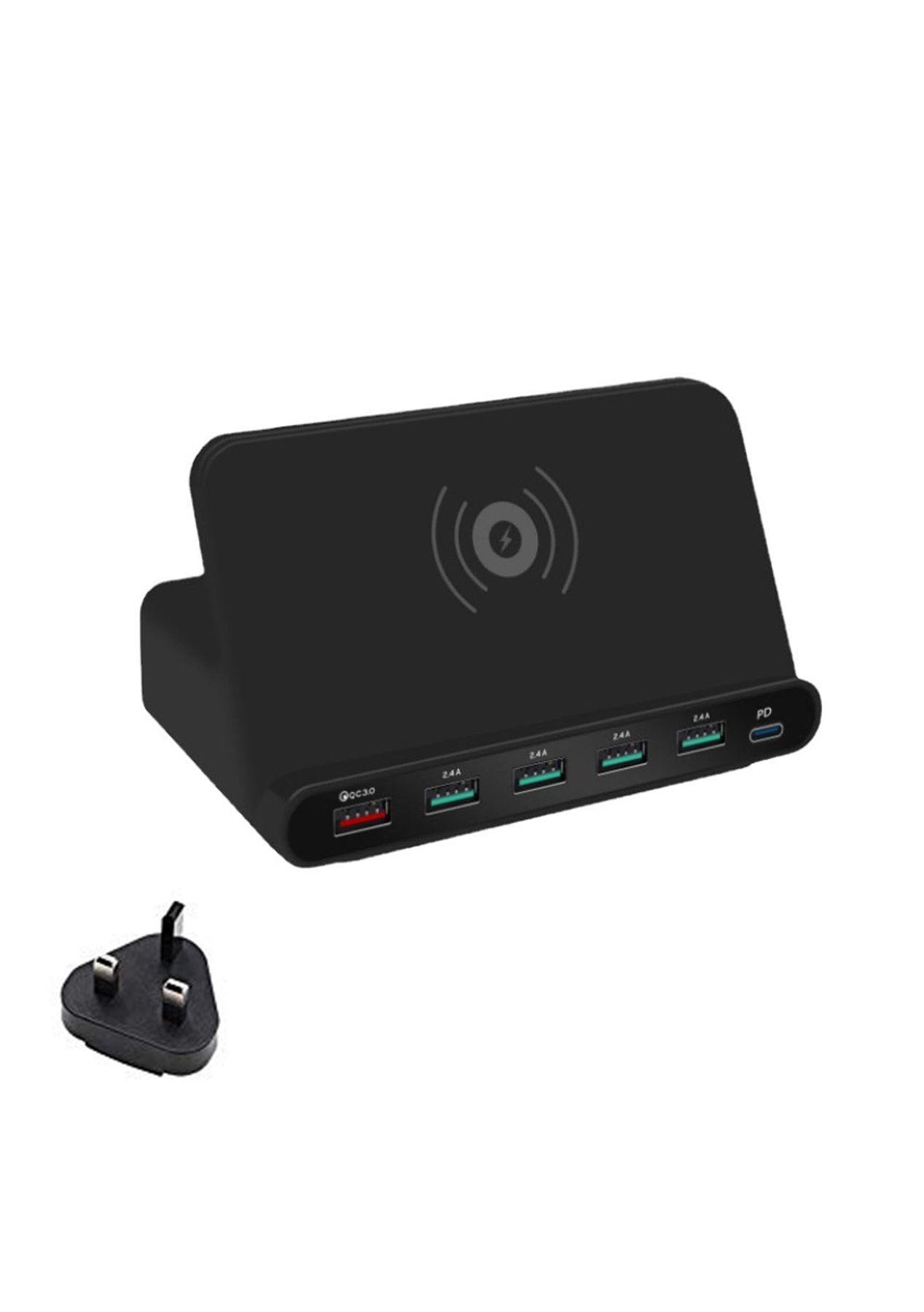 Product Description: This?10W?Wireless charger and 6 charging ports were built in this multi charging station to fulfill your multi-devices charging needs .built-in Quick Charge 3.0 and Type-c port. Using this?wireless charging stand helps you stay organized.It has?6 charging ports, four 2.4V USB charging ports, one Type-c charging port, and one quick charge 3.0 fast-charging port.5V/3A high-power output Type-c port, wireless charging maximum output power can reach 5W.?The wireless charger stand ensures the safety of your device during the entire charging process,?supports Qualcomm Quick 3.0 Charge.This charging station offers the perfect combination of a power strip and a wireless charging stand.?It is a compact and portable wireless charger, ideal for home or office. This wireless charger allows you to charge horizontally not support vertical charging. Great for using Face ID, viewing popup messages, or watching videos while charging.It is designed with two coils that are made of high-purity copper, wireless charger can identify your phone sensitively and support phone case within?5mm which?is the best wireless charging distance (Please note that metal and magnetic attachments or credit cards may damage your phone)?Product Specification:Color:?Black, WhiteMaterial:?PCSize:?133 * 80 * 70 mmWeight:?336gFunctions:?Multi-USB Wireless ChargerPlug: AU, EU, UK, USInput: AC 100-240v 50/60HzTotal power output: 5V--12A(MAX) 60WQC3.0 output: 5V-3A, 9V-2A, 12V1.5A 18WPD USB-c output: 5V/ 3A 9V/2A 12/1.5A 18WWireless fast charging output power: 10W(MAX)Normal USB output: 4xUSB 2.4A?Package Inclusion:1 * Wireless Charger1 * Power Plug (AU, EU, UK, US)1 * User Manual
