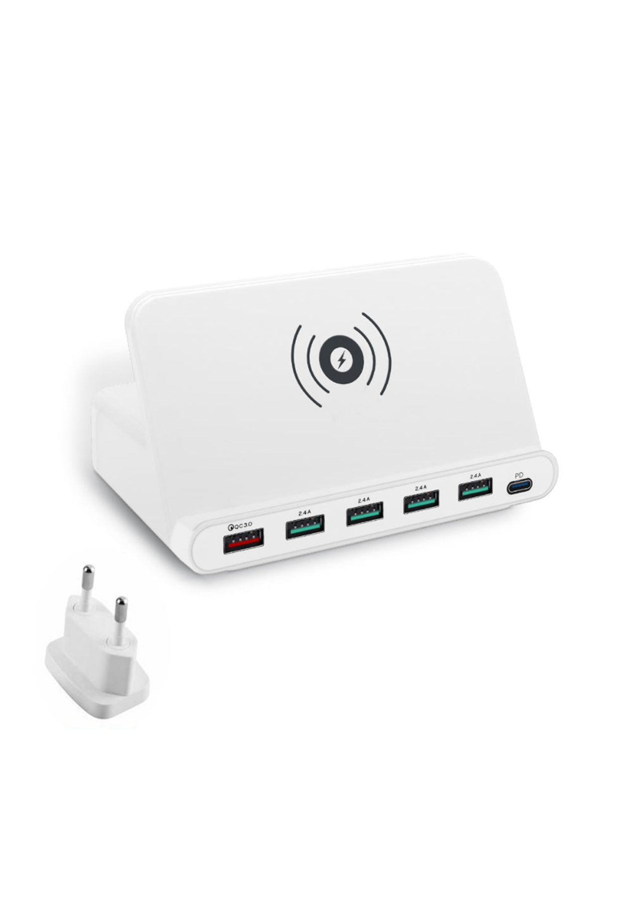 Product Description: This?10W?Wireless charger and 6 charging ports were built in this multi charging station to fulfill your multi-devices charging needs .built-in Quick Charge 3.0 and Type-c port. Using this?wireless charging stand helps you stay organized.It has?6 charging ports, four 2.4V USB charging ports, one Type-c charging port, and one quick charge 3.0 fast-charging port.5V/3A high-power output Type-c port, wireless charging maximum output power can reach 5W.?The wireless charger stand ensures the safety of your device during the entire charging process,?supports Qualcomm Quick 3.0 Charge.This charging station offers the perfect combination of a power strip and a wireless charging stand.?It is a compact and portable wireless charger, ideal for home or office. This wireless charger allows you to charge horizontally not support vertical charging. Great for using Face ID, viewing popup messages, or watching videos while charging.It is designed with two coils that are made of high-purity copper, wireless charger can identify your phone sensitively and support phone case within?5mm which?is the best wireless charging distance (Please note that metal and magnetic attachments or credit cards may damage your phone)?Product Specification:Color:?Black, WhiteMaterial:?PCSize:?133 * 80 * 70 mmWeight:?336gFunctions:?Multi-USB Wireless ChargerPlug: AU, EU, UK, USInput: AC 100-240v 50/60HzTotal power output: 5V--12A(MAX) 60WQC3.0 output: 5V-3A, 9V-2A, 12V1.5A 18WPD USB-c output: 5V/ 3A 9V/2A 12/1.5A 18WWireless fast charging output power: 10W(MAX)Normal USB output: 4xUSB 2.4A?Package Inclusion:1 * Wireless Charger1 * Power Plug (AU, EU, UK, US)1 * User Manual