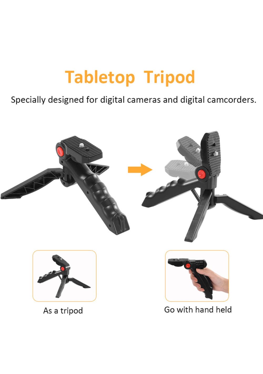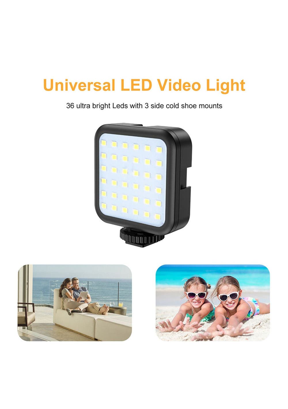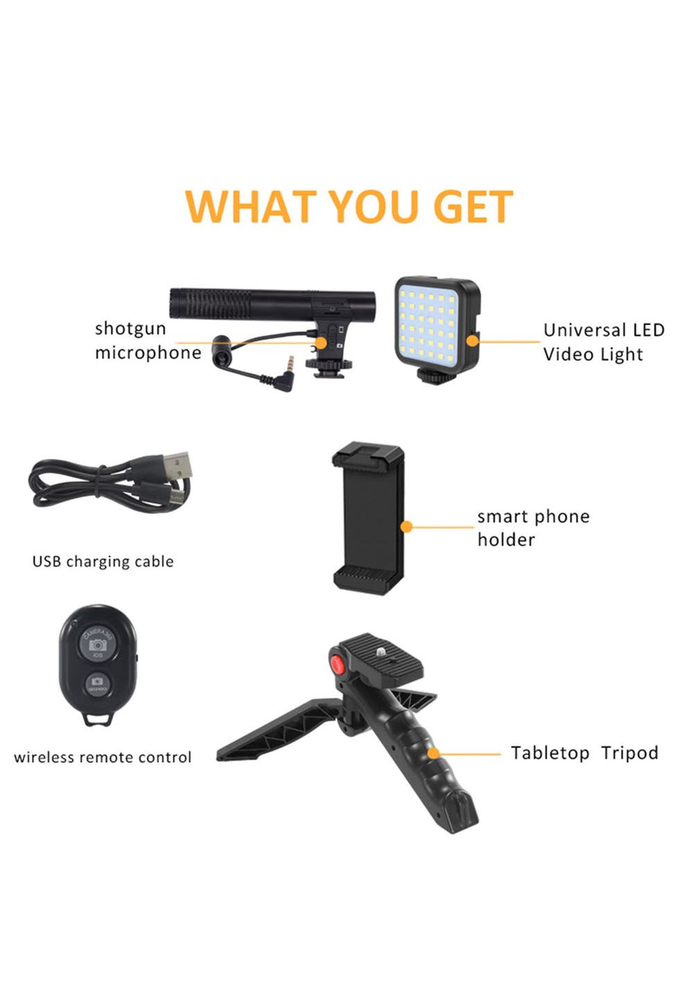 Product Description: The best tripod for vlogging. This has a non-slip feet design that keeps this adjustable tripod stable on the virtual ground surface. It has a lightweight and durable mini tripod that is ready to be put in your pocket or bag, convenient for travel.The fill light features 36 ultra-bright LEDs, with 3 brightness levels, and a rechargeable lithium battery that attaches securely to the hot shoe mount that is compatible with most digital video and SLR cameras.This Mobile Video and Photography Kit comes with a shotgun microphone and wireless Bluetooth remote control that produces?professional-quality?stereo sound and it includes a foam windshield and cold shoe mount. The Bluetooth remote control can be used to remotely wake up your phone or camera to start or stop recording videos and take selfies. (The maximum distance is approximately 29.5 ft.).This kit has a mobile holder that makes it easy to mount on and compatible with most devices. It works for iPhone 5, 6, 7, 8, X, XS, XR, 11, Samsung, Google, and camera. This is the perfect kit for starting vloggers and budding online video content creators.?Product Specification:Color: BlackMaterial: ABSPackaging Size: 24.5 * 23 * 4.2 cmWeight: 340gFunctions: Camera Accessories?Package Inclusion:1 * Tripod1 * Hot Shoe Mount1 * Remote Control1 * Fill Light1 * Microphone? ?