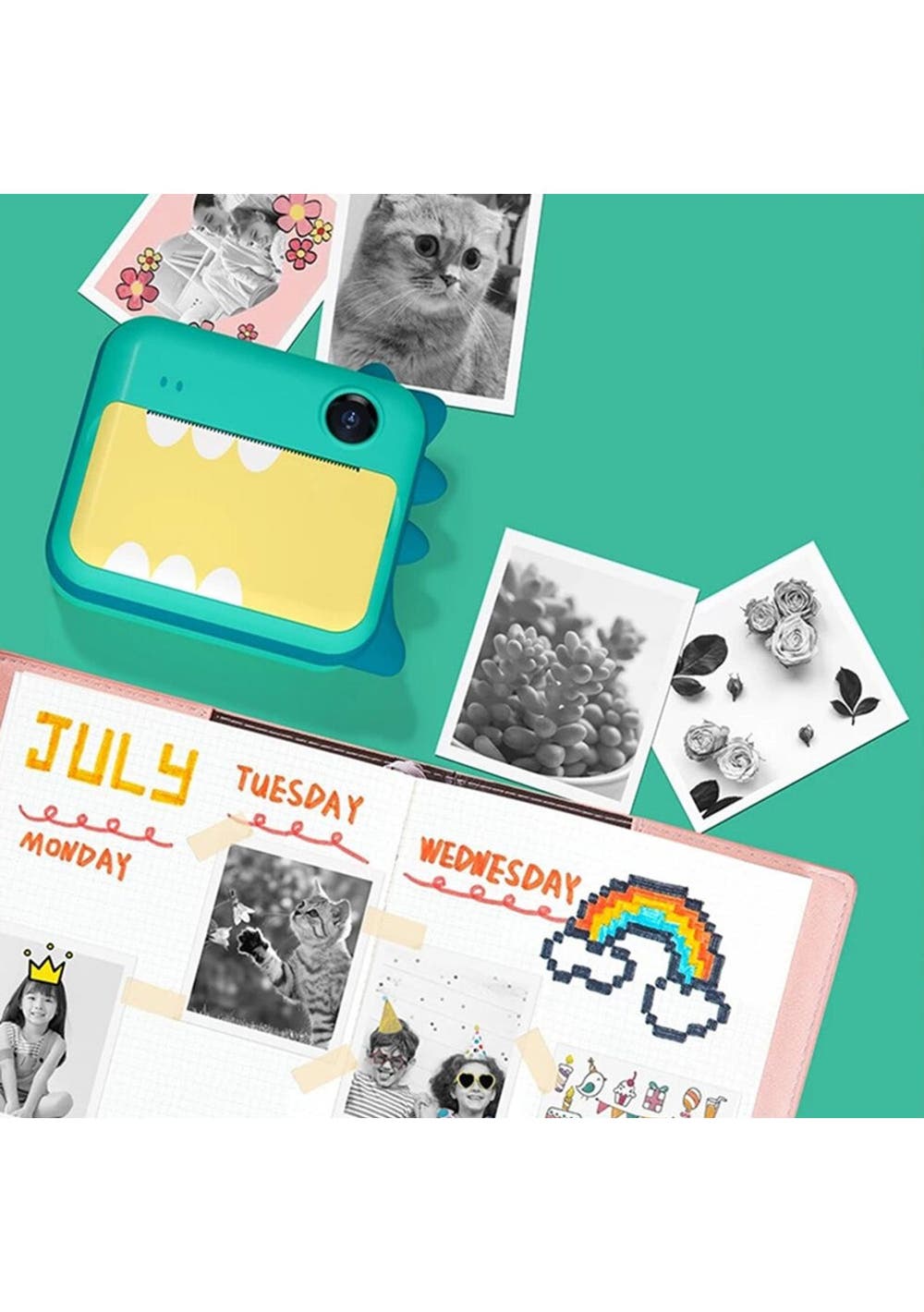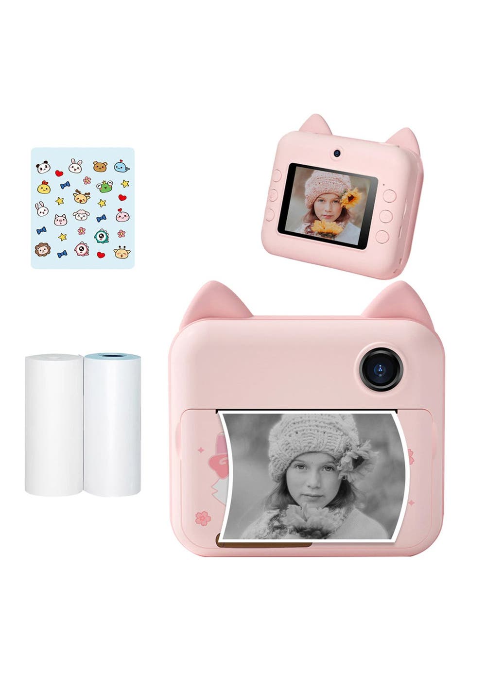 Product Description: This instant camera for kids uses thermal printing which requires zero ink. Just put the printing paper included in the kit into the camera and kids can start to take photos and print them. It takes around 10 seconds to print a photo.This kid s instant camera is equipped with a 1500mah rechargeable battery which allows kids to take photos or videos continuously for 1-3 hours. It can accommodate up to 32GB of memory card which can store up to 2,600 photos.This instant print camera has filters and 13 cartoon frames and a selfie function to provide more fun to kids. It s a great gift option for kids for their birthday, Christmas, and other holidays.Photos and videos in the camera can be sent to a cellphone by the APP BiBi Cam and also can be connected to the PC with a USB cable to transfer photos and videos.?Product Specification:Variant: Cat, DinosaurMaterial: ABSSize: 90x80x40mmWeight: 175gFunctions: Children CameraPixels: 12 Million Pixels front and rear dual camerasPhoto format: JPGVideo resolution: support up to 1080PSupport Paper: Thermal Paper and Thermal StickersPrinting Resolution: 200 DPIPrinting Method: Thermal Black and WhiteScreen Size: 2.4 in IPS ScreenUsage Time: 1-3 hoursCharging Time: 4-5 hoursBattery Capacity: 1500 mAhInput Voltage: 5V 1A?Package Inclusion:Kit:1 * Camera1 * USB Cable2 * Rolls of Paper?Paper only:3 * Rolls of Paper ?
