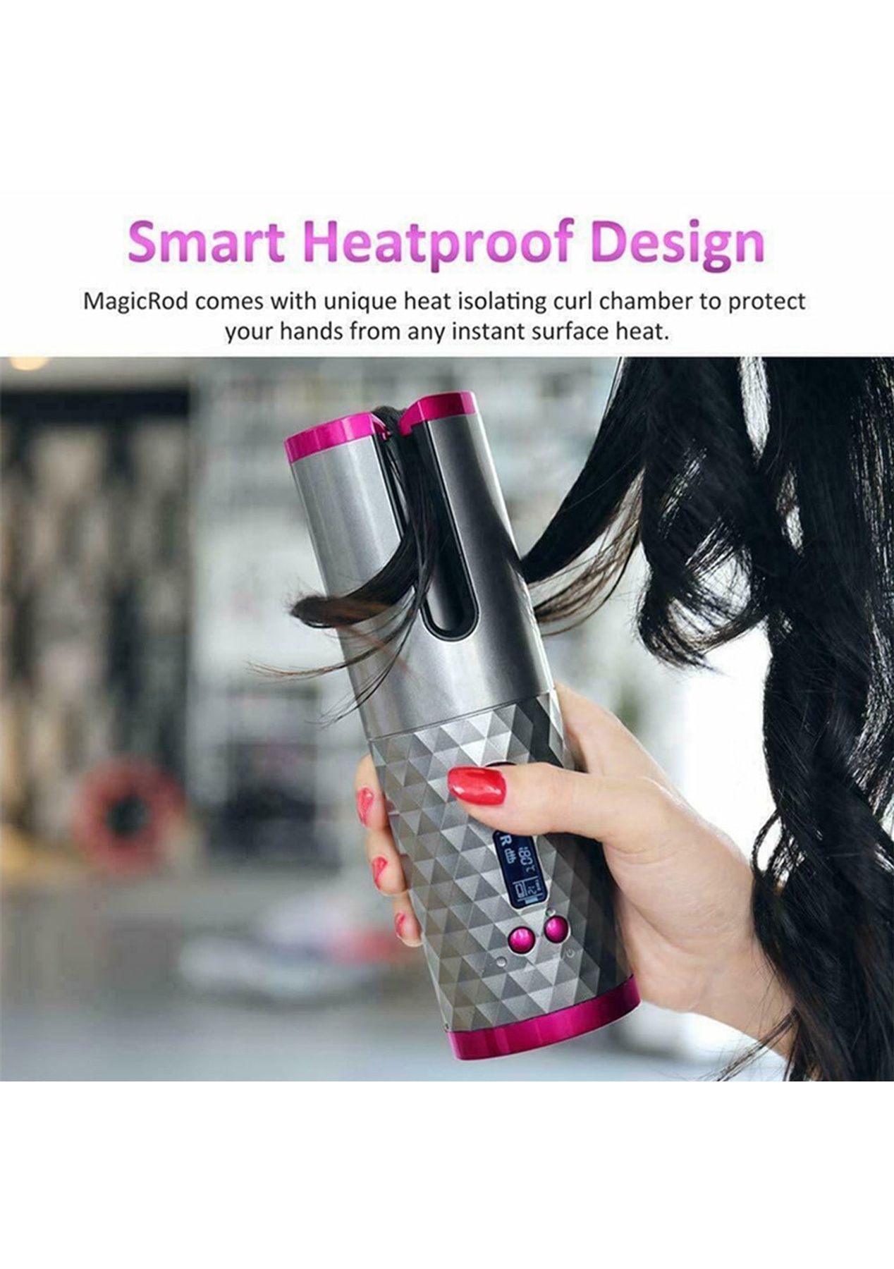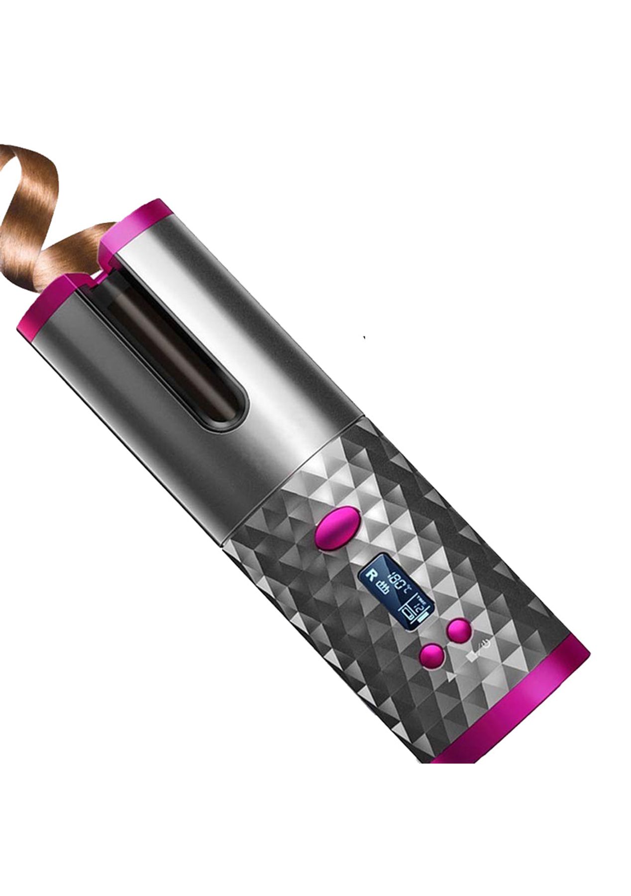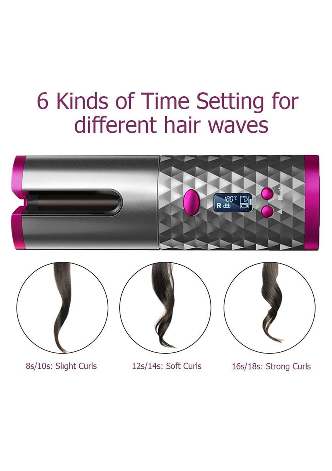 Product Description: FUTURISTIC DESIGN-?This product works for about 60mins if fully charged. This product is also Cord-free and is an automated hair curler, instantly create beautiful curls or waves.6 TEMPERATURE OPTIONS & TIMERS-?This automatic hair curler has temperature selections from 300F-390F and 8-18s auto curling timers allowing it to form perfect loose or tight curls easilyCERAMIC BARREL WITHOUT DAMAGE-?This product has a 3/4in professional ceramic barrel that protects your hands and skin from scalding, making it easy and safe to use.HD LCD DISPLAY AND AUTO OFF-?Clear temperature, direction, timer, and battery level displays, it automatically turns off after 10mins of no operationsUSB RECHARGEABLE & POWER BANK-?Built-in 5000mAh lithium-ion battery enables super convenient cordless use. This product also doubles as a power bank. Does your phone run out of battery? Worry not! You can definitely use this curler as an emergency power source.FAST HEATING-?This product is made with a professional tourmaline ceramic barrel; it quickly heats up and gives you a smooth, massive shine and bouncy curls without all the damage.?Product Specifications:Battery voltage: 3.7VBattery watt-hour: 9.25WhBattery Capacity: 5000mAhApproximate charging time: 3.5 hoursContinuous using time: approximately 40-60 minutesTemperature gear: 6 (150C 160C 170C 180C 190C 200C)USB length: 58 ¡À 5cmItem dimensions: 19cm x 5.6cm x 4.9cm?Package Inclusion:1 x Curling Iron1 x USB Charging Cable1 x Manual