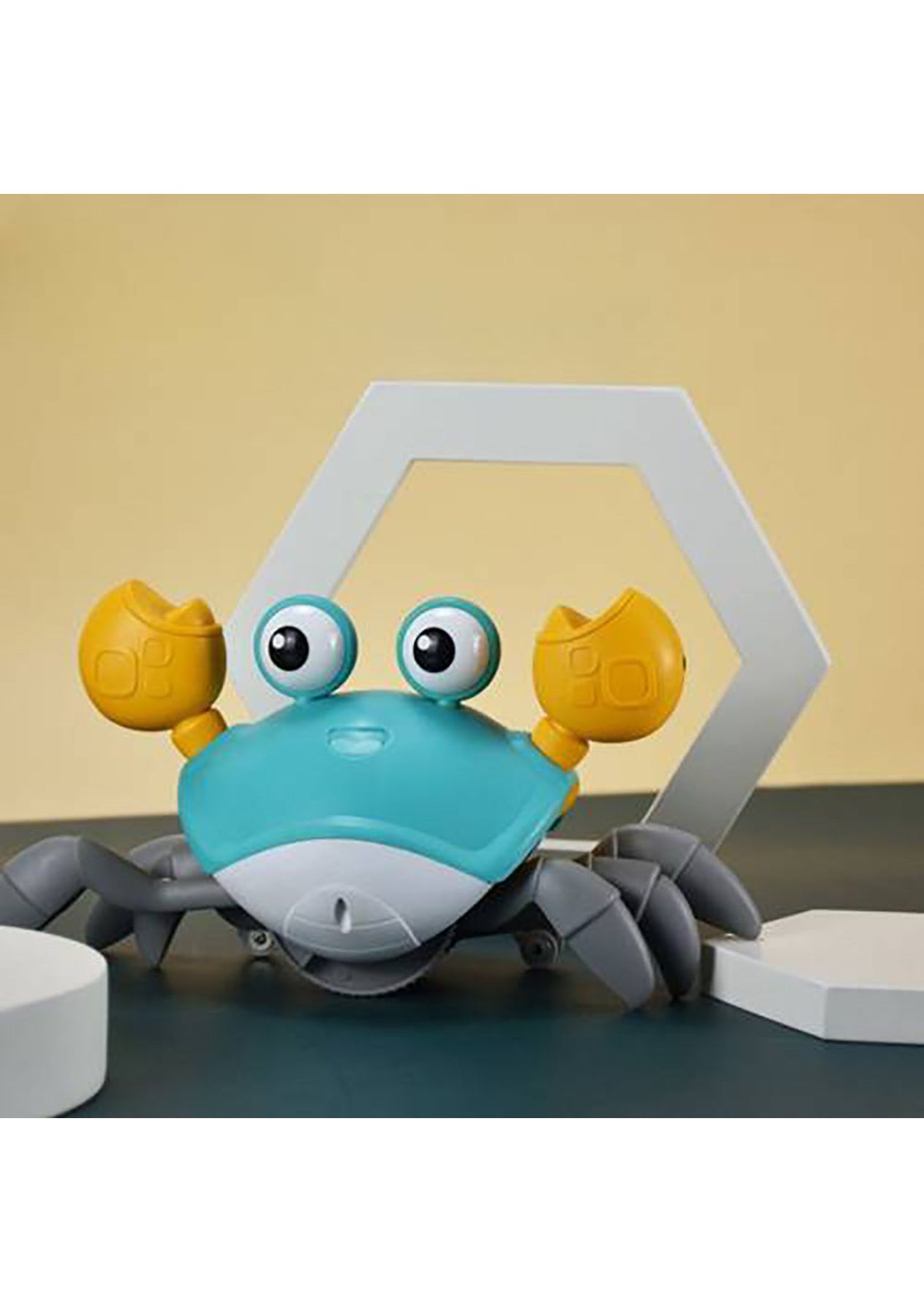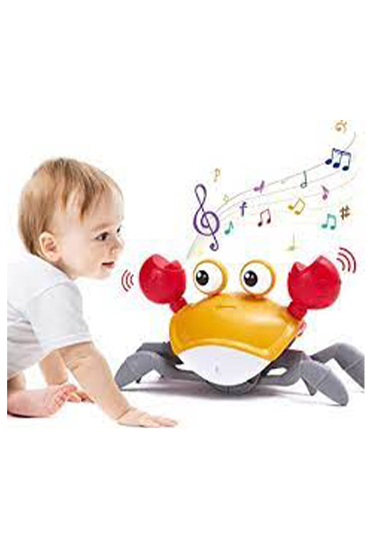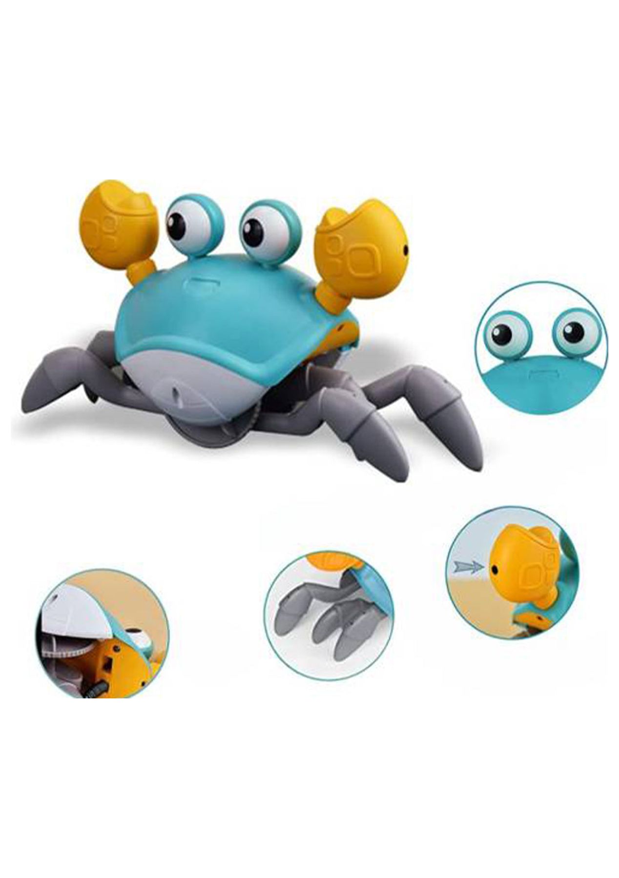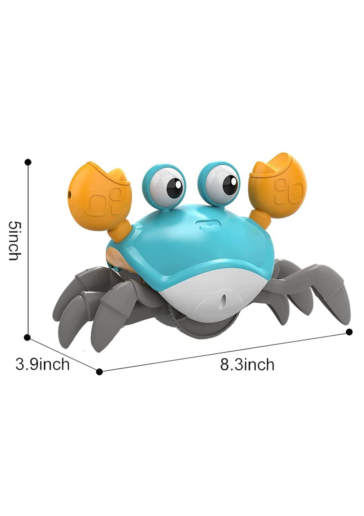 Product Description: This baby multisensory toy has cute crab-shaped and bright colors that will fascinate and intrigue kids easily. Children run with the crab, which is useful for developing their motor skills and hand-eye coordination.This clever crab can detect things in front of it through in-built sensors, and then automatically avoid obstacles. Note: that the sensors are on both claws, sensing and automatically dodging only on the sides of the crab claws.?This crab crawling toy is made of eco-friendly, non-toxic, lightweight ABS material with good drop resistance, no sharp edges or small parts and 100% kid-safe.?This electric toy recharges via a USB cable (included) and works out of the box. No battery hassles. In addition, baby crab walking toy that activates by a simple touch.?The crawling crab with LED light effects and cheerful music, making the children chase it happily. It is a great birthday Christmas present for toddlers babies. Product Specification:Color: Blue, OrangeWeight: 550gMaterial: PlasticSize: 8.3 x 3.9 x 5 inchesPower Supply: USB RechargeableCharging Time: 2hWorking Time: 20-30minsFunction: Crawling Crab Sensory Toy?Package Inclusion:1 x Crawling Crab1 x USB Cable ? ?