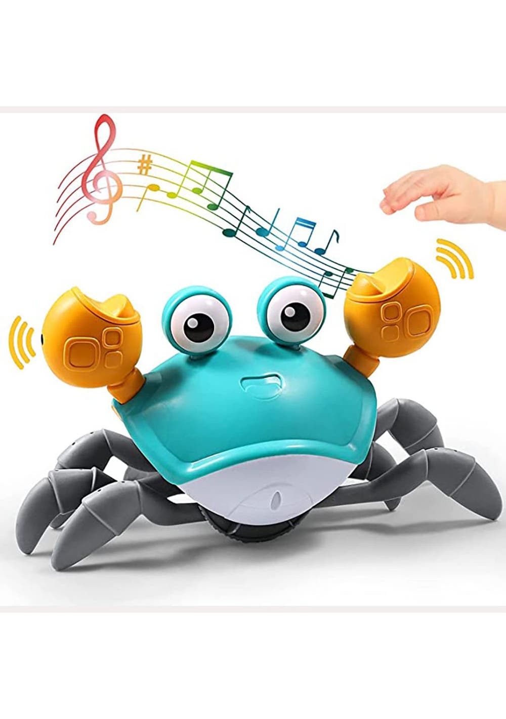 Product Description: This baby multisensory toy has cute crab-shaped and bright colors that will fascinate and intrigue kids easily. Children run with the crab, which is useful for developing their motor skills and hand-eye coordination.This clever crab can detect things in front of it through in-built sensors, and then automatically avoid obstacles. Note: that the sensors are on both claws, sensing and automatically dodging only on the sides of the crab claws.?This crab crawling toy is made of eco-friendly, non-toxic, lightweight ABS material with good drop resistance, no sharp edges or small parts and 100% kid-safe.?This electric toy recharges via a USB cable (included) and works out of the box. No battery hassles. In addition, baby crab walking toy that activates by a simple touch.?The crawling crab with LED light effects and cheerful music, making the children chase it happily. It is a great birthday Christmas present for toddlers babies. Product Specification:Color: Blue, OrangeWeight: 550gMaterial: PlasticSize: 8.3 x 3.9 x 5 inchesPower Supply: USB RechargeableCharging Time: 2hWorking Time: 20-30minsFunction: Crawling Crab Sensory Toy?Package Inclusion:1 x Crawling Crab1 x USB Cable ? ?