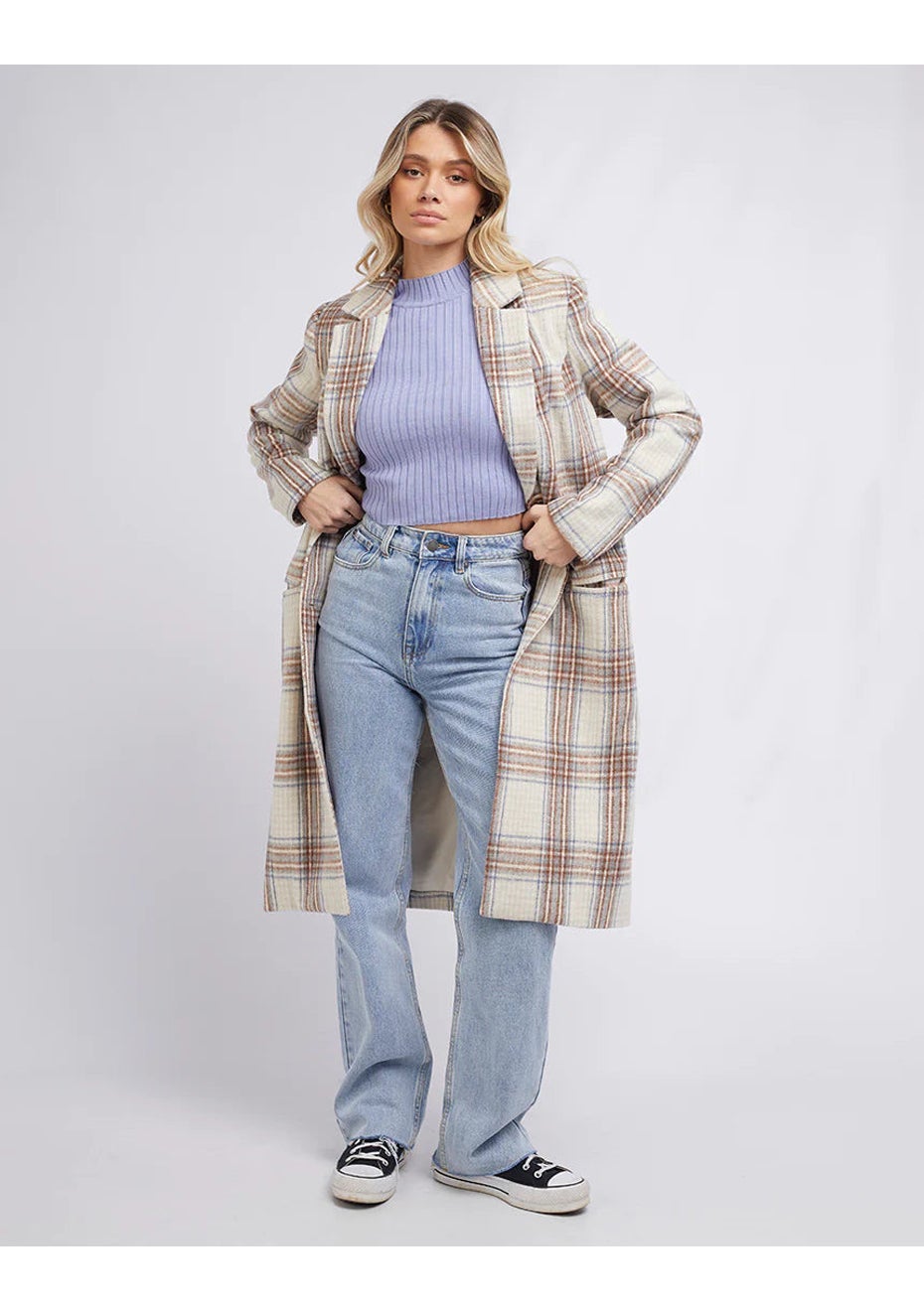 Wool, poly blend Collar neckline with notched lapel Long sleeve Button up front closure Front welt pockets All over yarn dyed check Mid length Outer: 100% Polyurethane Lining: 95% Polyester, 5% Elastane