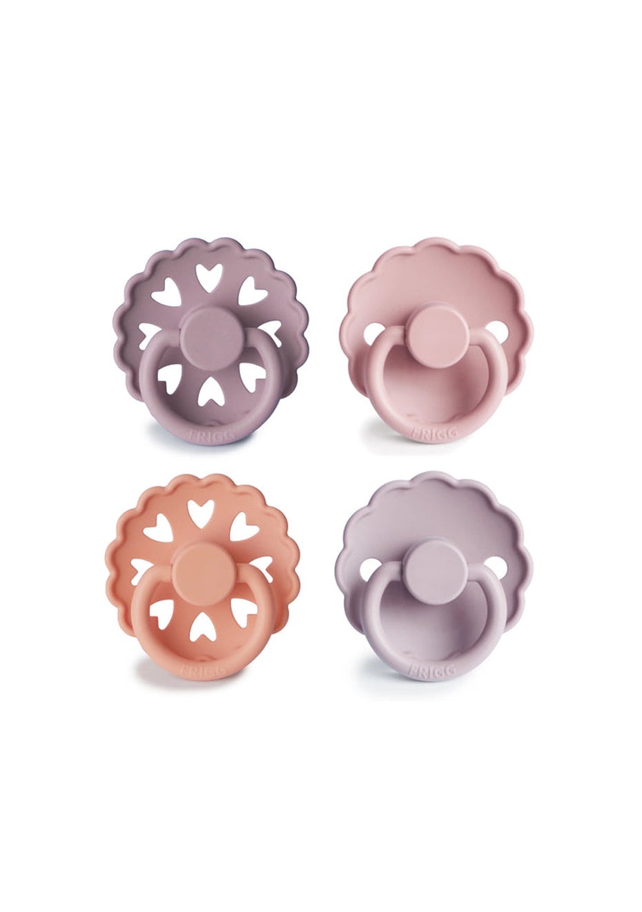 All the pacifiers in FRIGG 4-packs are round pacifiers with a round nipple shape. The round pacifier resembles a mother’s breast in both shape and material. The explanation for this is that when the child is about to breastfeed, the tongue rolls up around the nipple and creates a vacuum, which causes the milk to flow. When the child sucks on a round pacifier, it rolls its tongue around it the same way. The round shape is recommended by the paediatric chiropractors and maternity hospitals in Denmark. Introducing FRIGG ‘Sunset Bliss’ 4-Pack: Say hello to FRIGG’s 4-Pack ‘Sunset Bliss’, a package consisting of 4 round pacifiers in colours that capture the essence of winter’s magical moments. Choose ‘Sunset Bliss’ for purity and elegance, with inspiration from a winter wonderland. FRIGG 4-pack Sunset Bliss contains 1 pc. FRIGG Daisy round pacifier in the colour: Baby Pink 1 pc. FRIGG Daisy round pacifier in the colour: Soft Lilac 1 pc. FRIGG Fairytale round pacifier in the colour: The Little Mermaid (Twilight Mauve) 1 pc. FRIGG Fairytale round pacifier in the colour: The Princess and the Pea (Pretty in Peach) 1 pc. FRIGG 4-Pack Box 1 pc. FRIGG 4-Pack Inner box FRIGG pacifier details 100% designed in Denmark 100% manufactured in Denmark For safety reasons each FRIGG pacifier undergoes a diverse range of tests that simulate the stress a pacifier gets exposed to With a click-lock® system Shield materials: Polypropylene (PP) Safety standard: EN1400 + A2 test FRIGG latex nipple size details Nipple material: 100% natural rubber. Nipple measure: 27 mm - age 0 -6 months Nipple measure: 30 mm - age 6-18 months Care instructions for FRIGG pacifiers: Place the pacifier in a bowl and pour it with boiling water. Let it soak for 3-5 minutes. Do not submerge for longer than 5 minutes. Remove and place on a flat surface to air dry. Do not use sterilizers, microwaves, or dishwashers. For optimal safety and hygiene, we recommend discarding the pacifier after 1-2 months of consistent use. Always check the pacifier before use, and discard at first signs of damage or wear.