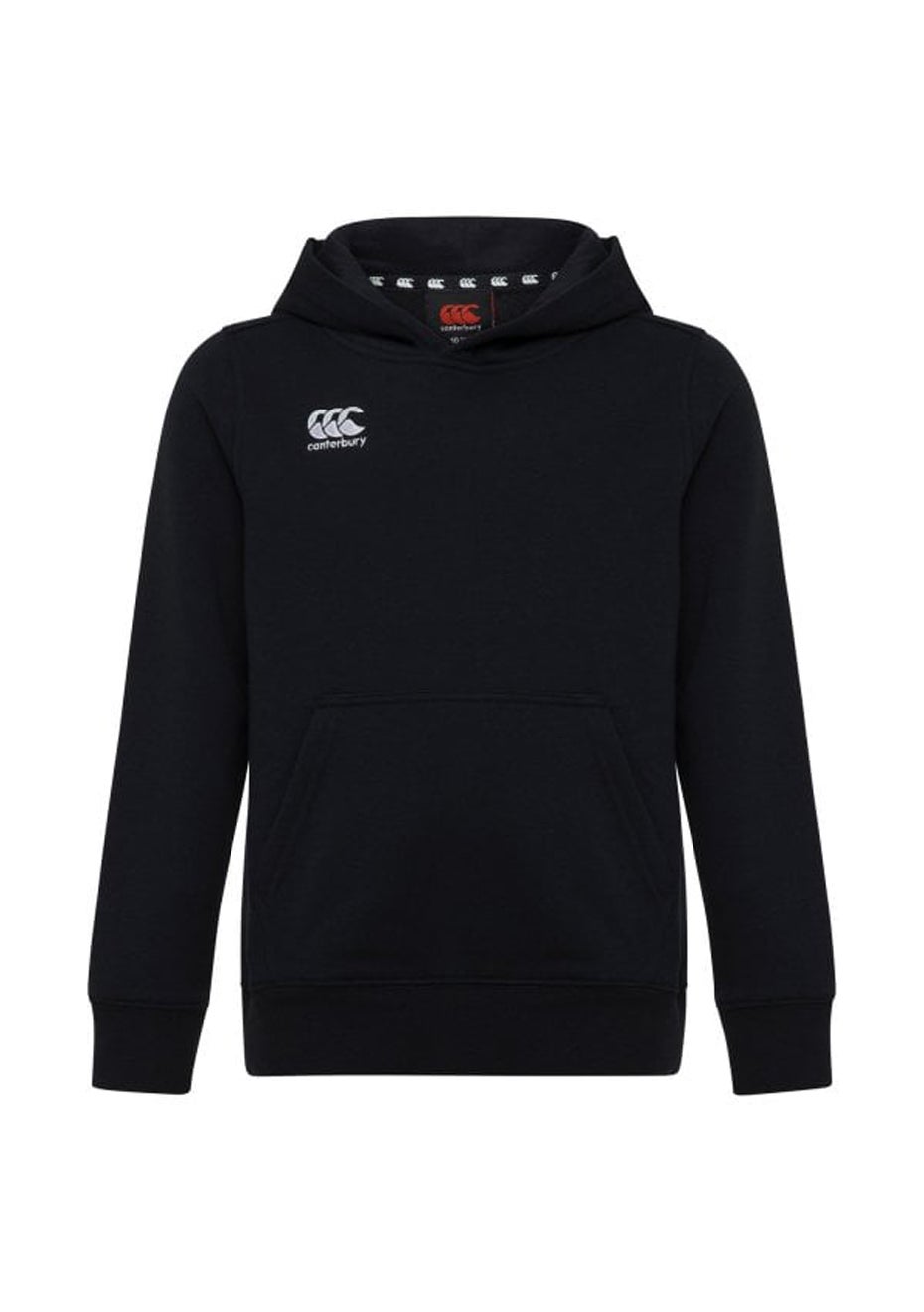 Over head hoodie with lined hood. Featuring lower front kangaroo pockets, rib knit hem band and cuffs. Canterbury embroidery at right chest in white. NOTE: No drawcord on kids style. SLIM FIT - MAIN 55% Cotton 45% Polyester Brushed Back Fleece 300gsm - HOOD LINER 65% Polyester 35% Cotton Single Jersey 135gsm