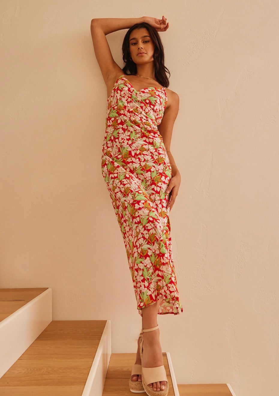 Flo & Frankie - Rapture Red Tropical Strappy Mock Wrap Midi Dress
