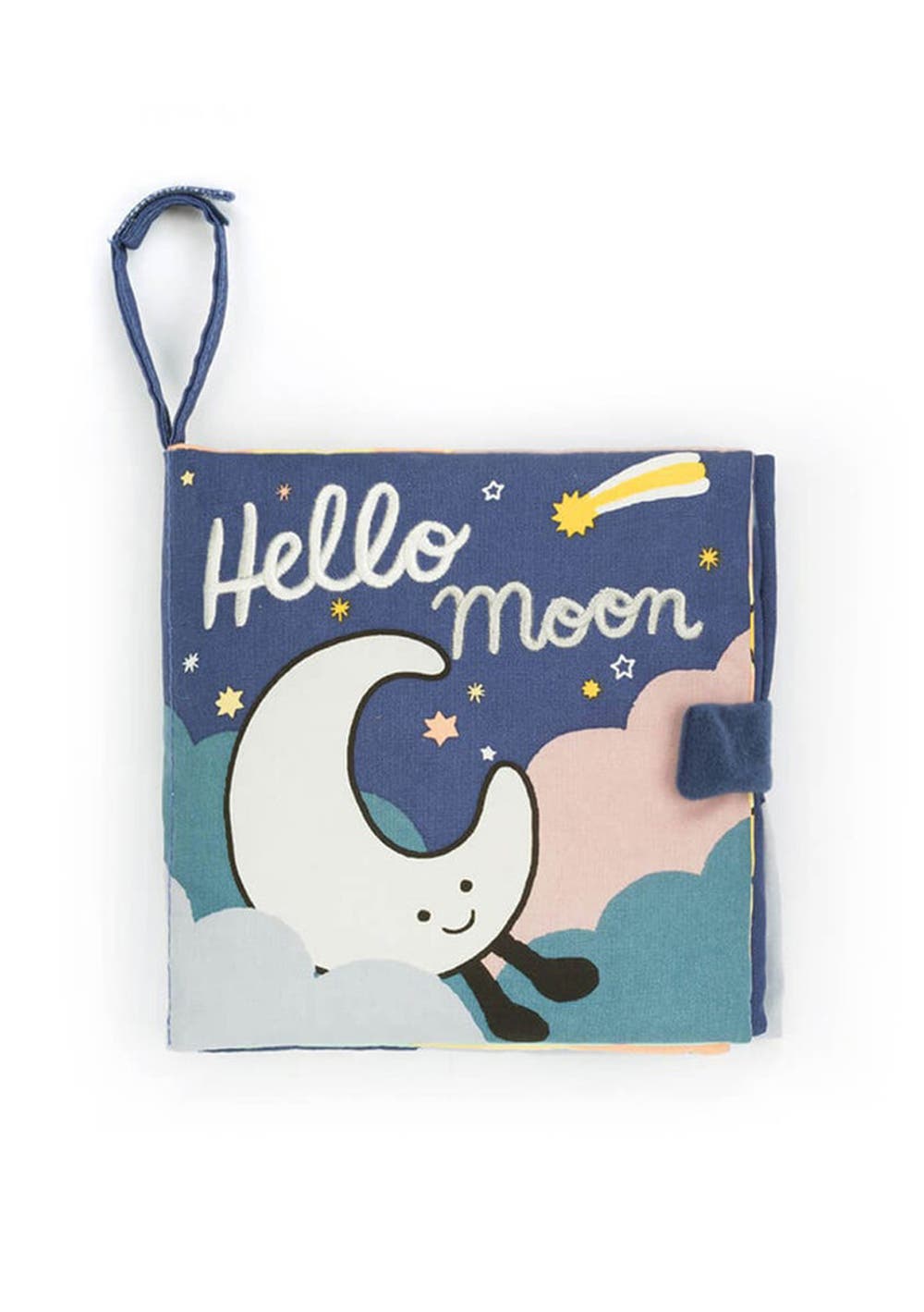 A charming interactive fabric book featuring Amuseables Moon with bold, colourful illustrations. Printed on cotton, with crinkle pages, applique texture detail and a mirror on the last page to delight young babies. Fasten this book to the buggy or cot, and let Baby explore the night sky!