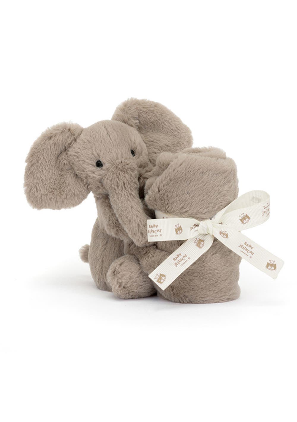 Smudge Elephant Soother is divinely soft in a sumptuous warm grey fur. With big petal ears, stitched eyes and squashy paws holding on tight to a square shaped un-stuffed soother. An exquisite gift for newborns, presented in a satin sheen gift box with gold foil detail and matching gift card.