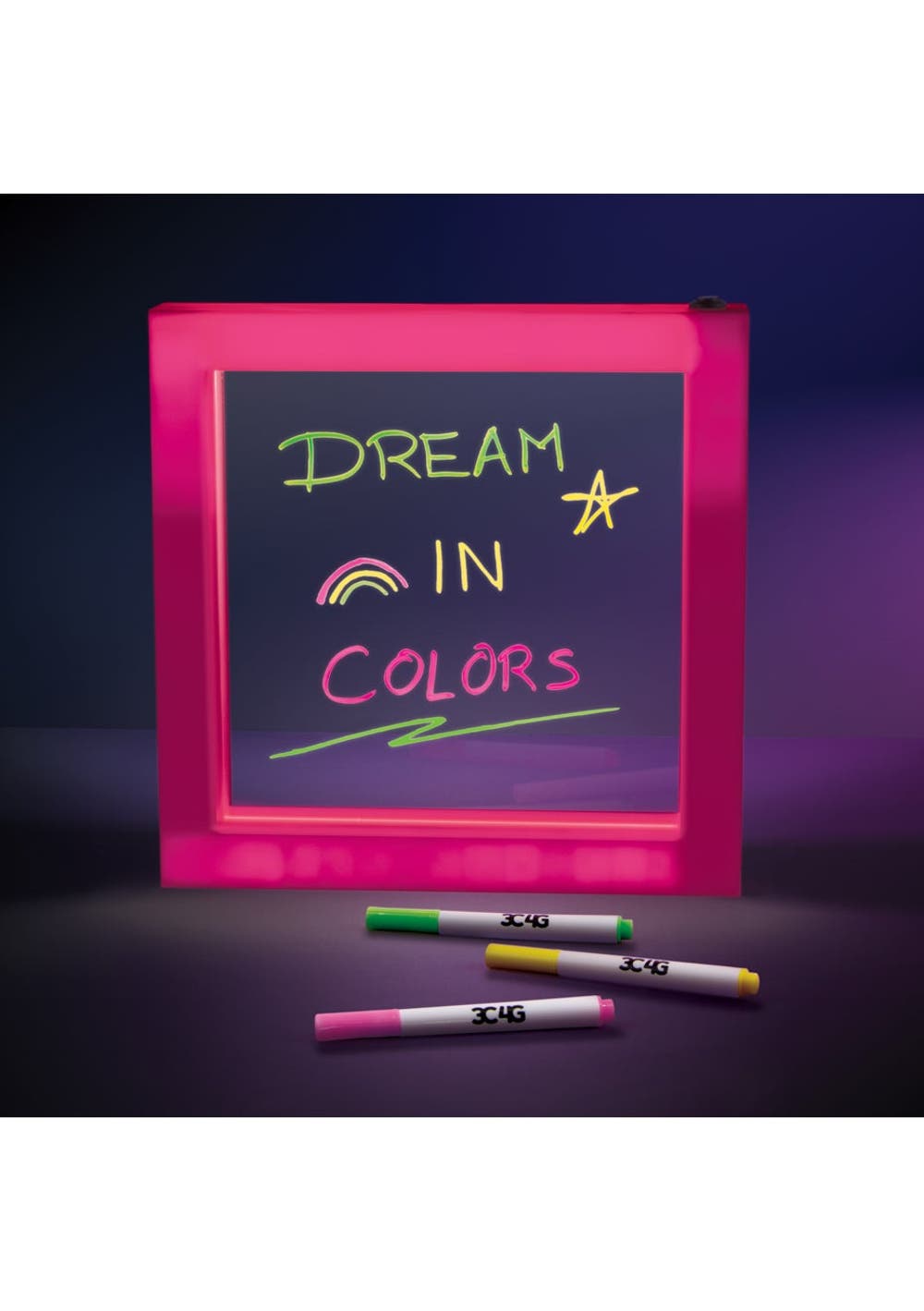Express your thoughts on this great light up message board. Complete with 3 colourful neon markers to create dazzling neon messages that glow! Create your message, and flip the switch to “on” and the bright pink frame and neon text emphasizes your thoughts. Kids will have a great time expressing themselves with this message board that lights up at the touch of a button! It makes a great piece of bedroom decor, and even comes with three markers for creating neon-bright messages and pictures.