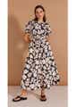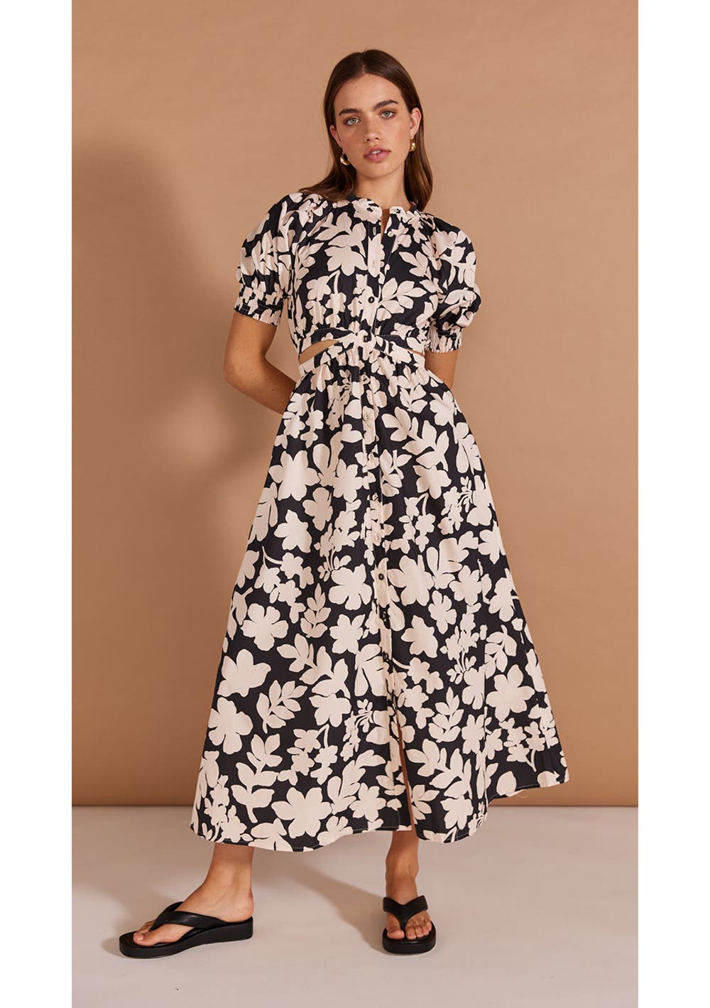 Cut-out cotton poplin midi dress in an exclusive black and beige floral print - Collarless V-neck opening - Centre-front button opening with self-covered buttons - Short puff sleeves with shirred elastic cuffs - Side cut outs at waist - Elastic waistband at back - Pockets - Designed in Sydney, Australia Composition: 100% Cotton - Handwash with mild soap in cold water - Wash separately - Do not bleach/soak/wring or tumble dry - Dry flat in the shade - Cool iron if needed on the reverse side