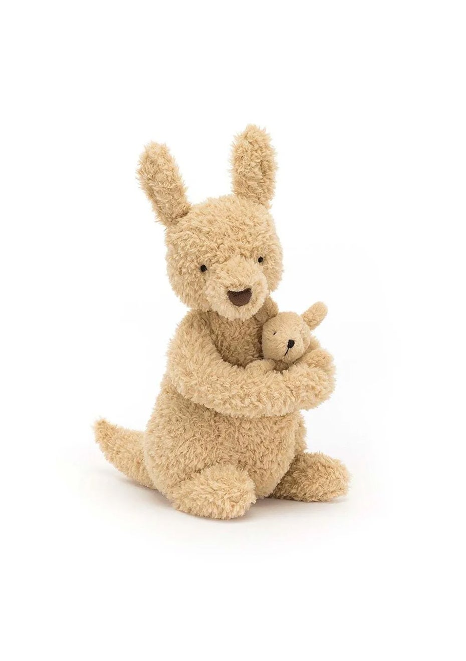 Huddles Kangaroo has brought her baby to meet you! This fleecy oatmeal kangaroo hugs the tiny joey in her pouch. Baby can hop out for a bounce about, or snuggle down for a rest. Mama has a black fur nose and her little one has a stitch nose instead, but both have adorable leaf-fold ears.