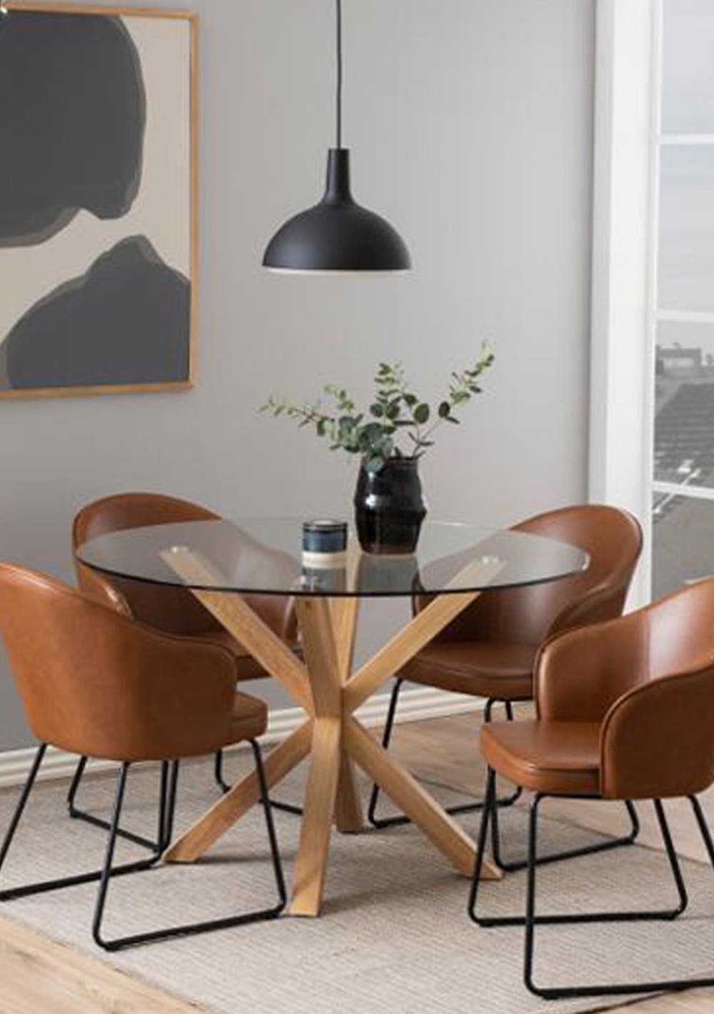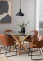 A dining table that offers generous space for pleasant dining. With a clear glass tabletop and a base with an oak look, the table has a contemporary appeal. Thanks to the easy-care materials, the dining table is a preferred supplement to any home. And notice how the cross base showcases angular legs. A modern and powerful table – here you go.