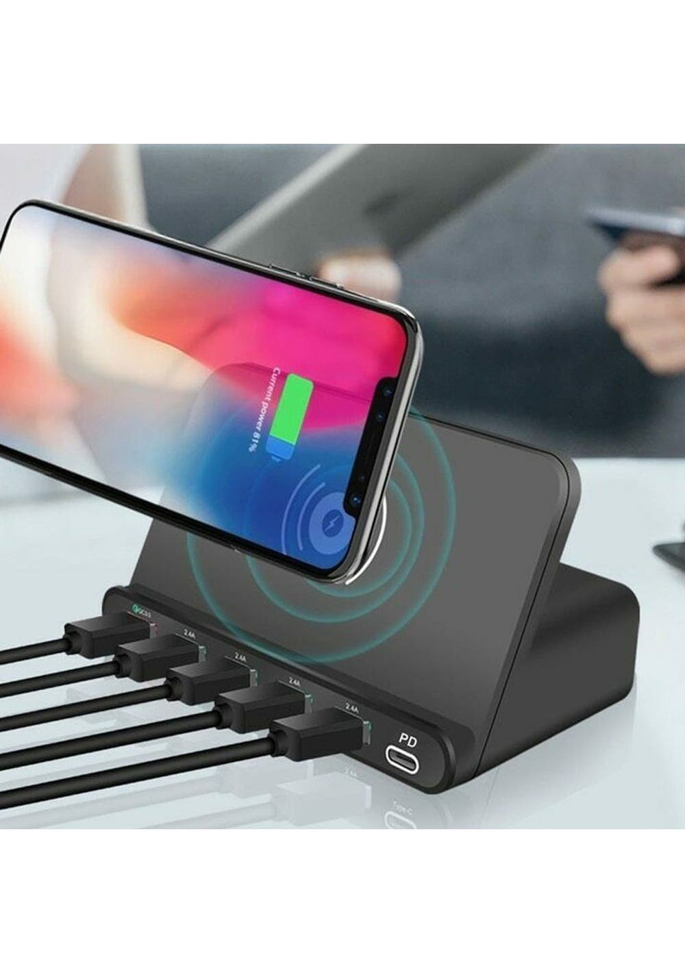 Product Description: This?10W?Wireless charger and 6 charging ports were built in this multi charging station to fulfill your multi-devices charging needs .built-in Quick Charge 3.0 and Type-c port. Using this?wireless charging stand helps you stay organized.It has?6 charging ports, four 2.4V USB charging ports, one Type-c charging port, and one quick charge 3.0 fast-charging port.5V/3A high-power output Type-c port, wireless charging maximum output power can reach 5W.?The wireless charger stand ensures the safety of your device during the entire charging process,?supports Qualcomm Quick 3.0 Charge.This charging station offers the perfect combination of a power strip and a wireless charging stand.?It is a compact and portable wireless charger, ideal for home or office. This wireless charger allows you to charge horizontally not support vertical charging. Great for using Face ID, viewing popup messages, or watching videos while charging.It is designed with two coils that are made of high-purity copper, wireless charger can identify your phone sensitively and support phone case within?5mm which?is the best wireless charging distance (Please note that metal and magnetic attachments or credit cards may damage your phone)?Product Specification:Color:?Black, WhiteMaterial:?PCSize:?133 * 80 * 70 mmWeight:?336gFunctions:?Multi-USB Wireless ChargerPlug: AU, EU, UK, USInput: AC 100-240v 50/60HzTotal power output: 5V--12A(MAX) 60WQC3.0 output: 5V-3A, 9V-2A, 12V1.5A 18WPD USB-c output: 5V/ 3A 9V/2A 12/1.5A 18WWireless fast charging output power: 10W(MAX)Normal USB output: 4xUSB 2.4A?Package Inclusion:1 * Wireless Charger1 * Power Plug (AU, EU, UK, US)1 * User Manual