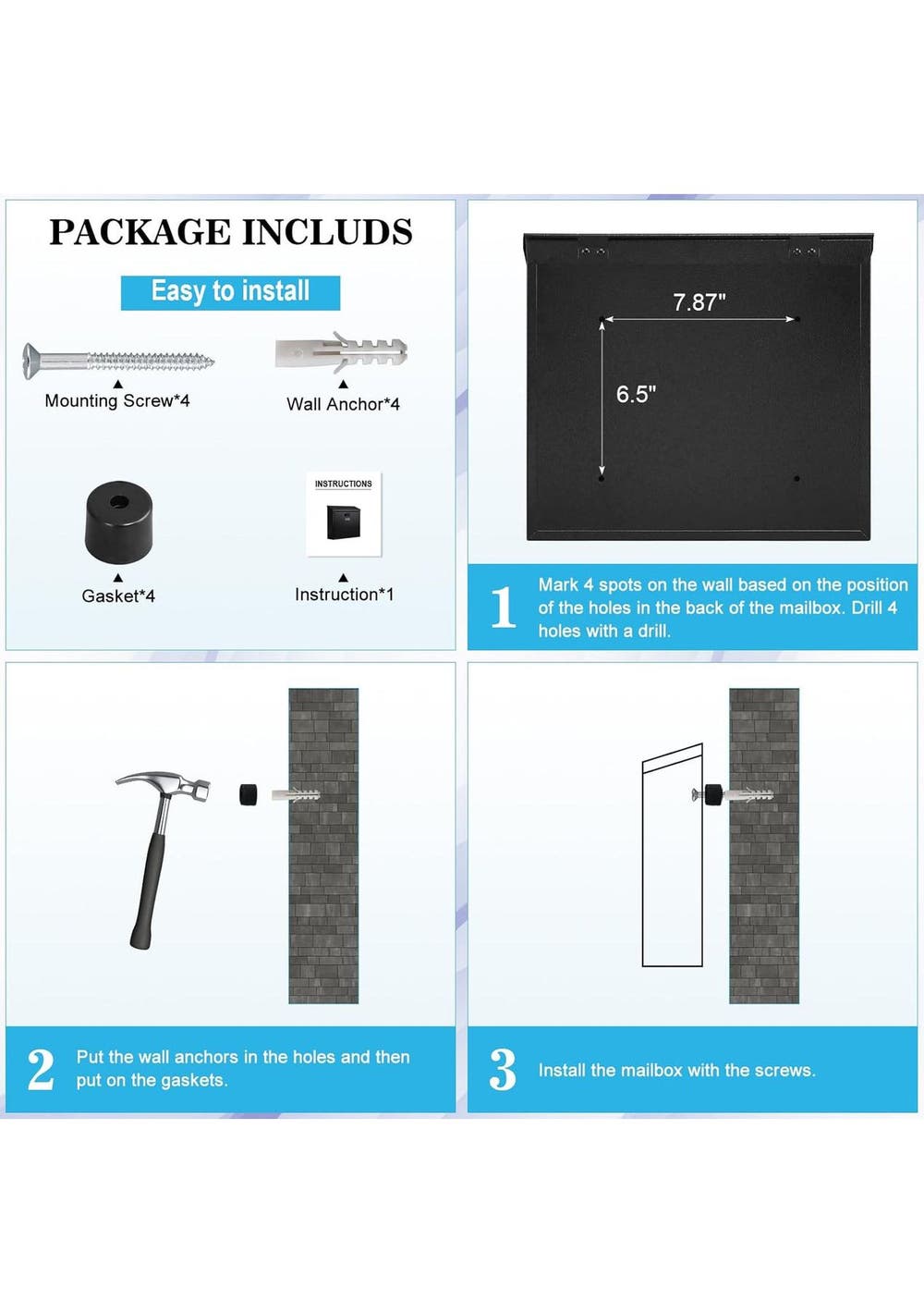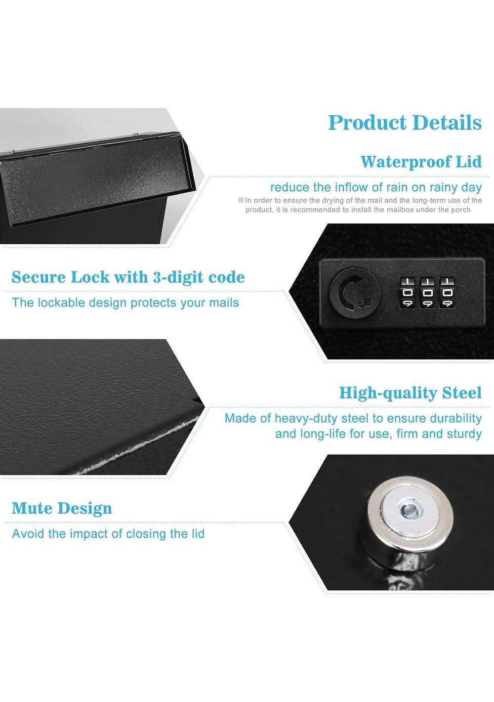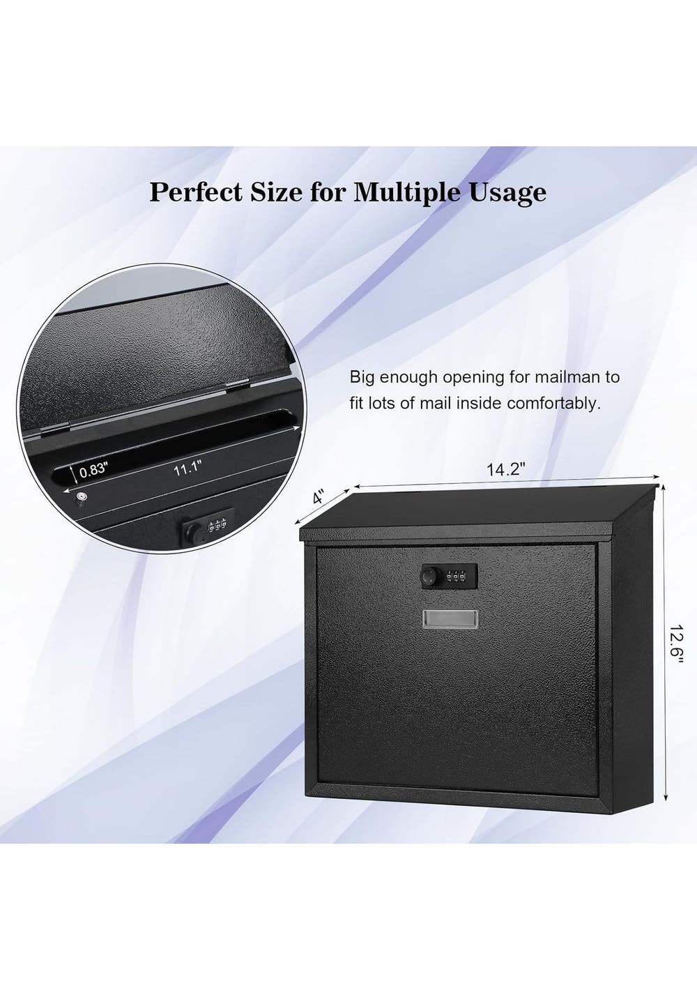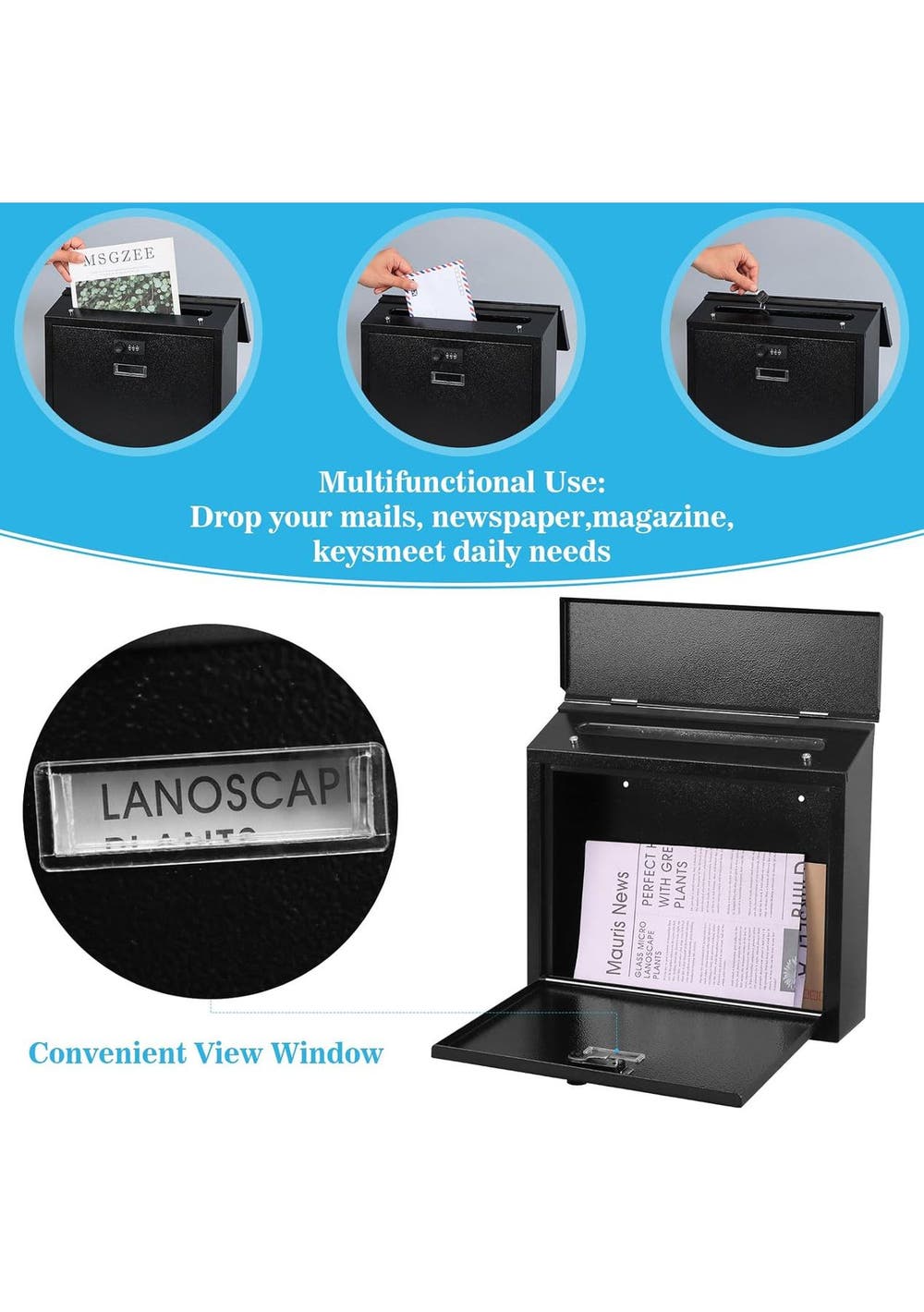 Wall Mounted Mailbox Combination Lock Ultimate Security for Your MailProtect your important mail effortlessly with our Wall-Mounted Secure Mailbox. Designed to provide high-security protection and safety storage, this mailbox is made of solid, sturdy metal that withstands heavy rain with its powder-coated finish. It's both beautiful and modern, ensuring your home stays stylish while keeping your deliveries secure. Convenient Access AnytimeExperience hassle-free mail checking with the convenient view window of our Wall Mounted Mailbox Combination Lock. The independent combination lock adds an extra layer of security while offering easy access to your mail, notes, votes, or money. Easy installation is guaranteed with pre-drilled holes and included mounting hardware, allowing you to set it up quickly and effortlessly. Durability Meets FunctionalityOur Wall-Mounted Mailbox with Code Lock is built to endure harsh weather conditions, ensuring durability and longevity. With a beautiful spray model or baking varnish finish, this mailbox is not only functional but also enhances your outdoor aesthetic. Enjoy our all-weather service, and trust that your mail is in safe hands. Specifications:Locking mechanism: 3-number combination lockDimensions: 360 x 320 x 100mmInstallation: Pre-drilled holes, mounting screws, and wall anchor includedMaterial: Solid and sturdy metal Package included:1 x Mail Box1 x Manual