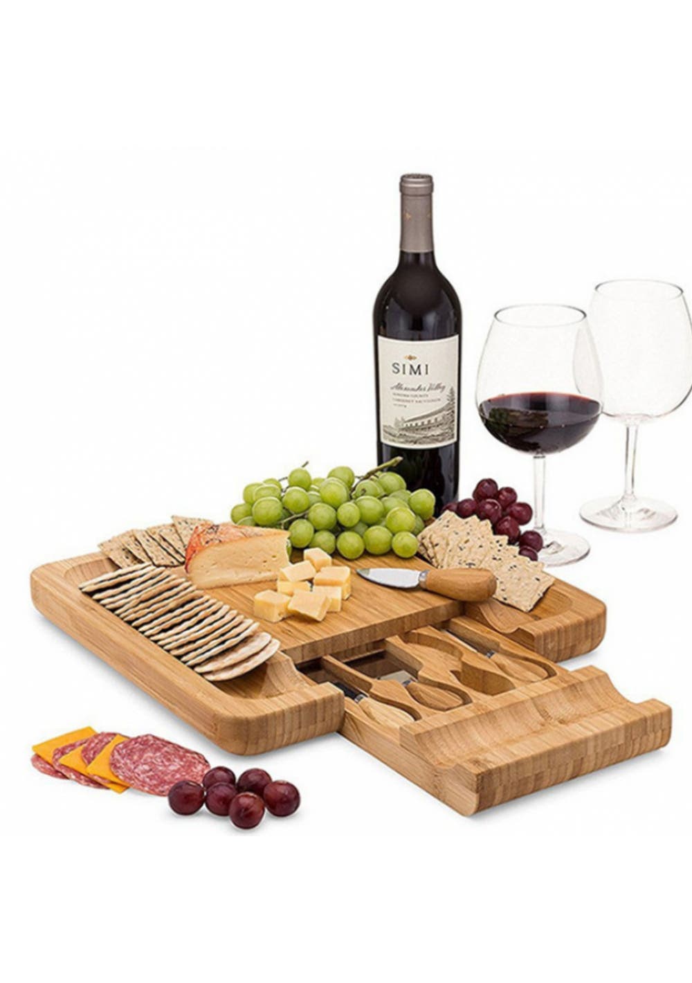 INCLUDED: Our cheese board sets come with 4 stainless steel knives and a detachable cutlery drawer. The included tableware will help you create gourmet meals for your family and the drawer can be used to hold ingredients individually. You can share your food with your friends more easily.MEEING YOUR NEEDS: The generous size ensures that it can hold enough food to satisfy your friends and family. The delicate recesses around the perimeter can be used for cheese, crackers, meat, fruit and nuts. A set of four beautiful stainless steel knives will meet your various needs for chopping and eating.EASY TO CLEAN: Smooth non-stick surface and the latest waterproof technology ensure the product is durable and easy to clean. It is the first choice of tableware for family dining and the best serving board for entertaining guest!GREAT GIFTS: Exquisite appearance and practical functions make our cheese boards suitable for indoor and outdoor and many other life scenes. A great gift choice for friends, family and loved ones on housewarming, bridal shower, engagement, wedding, anniversary, retirement, birthday, Christmas, or Valentine's Day and other holidays!Specification:Product dimensions: 33 x 33 x 3.5cmWeight: 1KGMaterial: Wood