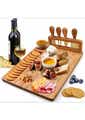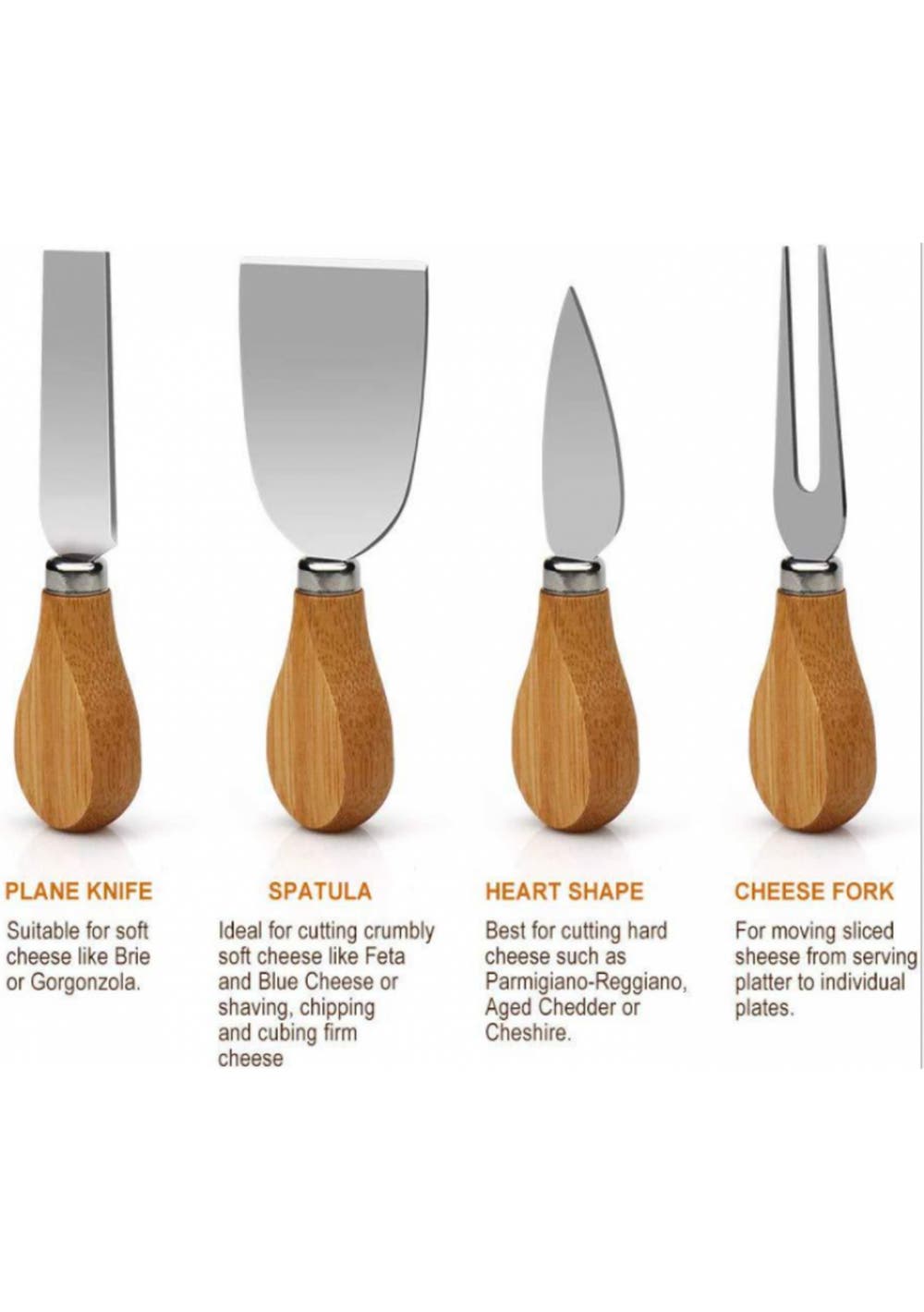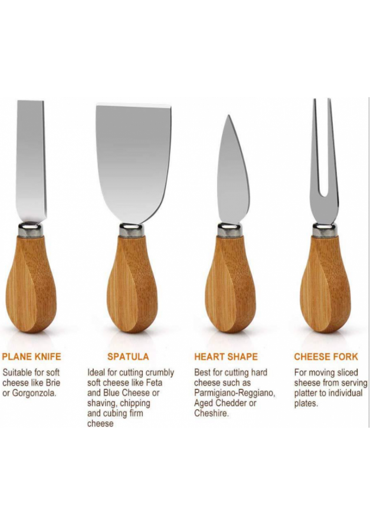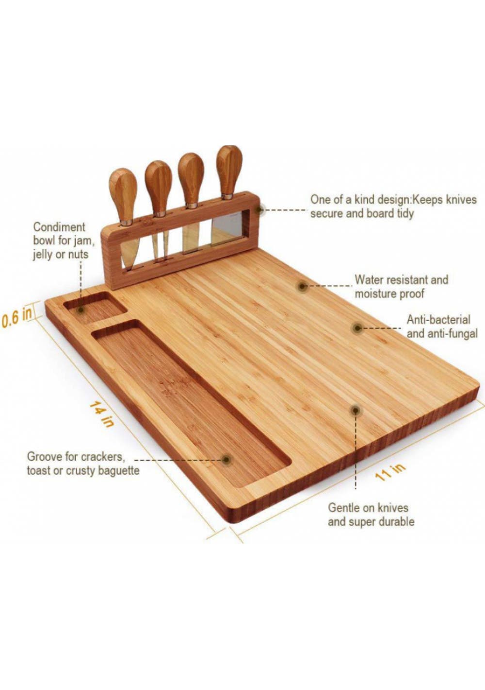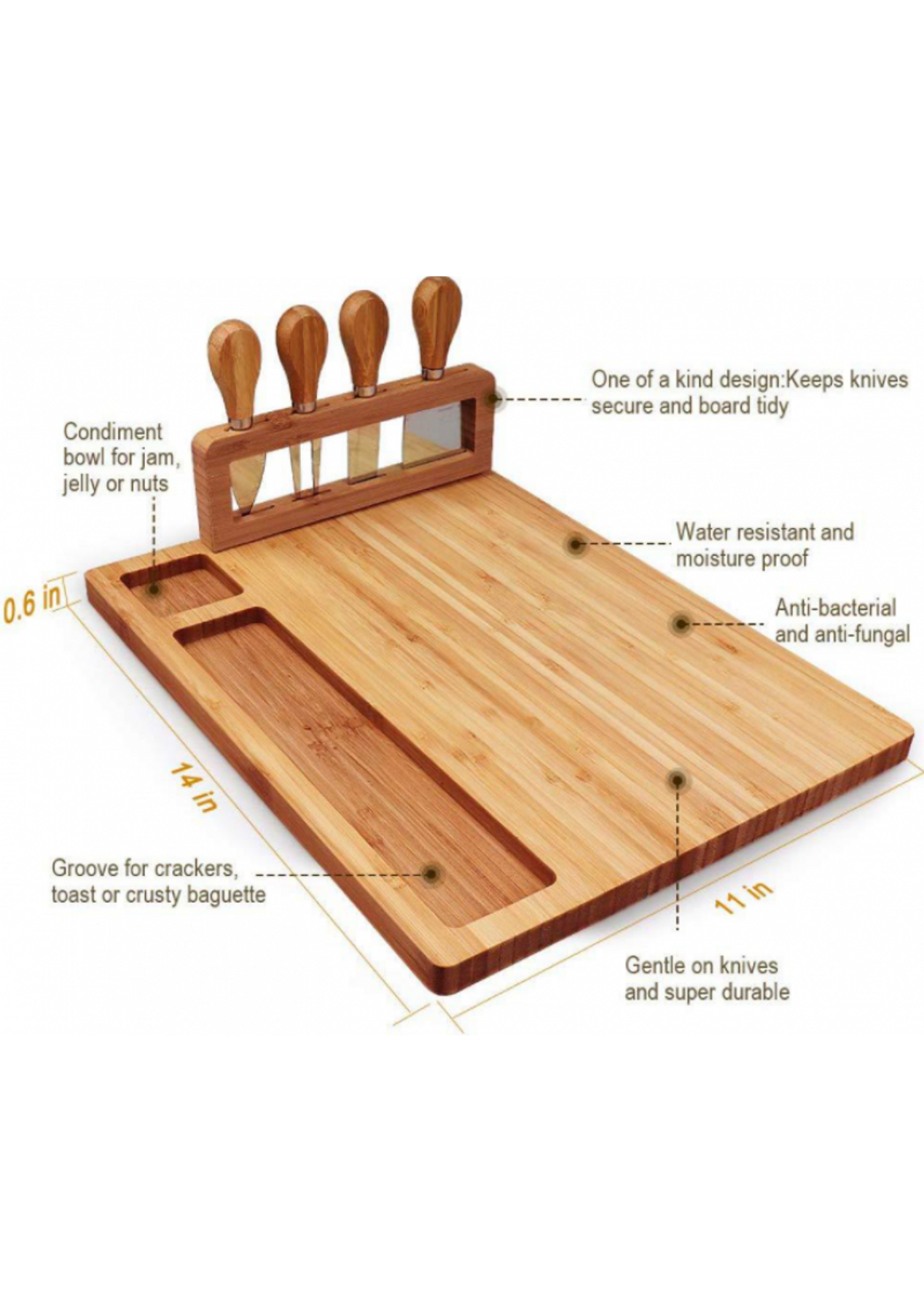 A GREAT GIFT IDEA FOR EVERYONE. This beautiful cheese board or charcuterie board set and knife set make for the perfect housewarming gift. What better way to celebrate the start of a new beginning than with a gift that brings people together. Beautifully packaged, this charcuterie board makes the perfect wedding gift or housewarming registry item.BEAUTIFULLY SUSTAINABLE. Meeting today's demand for premium goods, charcuterie boards are made of natural bamboo that's easy to clean and maintain. Carefully constructed with high-quality craftsmanship and ingenuity - this wood serving tray is sturdy and durable.DESIGNED WITH YOU IN MIND. The convenience of a 4-piece knife set storage built into the bamboo cheese board set makes hosting easy.PERFECT FOR EVERY OCCASION. Designed for versatile use, these bamboo cheese boards act as serving platters and trays for parties and are perfect for every occasion - from picnics to parties to making the perfect registry gift.Specification:Product dimensions: 36.3x28.4x3.81cmWeight: 1.5kgMaterial: Wood