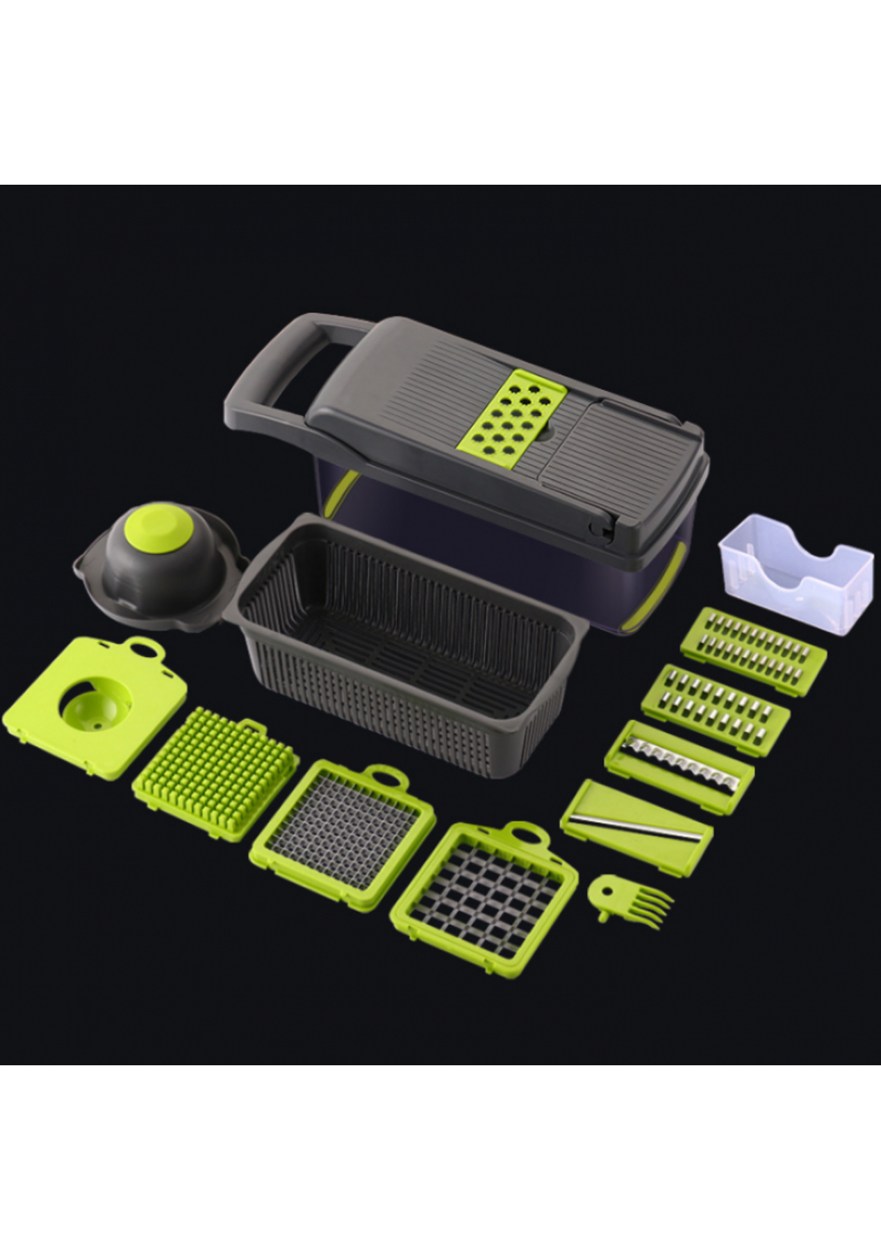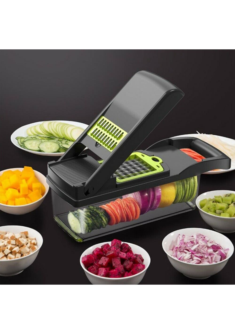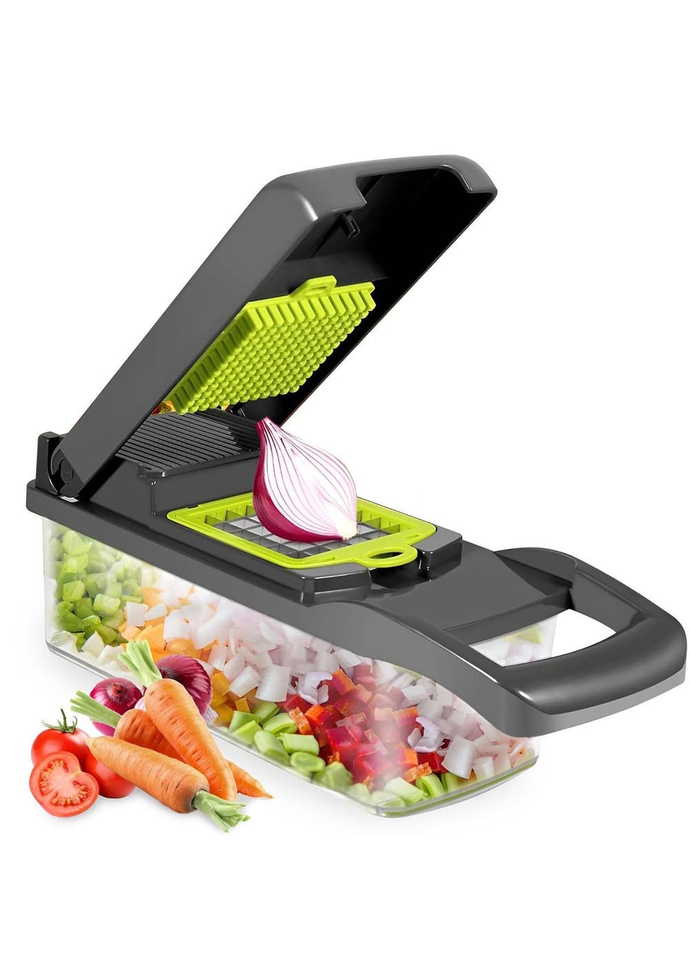 - Multifunction Kitchen Gadget: This practical kitchen gadget can shorten your prep time to just a few minutes. All vegetables can be prepared with this tool.- Highly Flexible Kitchen Tools: These flexible kitchen tools can chop onions, tomatoes and cabbage to make salsa, or cut potatoes into slices.- Improve Your Health: With this set of tools, you can escape the fast-food trap, cooking will be no longer messy. Enjoy healthy eating habits, this vegetable chopper tools will be your bestSpecification:Product dimensions: 32.2x11.3x11.3cmPackage size: 36x12x12cmWeight: 830gMaterial: PlasticColour: Grey