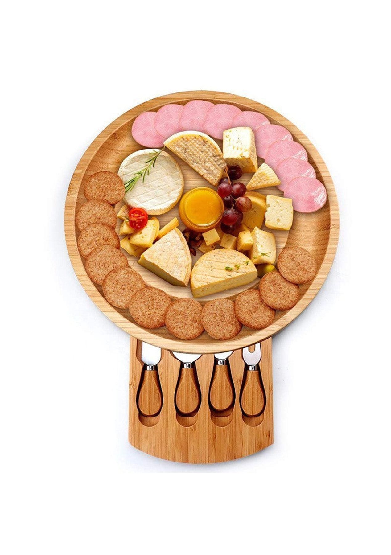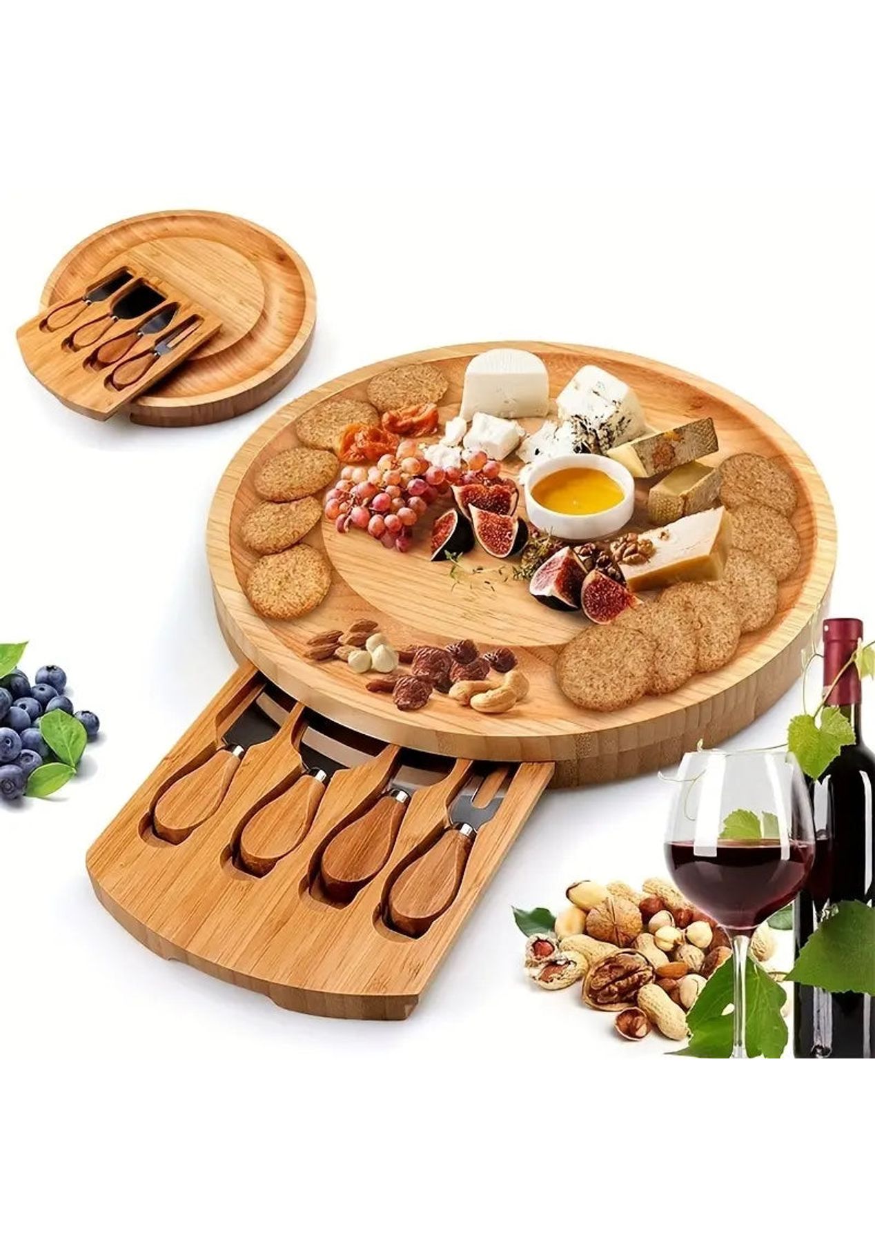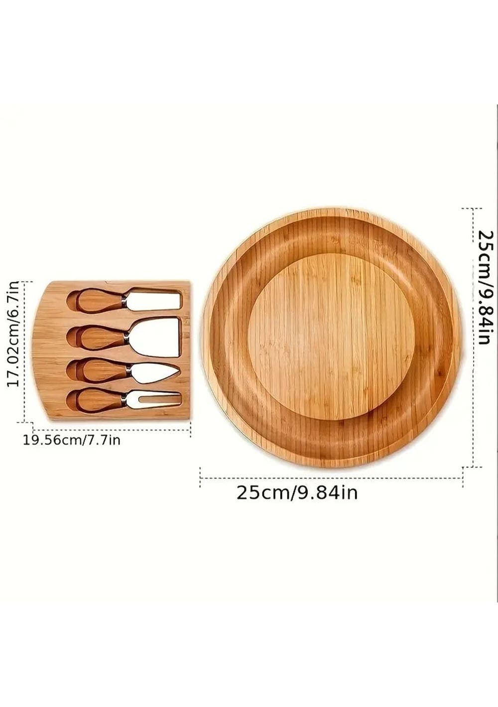 Yael Bamboo Cheese Board with Cheese Knives Never Buy Another Charcuterie Board AgainTransform your gatherings with our Circular Charcuterie Board, expertly crafted for durability and style. Enjoy a generous 25cm surface with smooth, splinter-resistant edges, perfect for showcasing your favorite cheeses and charcuterie without the hassle of cleanup or wear. Impress Without The MessElevate your entertaining with our Round Cheese Platter Set, featuring easy-to-clean, non-porous surfaces and built-in grooves to keep everything in place. The set includes a bamboo cheese board for your cheeses and a 4-piece knife set stored in a sleek hidden drawer for convenience and elegance. A Gift that WowsDelight your loved ones with our Bamboo Cheese Serving Board and Knife Set, ideal for every occasion from housewarming to birthdays. With unique hidden handles for easy carrying and a design that encourages creativity, you’ll be the go-to gift-giver, creating lasting kitchen memories. Specifications: Diameter: 25cmMaterial: BambooKnife Set: 4-pieceFeatures: Hidden drawer, smooth edges, non-porous surface, grooves for stability. Package included:1 x Yael Bamboo Cheese Board4 x Cheese Knives