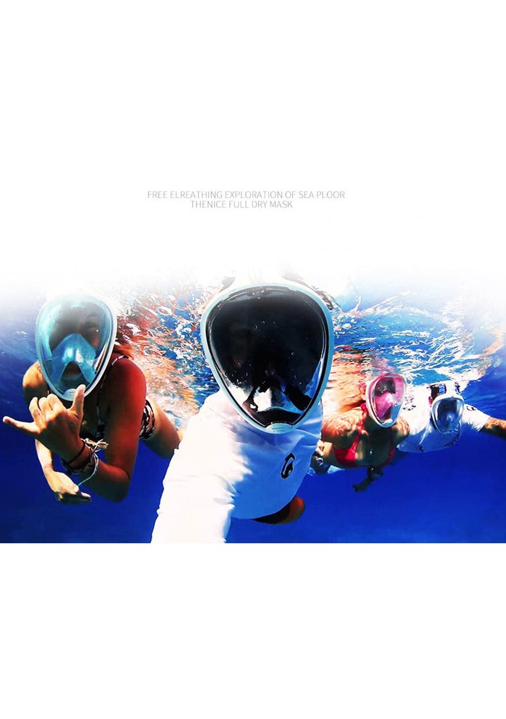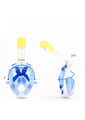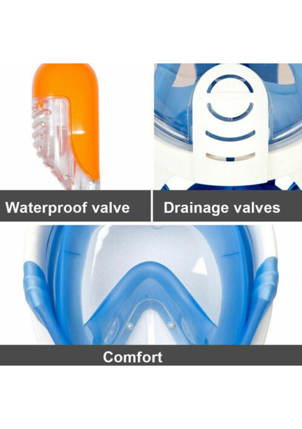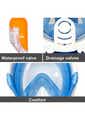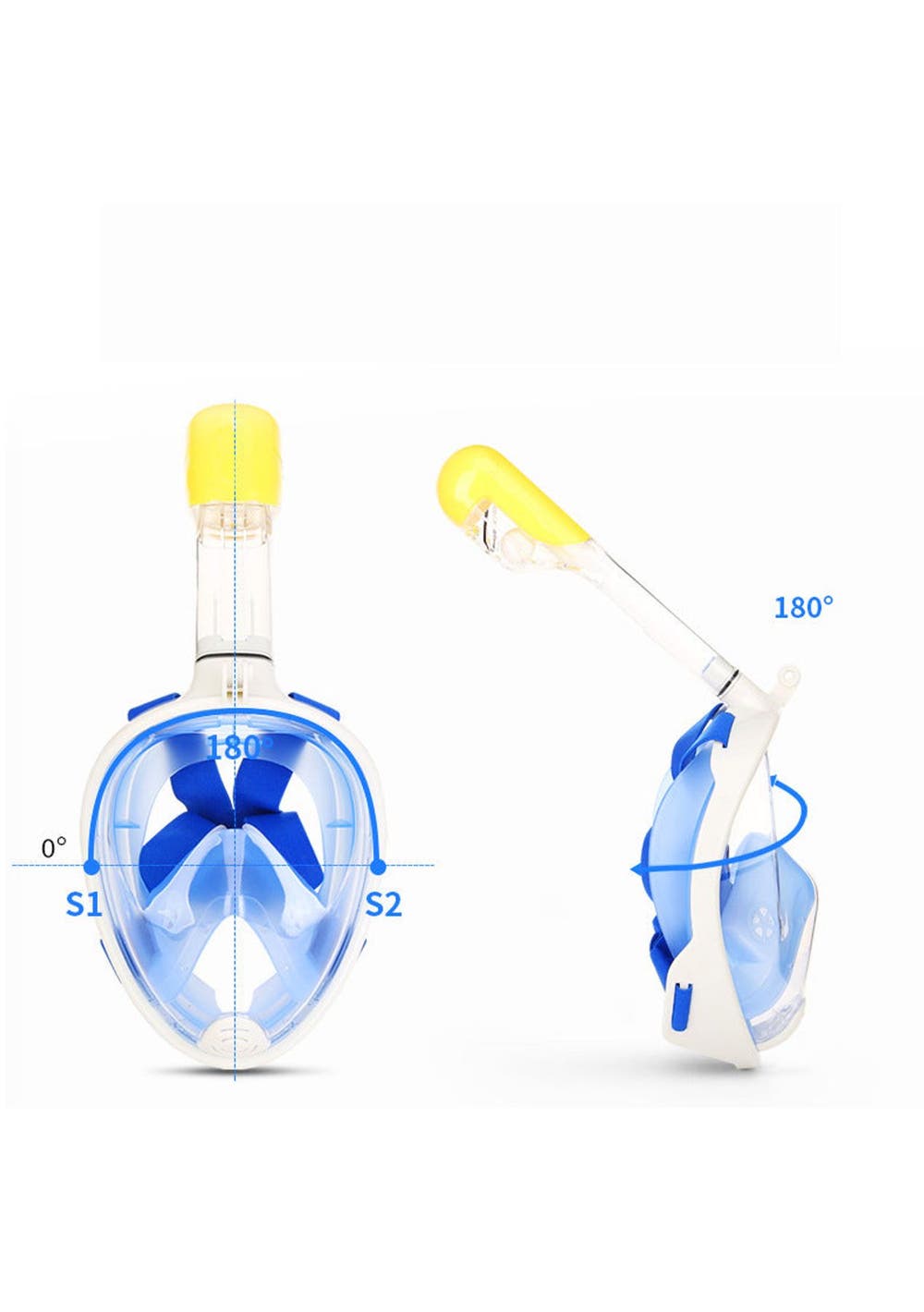1. 180°PANORAMIC VIEW FULL FACE DESIGN - It all comes together into one piece, so you can breathe easily without holding anything in your mouth. This updated version offering 180°superior views over traditional mask or snorkel sets, guaranteeing that you will see more colorful fish and reefs super than ever before.2. Free TO BREATHE - With this snorkeling mask the breathing experience is totally different. You’ll not worried about breathing at all. Our 2-in-1 mask and snorkel, take in the outer air from the upper part of the mask by the connected snorkel and exhale the gas from the lower area which just breathing through the nose or mouth as naturally as on land.3. ALL DRY SNORKELING TECHNOLOGY - This full face snorkel mask is designed with an integrated float ball to block the opening, then stops salt water from getting into your mouth and prevents gagging when you diving down, that’s no trouble to pop back up and breathing again. Environmentally soft silicone material ensures a high seal and comfort your face makes the snorkeling safe and comfortable.4. UPGRADED ANTI-FOG LENS - For viewing a more clear and Colorful underwater world, the full face mask features anti-fog coating and create the innovative breathing chamber provides streamlined airflow to eliminate fogging, spend less time worrying about fogging, and spend more time enjoy the snorkeling.5. Anti-Leak Design- Prevents water from coming in when you go below the surface.6. Water drainage- The bottom purge valve on the mask can drain water when the head is raised.7. GoPro Camera Compatible-With our integrated GoPro Mount you can easily attach your GoPro camera (Gopro hero 1, 2,3,3+,4...).8. EASE OF USE - This is the easiest snorkel mask you've ever used. It is easier to handle with the full face design, no special preparation and skills are needed perfect for beginner or water lovers!Specification:Color: BlueProduct weight: 557gSizes Available: S/M and L/XLMaterial: Premium Quality Silicone + PCPacking Included:1x Snorkel Mask1x Storing Bag1x User Manual1x Earplug