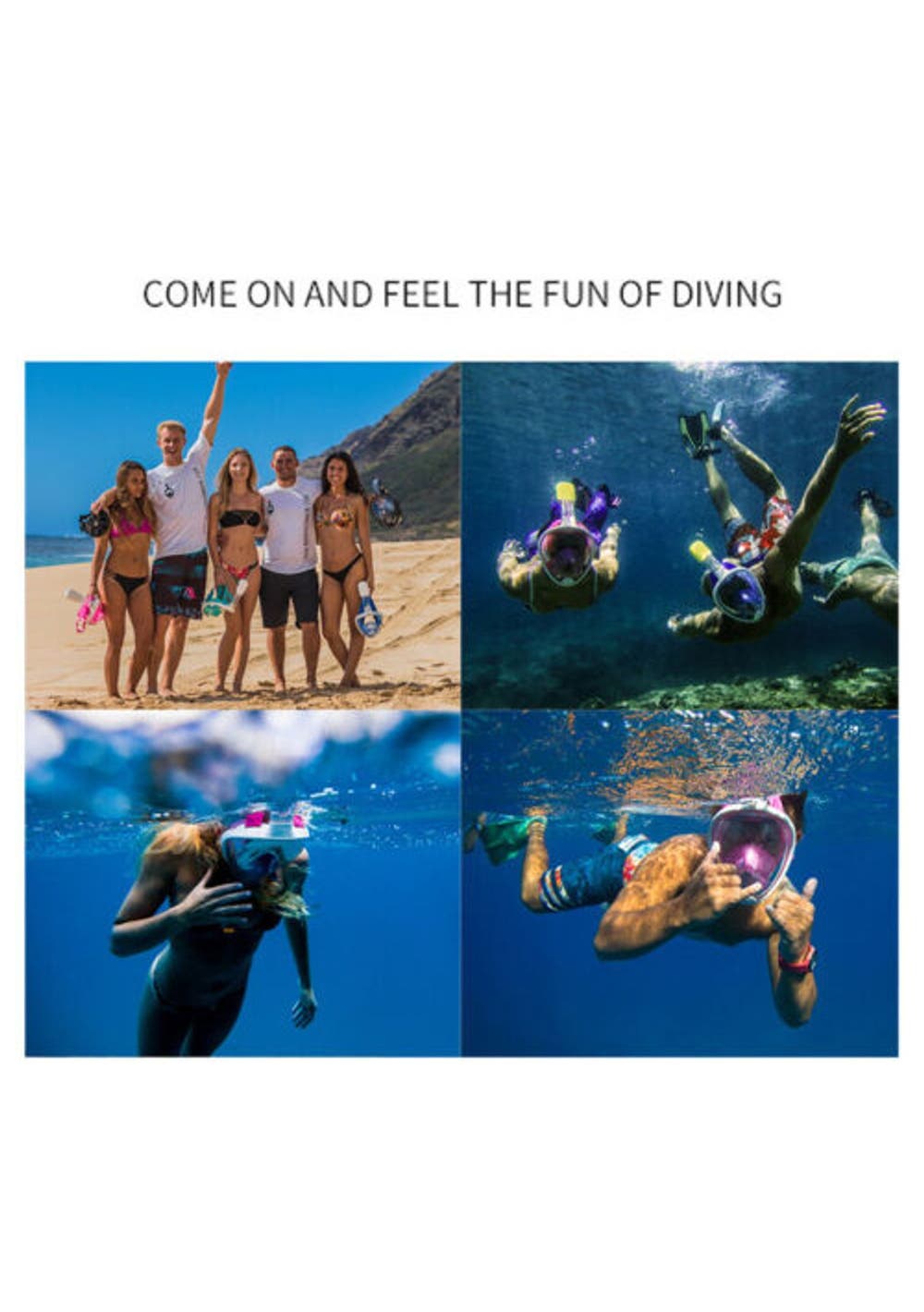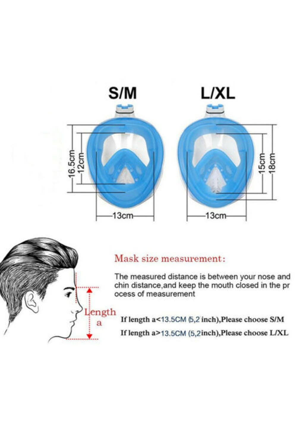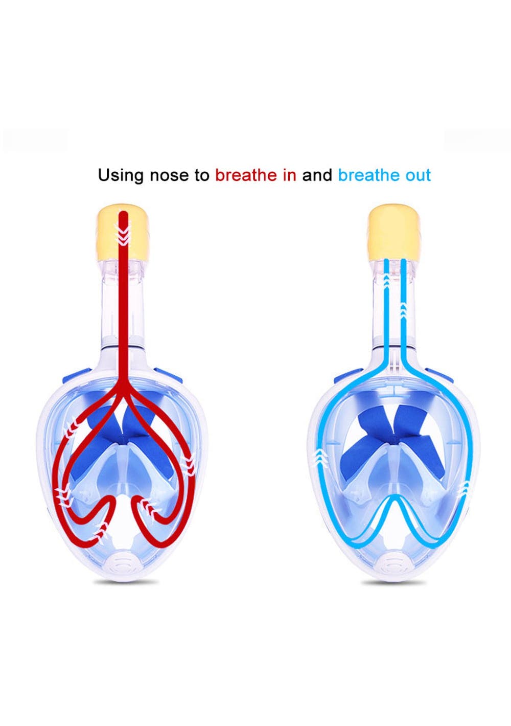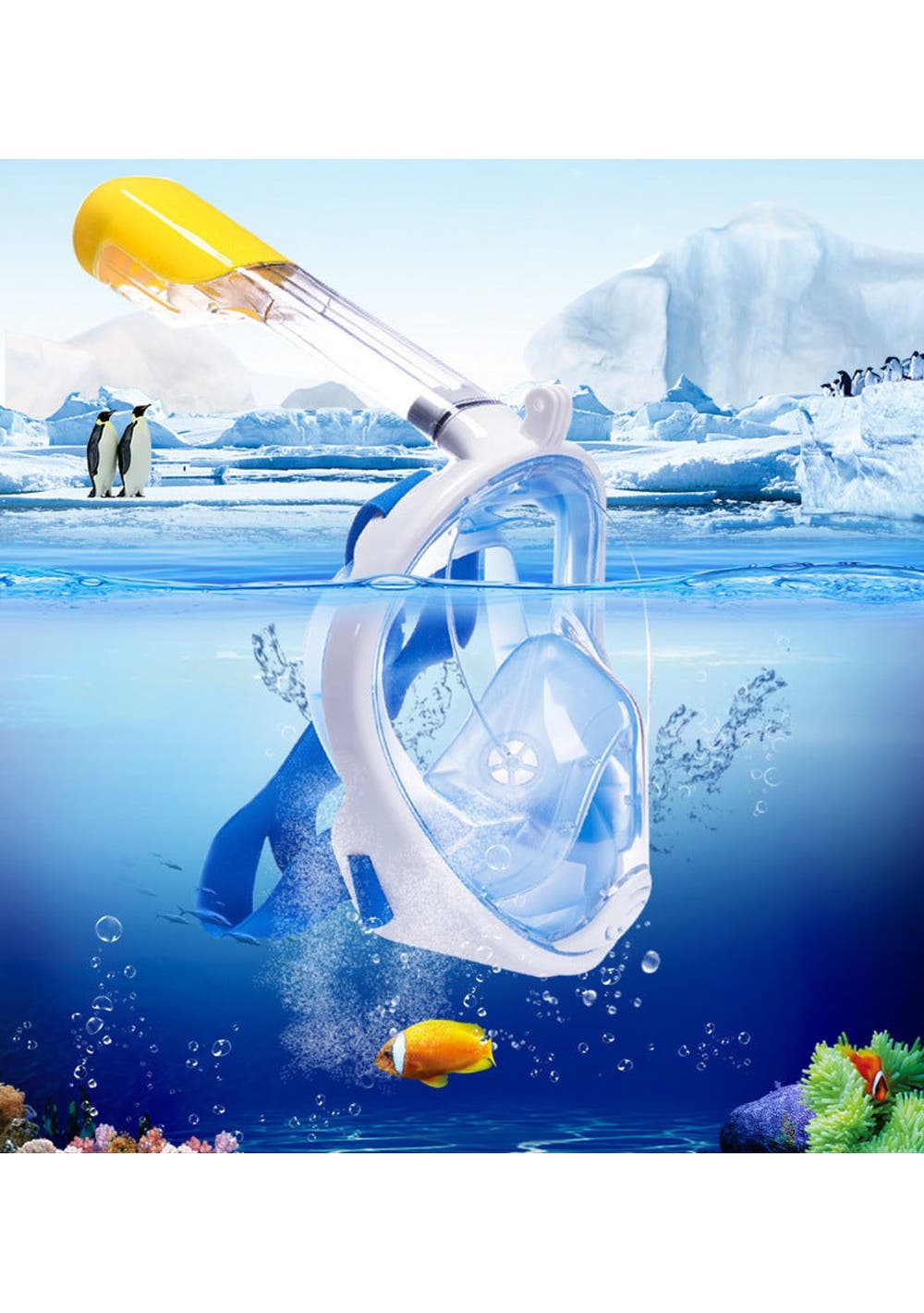 1. 180°PANORAMIC VIEW FULL FACE DESIGN - It all comes together into one piece, so you can breathe easily without holding anything in your mouth. This updated version offering 180°superior views over traditional mask or snorkel sets, guaranteeing that you will see more colorful fish and reefs super than ever before.2. Free TO BREATHE - With this snorkeling mask the breathing experience is totally different. You’ll not worried about breathing at all. Our 2-in-1 mask and snorkel, take in the outer air from the upper part of the mask by the connected snorkel and exhale the gas from the lower area which just breathing through the nose or mouth as naturally as on land.3. ALL DRY SNORKELING TECHNOLOGY - This full face snorkel mask is designed with an integrated float ball to block the opening, then stops salt water from getting into your mouth and prevents gagging when you diving down, that’s no trouble to pop back up and breathing again. Environmentally soft silicone material ensures a high seal and comfort your face makes the snorkeling safe and comfortable.4. UPGRADED ANTI-FOG LENS - For viewing a more clear and Colorful underwater world, the full face mask features anti-fog coating and create the innovative breathing chamber provides streamlined airflow to eliminate fogging, spend less time worrying about fogging, and spend more time enjoy the snorkeling.5. Anti-Leak Design- Prevents water from coming in when you go below the surface.6. Water drainage- The bottom purge valve on the mask can drain water when the head is raised.7. GoPro Camera Compatible-With our integrated GoPro Mount you can easily attach your GoPro camera (Gopro hero 1, 2,3,3+,4...).8. EASE OF USE - This is the easiest snorkel mask you've ever used. It is easier to handle with the full face design, no special preparation and skills are needed perfect for beginner or water lovers!Specification:Color: BlueProduct weight: 557gSizes Available: S/M and L/XLMaterial: Premium Quality Silicone + PCPacking Included:1x Snorkel Mask1x Storing Bag1x User Manual1x Earplug