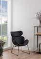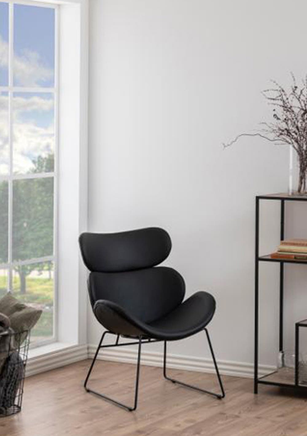 The curves of this all-black resting chair bring comfort and contemporary style together in one modern piece of furniture. Designed with a rough powdered metal sledge base and a seat upholstered in black leather look fabric, the resting chair looks elegant and is made of practical materials as well. Such a timeless piece represents a modern addition to any corner of your home.