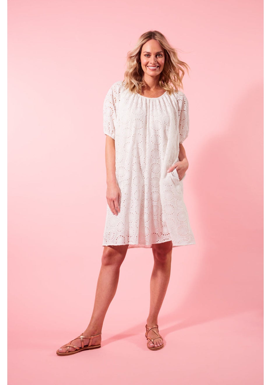 Indulge your dress obsession with the Parterre Dress, a stunning and feminine knee-length dress crafted with exquisite broderie lace. The elastic scoop neck allows for versatile styling, with the ability to wear it on or off the shoulder. Dress it with sneakers for a casual vibe or wear with heels for a dressy look. Relaxed look with inseam pockets. Elastic scoop neckline. Fabric 100% Cotton