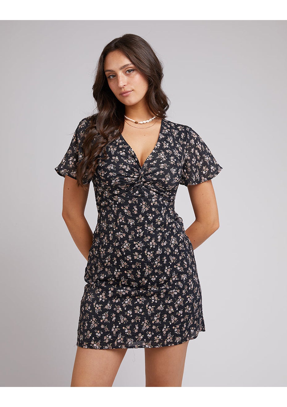 The Maya Floral Mini Dress made from a soft woven fabrication is fully lined and features cute ditsy floral print throughout. This dress also has a flattering v neckline with a twist front and zip closure at the centre back. Pair back with some sandals for a cute Spring look or some heels and a denim shacket for a night out. Mini Length AAE Graphic design V Neckline Main 73% Rayon, 27% Nylon, Lining 100% Viscose