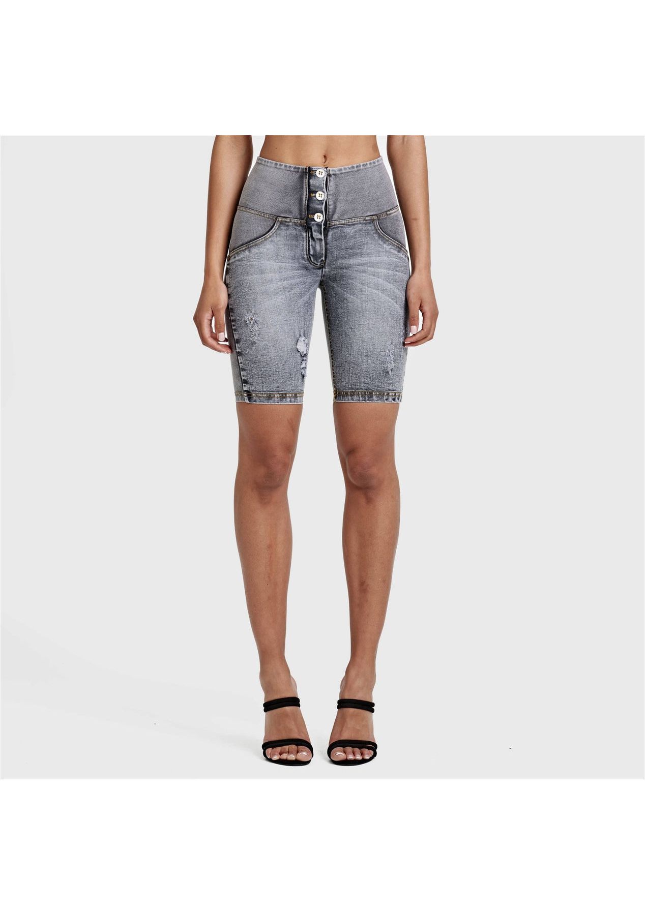 Freddy Jeans - Distressed Denim - High Waisted - Biker Shorts - Grey + Yellow Stitching