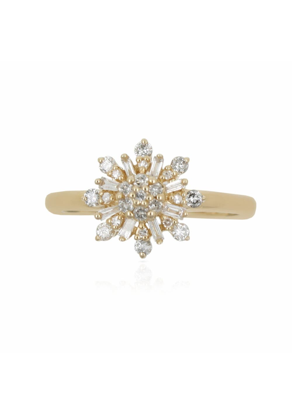 This stunning 14ct yellow gold diamond ring is a gorgeous dress ring, featuring a clever set star in the center. A timeless design that will be a great gift, or to simply spoil yourself! Set with 1/3 carat of diamonds, it is has the following diamond specifications: Color H-I ; Clarity SI1-I1 8 baguette stones,15 round brilliant diamonds and 8 single cut diamonds Available in ring size is N (54) , our manufacturing jeweller recommends resizing is possible on this design & can be resized up 6 and down 3 sizes