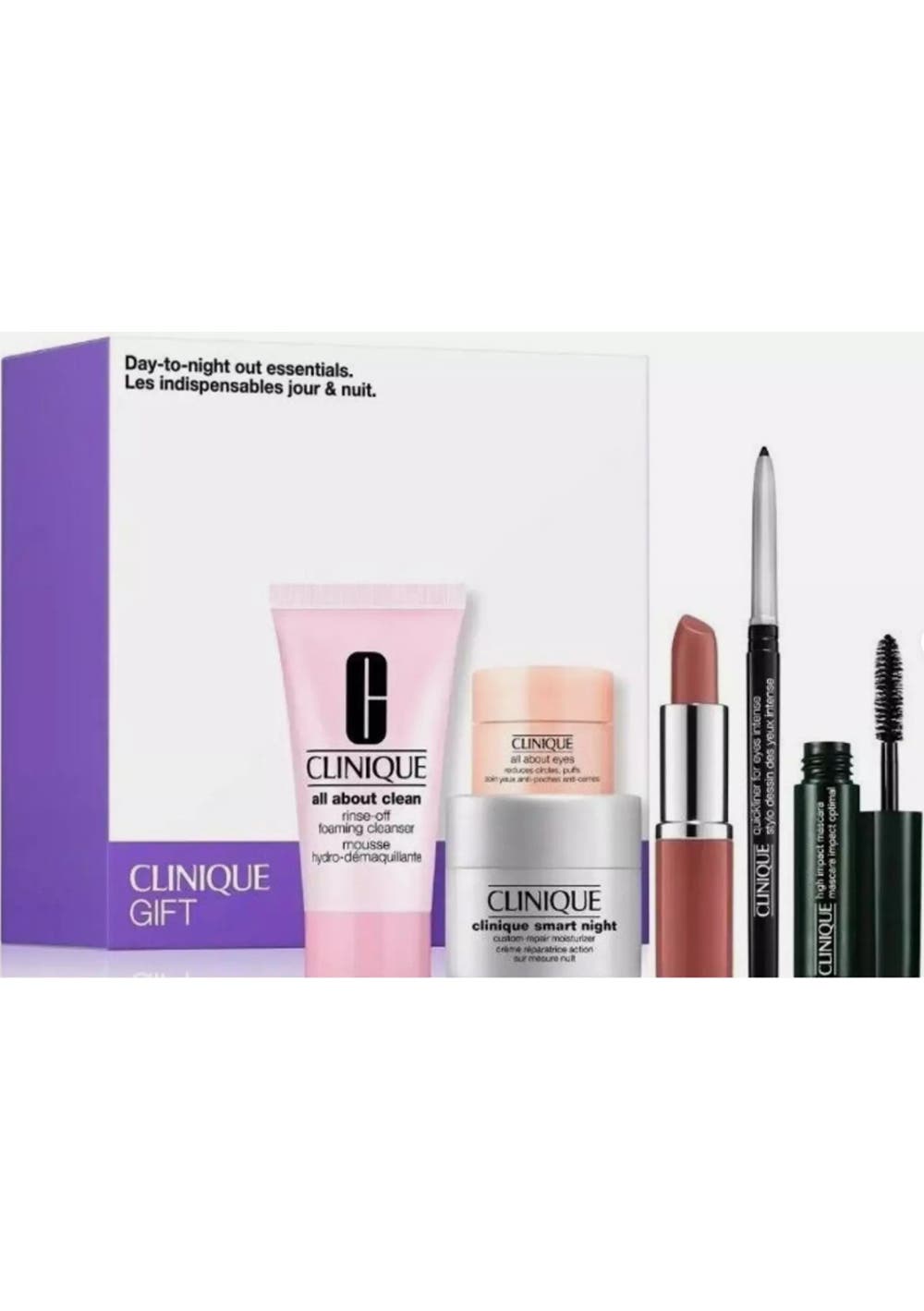 Clinique "Day-to-Night Out Essentials" 6pc Gift Set - Boxed Includes: -All About Clean Foaming Cleanser - 30ml -Smart Night Moisturizer - 15ml -All About Eyes - 5ml -Quickliner For Eyes "Intense Black" -.14g -High Impact Mascara "Black" - 3.5ml -Pop Lip Colour + Primer "Bare Pop" - .13oz