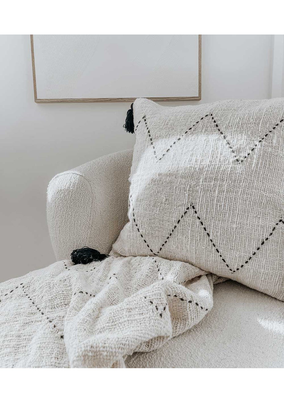 Ivory with a Ebony Zig Zag Stitch & and Tassels, hand-woven from 100% Textured Cotton. Our Cushion Covers are the perfect addition to any room, and will be well loved in your bedroom or lounge for years to come. Designed in NZ | Made in Bali Cool Machine Wash | 100% Cotton Cover Only - Size | 45x45cm Due to the nature of hand-woven items the knit is an imperfect look, and sizes may vary - making each piece unique and beautifully different from the next.