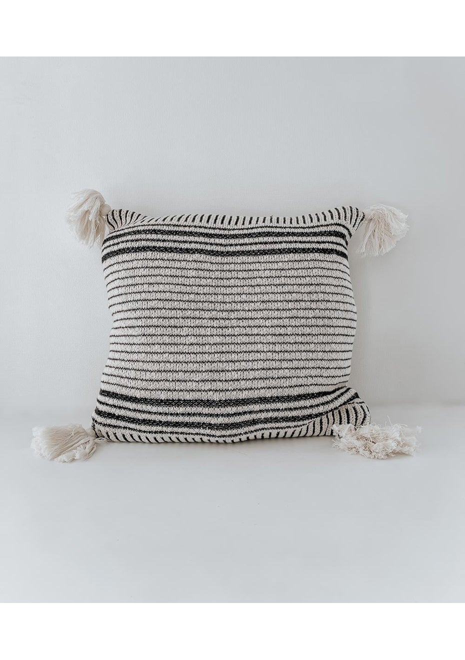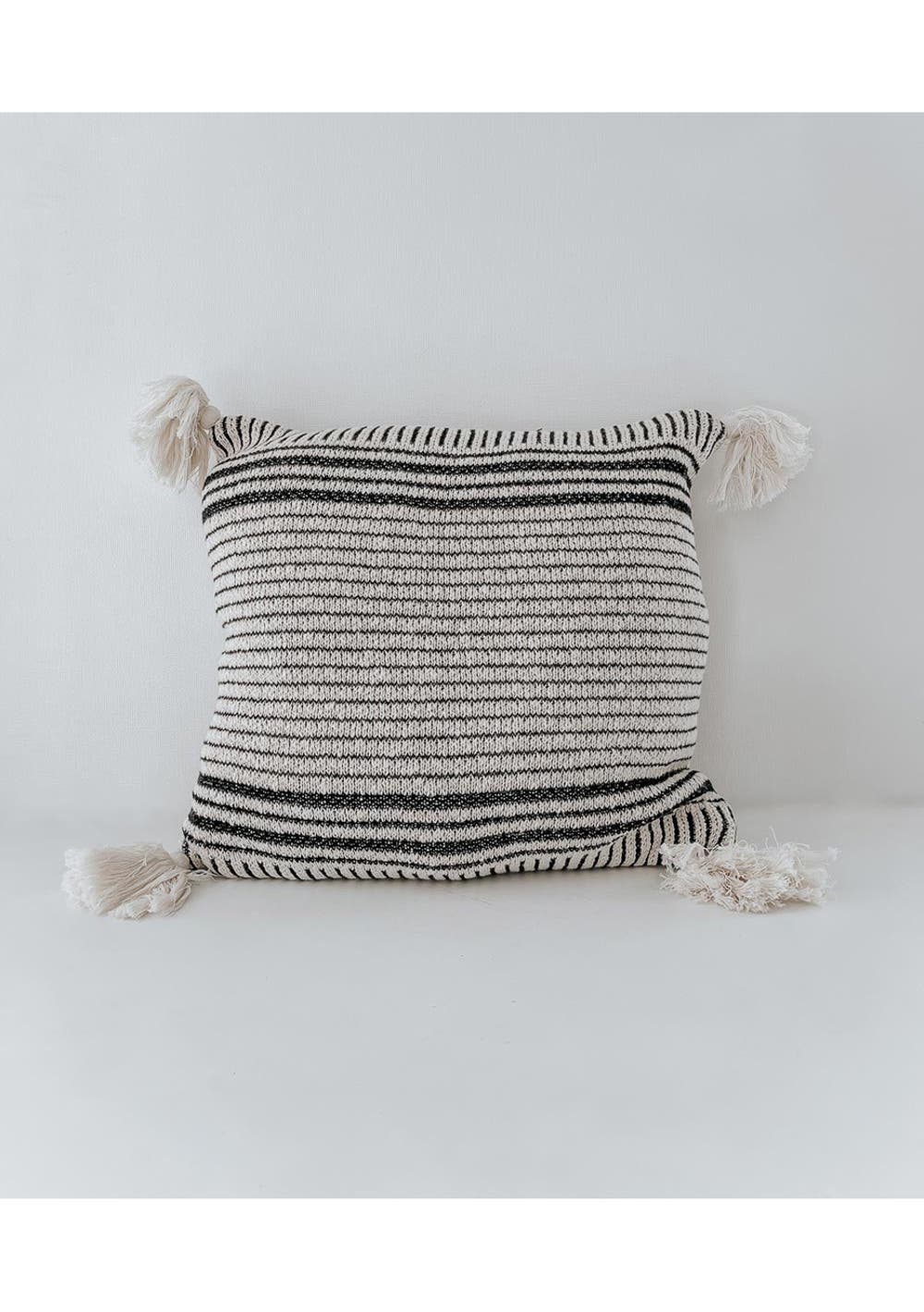 Black & Ivory Stripe Knit, with four corner tassels. Woven from 100% Pure Cotton. Our luxuriously soft Cushion Covers are the perfect addition to any room, and will be well loved in your bedroom or lounge for years to come. Our Pure Oeko-tex® Certified Cotton not only accounts for the fabric being free from harmful substances - but also for environmental protection, sustainability, and fair working conditions. Designed in NZ | Made in India Spot Clean | 100% Cotton Cover Only - Size | 45x45cm