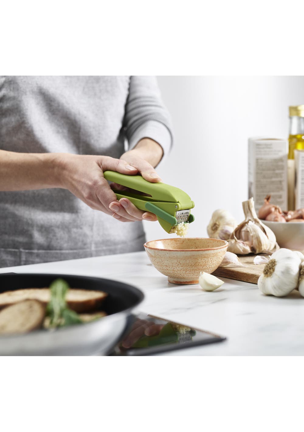 Keep your hands garlic-free and enjoy pressed garlic in little to no time with the Joseph Joseph CleanForce Garlic Press! This garlic press is carefully designed to crush garlic cloves with ease. It's also designed with a wiper blade, a scraping tool, and a cleaning tool with solid bristles neatly attached on its handles for effortless cleaning. Features: Made from durable plastic, stainless steel, and nylon Measures 16cm x 6cm x 4.2cm BPA-free Easy-squeeze mechanism Handy cleaning tool attached to handle Trigger-operated wiper blade removes crushed garlic Dishwasher safe