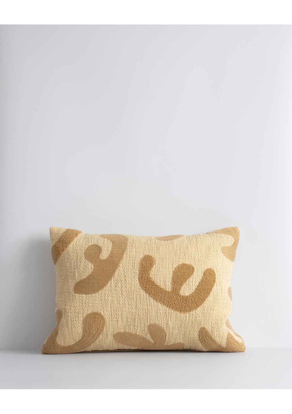 Embroidered, boucle and textural elements come together in this Matisse-inspired cushion. Hand-cut, oversized forms are assembled onto a tactile, cotton base, with a tone-on-tone aesthetic. Mix the lumbar shape with Flaxmill Pecan and Silhouette cushions to create a cosy and comforting space.