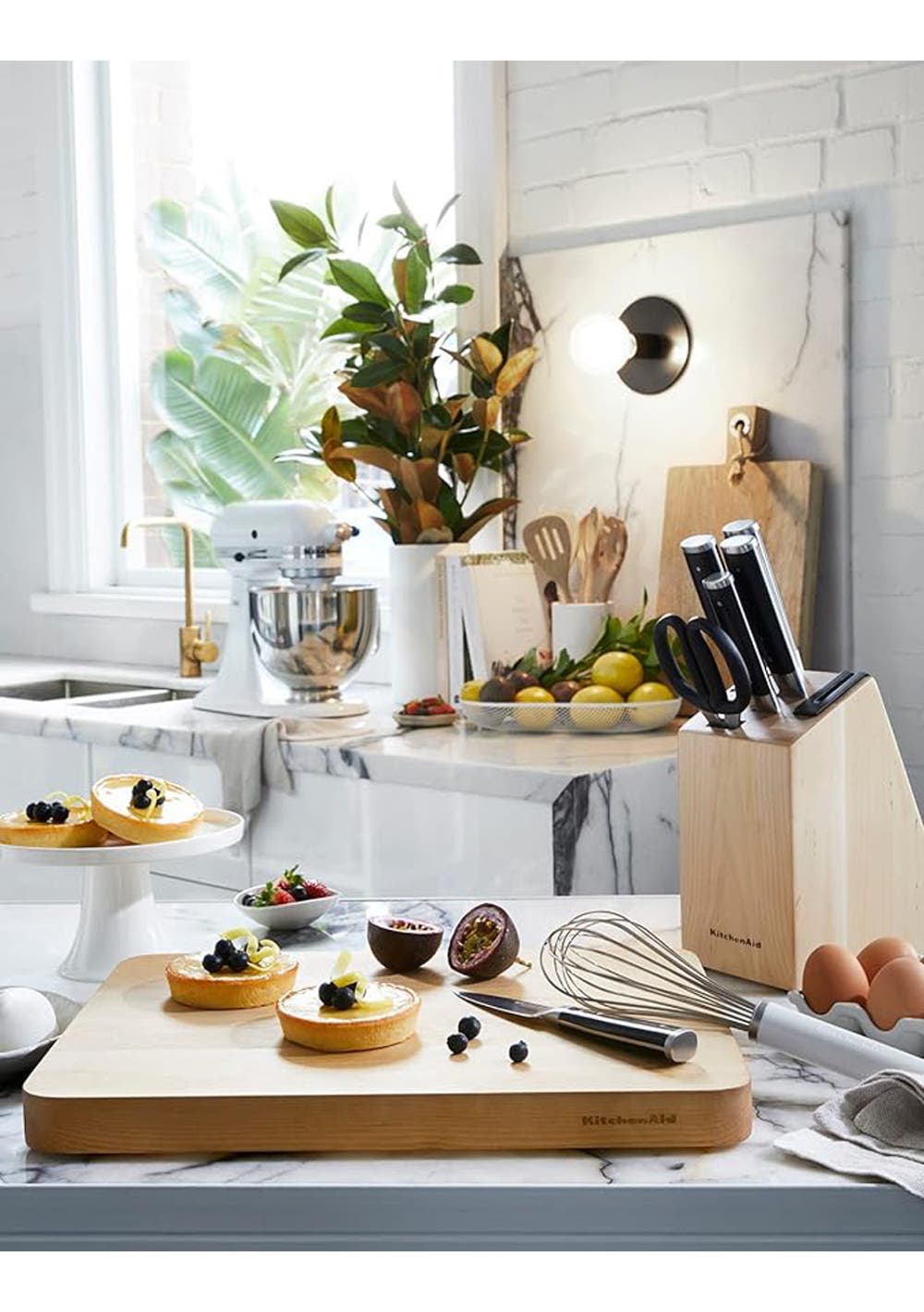 Get inspired in the kitchen with the KitchenAid Gourmet six-piece knife block set. Expertly forged from semi-polished, high-carbon Japanese steel, hardened and tempered to provide a long-lasting edge for a professional, quality cut every time.