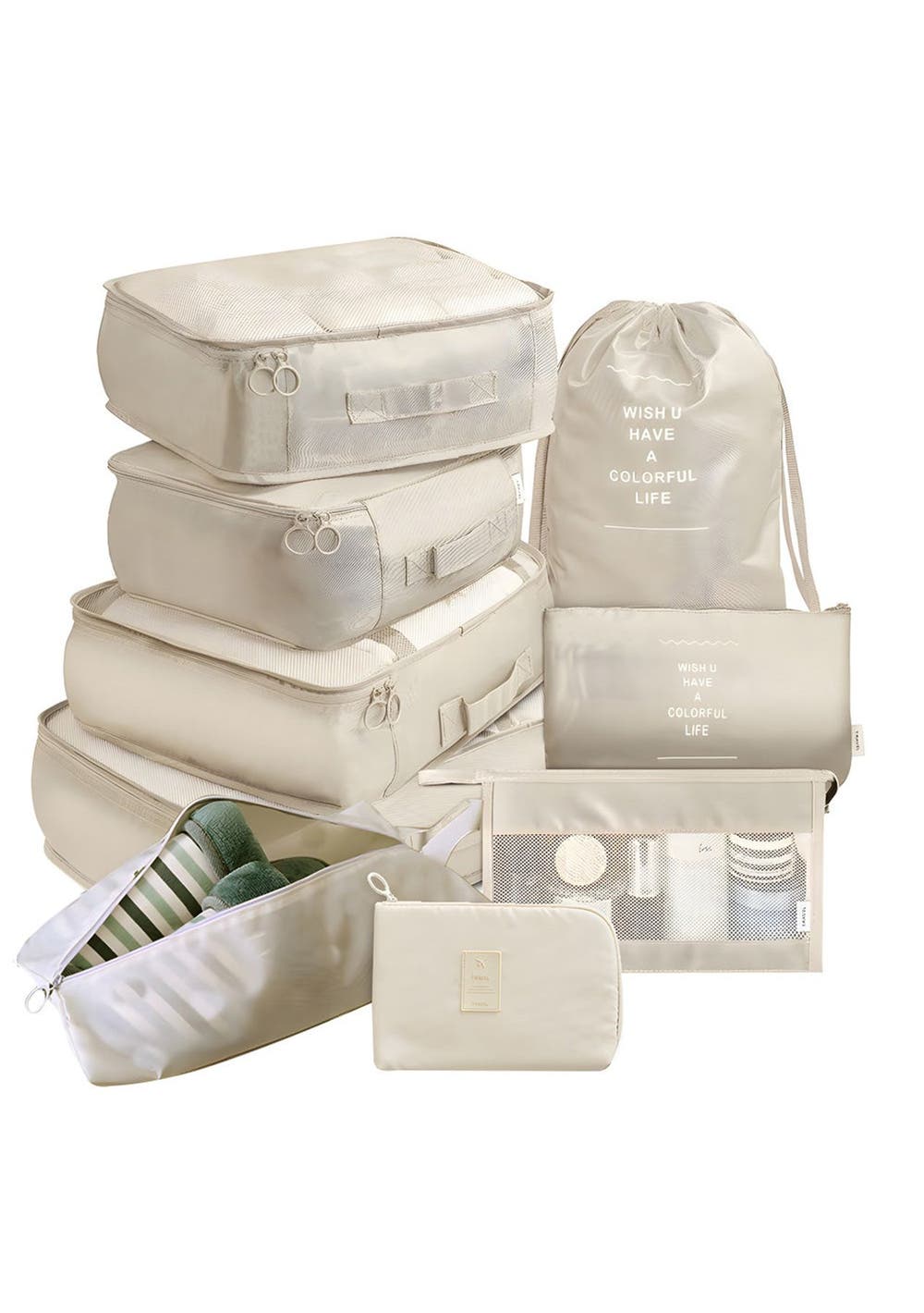 Product Description:Separate underwear, laundry, cosmetics in isolated cubes to keep them private, easily sorted and found with minimal effort.Incredible capacity that can accommodate luggage of a suitcase from 20 inches to 28 inches with various cube sizes applied.Neat netting on 3 large clothes bags provides visibility on luggage types while maintaining breathable.Strong material withstands tear against wrinkles and maintains solid shape. Waterproof material makes it easy to clean up and get dry in short. Worry free from cleaning and always prepared for your trip.Featuring durable zippers that hold the bags together with firm stitches neatly aligned. Made with water resistant material, and breathable lightweight mesh texture and foldable design, these cubes are a PRO at every detail. Get packed and go is a fun plus.Product Specification:Material: PolyesterColor: Navy Blue, Gray, Beige, BlueSize:Large mesh bag: 40*30*12cmMedium mesh bag: 30*28*12cmSmall mesh bag: 30*20*12cmMakeup bag: 26*15*9cmBra bag: 28*20*10cmDraw pocket: 34*24cmData pocket: 21*15cmShoe bag: 36*21cmPocket: 27*12cmPackage Inclusion:1 x 9 PCs Storage Bags