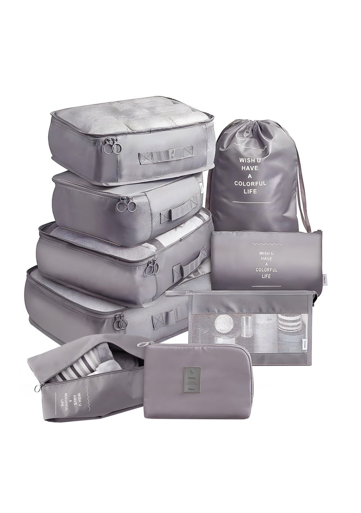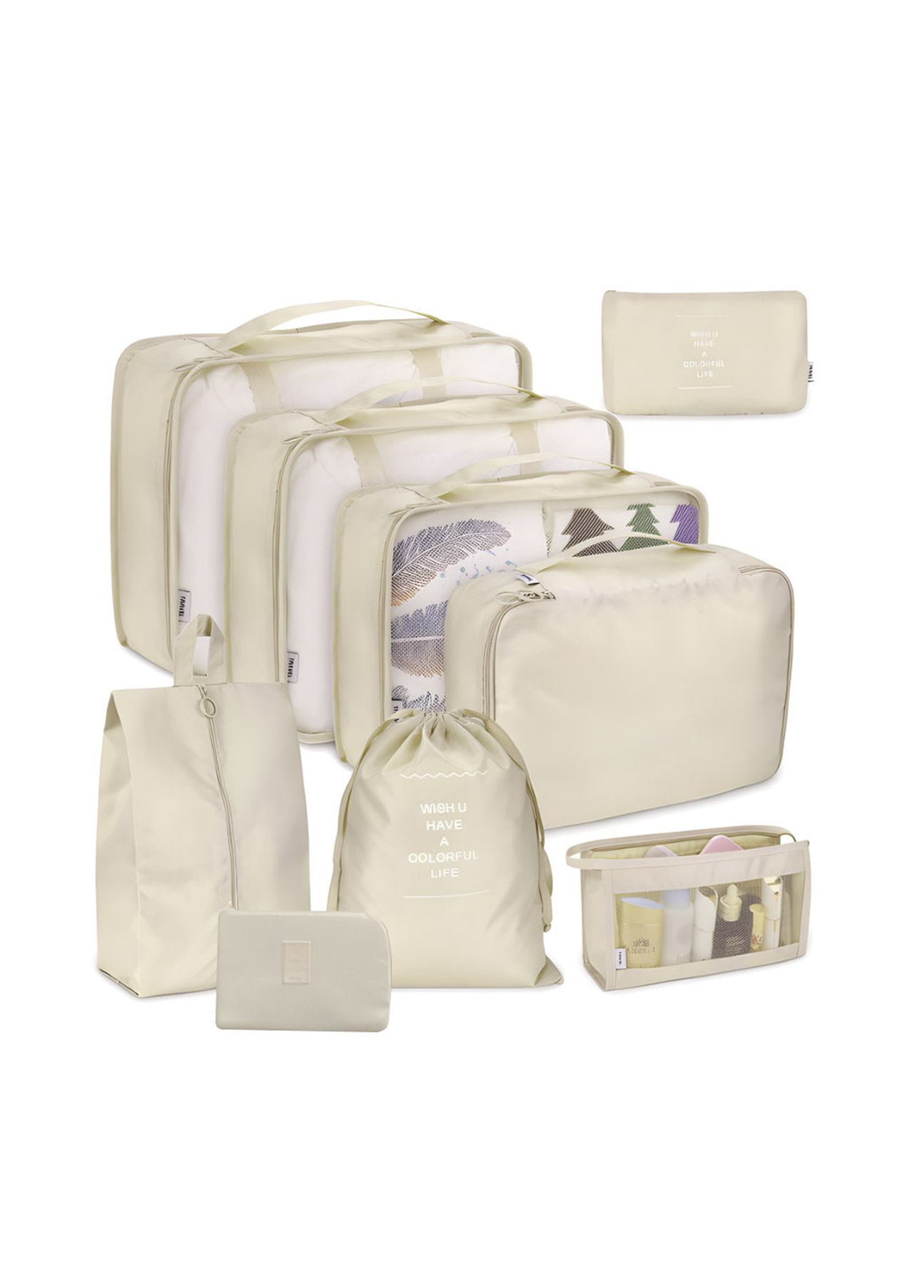 Product Description:Separate underwear, laundry, cosmetics in isolated cubes to keep them private, easily sorted and found with minimal effort.Incredible capacity that can accommodate luggage of a suitcase from 20 inches to 28 inches with various cube sizes applied.Neat netting on 3 large clothes bags provides visibility on luggage types while maintaining breathable.Strong material withstands tear against wrinkles and maintains solid shape. Waterproof material makes it easy to clean up and get dry in short. Worry free from cleaning and always prepared for your trip.Featuring durable zippers that hold the bags together with firm stitches neatly aligned. Made with water resistant material, and breathable lightweight mesh texture and foldable design, these cubes are a PRO at every detail. Get packed and go is a fun plus.Product Specification:Material: PolyesterColor: Navy Blue, Gray, Beige, BlueSize:Large mesh bag: 40*30*12cmMedium mesh bag: 30*28*12cmSmall mesh bag: 30*20*12cmMakeup bag: 26*15*9cmBra bag: 28*20*10cmDraw pocket: 34*24cmData pocket: 21*15cmShoe bag: 36*21cmPocket: 27*12cmPackage Inclusion:1 x 9 PCs Storage Bags