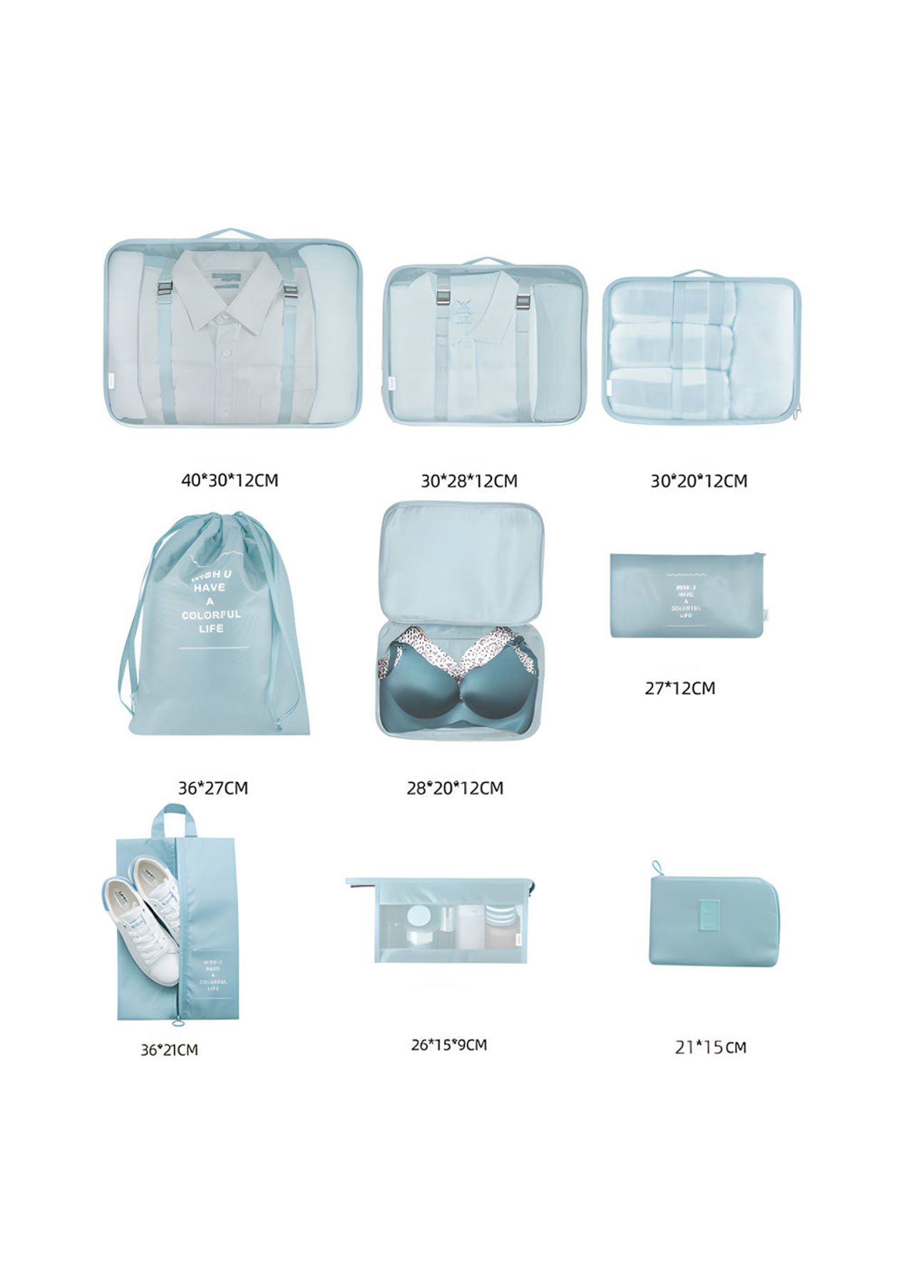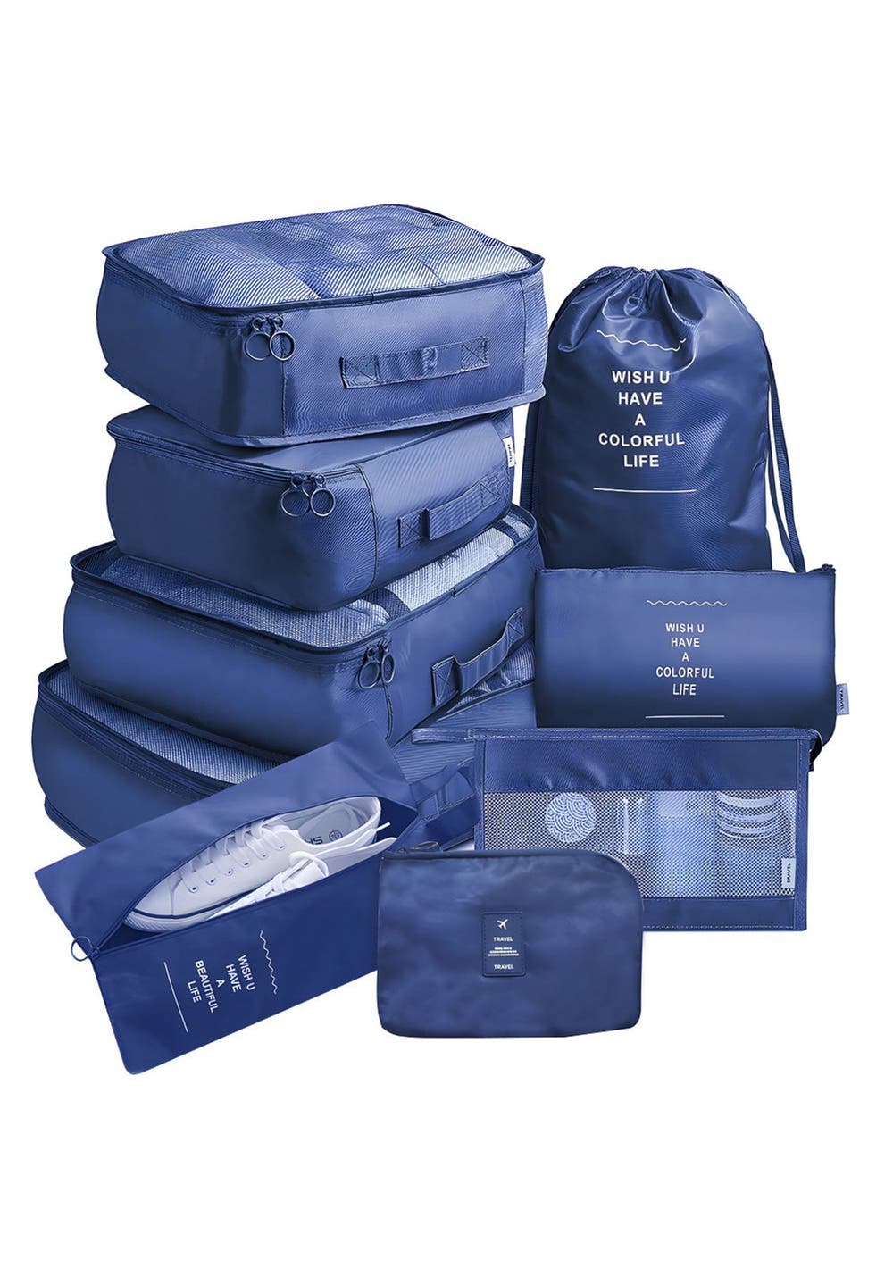 Product Description:Separate underwear, laundry, cosmetics in isolated cubes to keep them private, easily sorted and found with minimal effort.Incredible capacity that can accommodate luggage of a suitcase from 20 inches to 28 inches with various cube sizes applied.Neat netting on 3 large clothes bags provides visibility on luggage types while maintaining breathable.Strong material withstands tear against wrinkles and maintains solid shape. Waterproof material makes it easy to clean up and get dry in short. Worry free from cleaning and always prepared for your trip.Featuring durable zippers that hold the bags together with firm stitches neatly aligned. Made with water resistant material, and breathable lightweight mesh texture and foldable design, these cubes are a PRO at every detail. Get packed and go is a fun plus.Product Specification:Material: PolyesterColor: Navy Blue, Gray, Beige, BlueSize:Large mesh bag: 40*30*12cmMedium mesh bag: 30*28*12cmSmall mesh bag: 30*20*12cmMakeup bag: 26*15*9cmBra bag: 28*20*10cmDraw pocket: 34*24cmData pocket: 21*15cmShoe bag: 36*21cmPocket: 27*12cmPackage Inclusion:1 x 9 PCs Storage Bags
