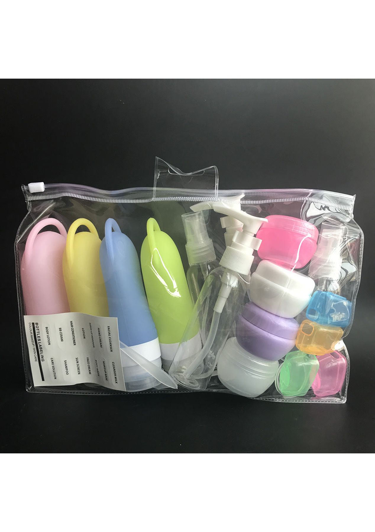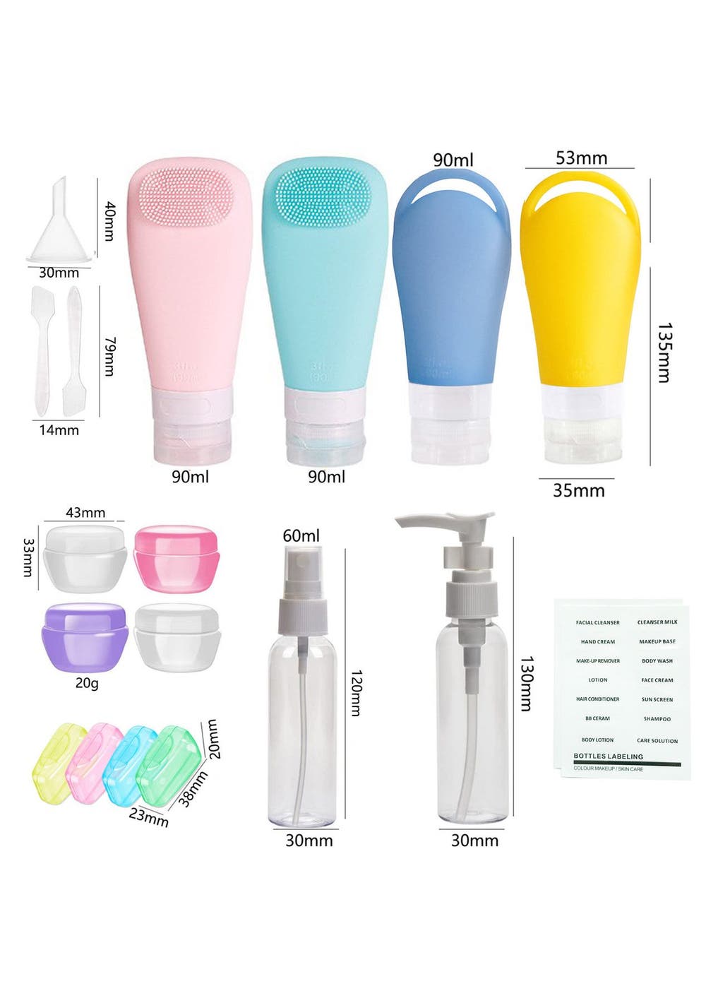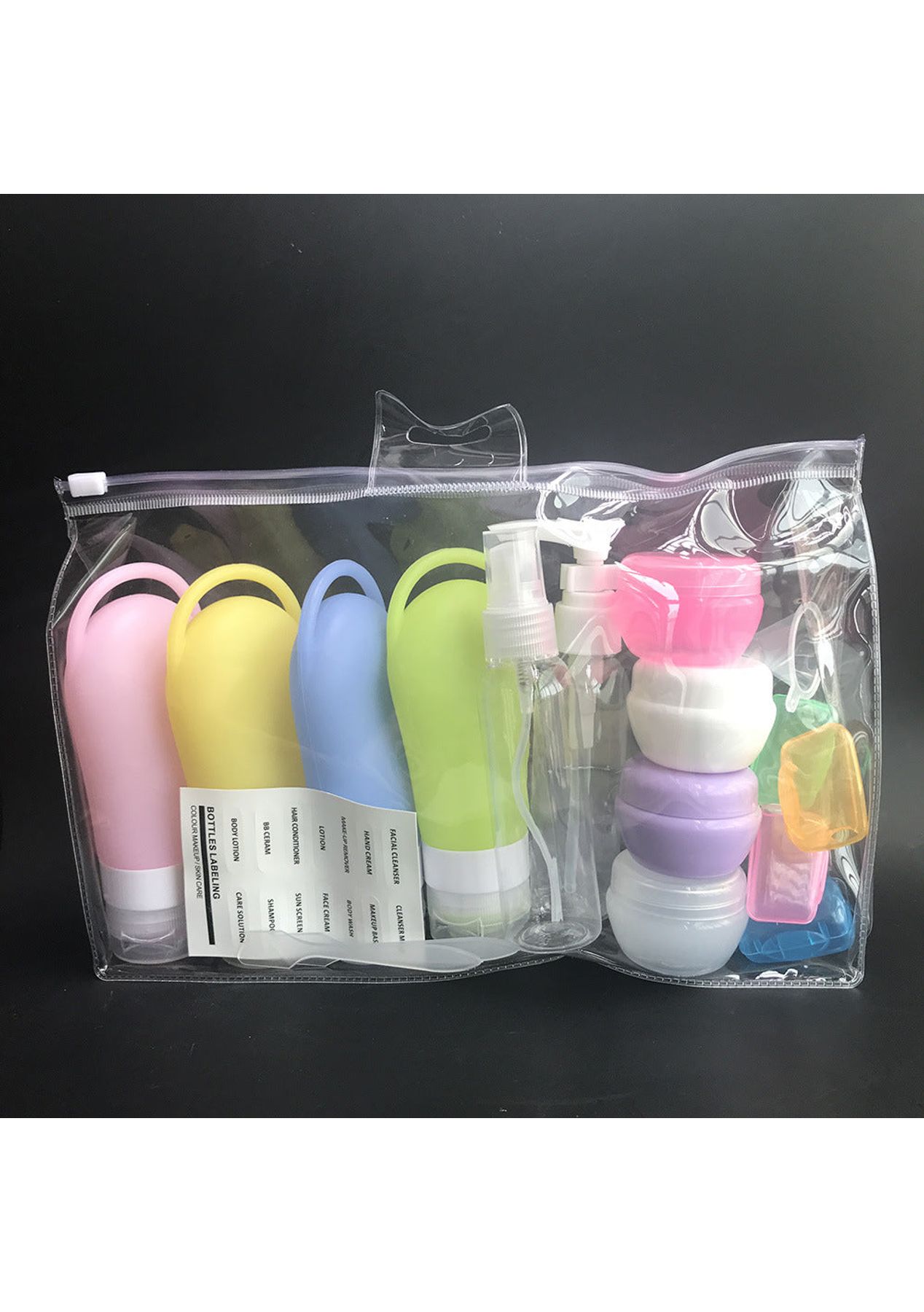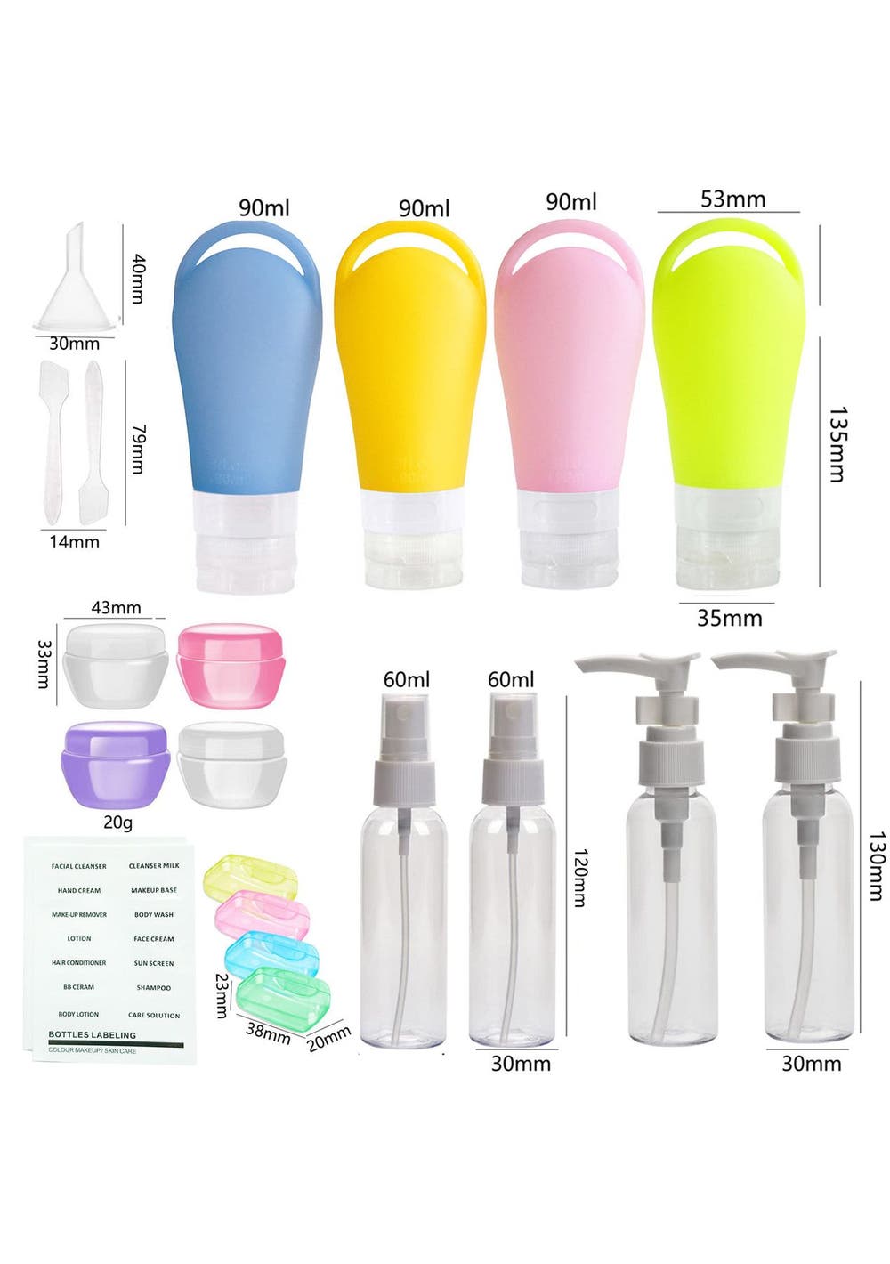 FeaturesThis is a nice assortment of travel containers in a useful zip case. Multiple ones allow you take along different beauty products and toiletries according to your requirement.The top of these travel bottles and containers are very secure. They will stayed sealed in your luggage while traveling. Size is perfect for the security check at the airport.Made of food grade Silicone which is BPA free and non-toxic, feel soft, flexible and comfortable instead of hard like traditional plastic travel bottles. The silicone is thick and durable but can be squeezed easily.These bottles feature with a nice wide opening, big enough to fill lotion, shampoo and conditioner easily. Just unscrew the top cap, fill liquids to hole. Besides, when it’s time to clean them up the plastic ring can be detached easily.All travel accessories are packed in a handy bag, fits in any small space, easy to take on the go and save your toiletry space. Perfect for travel, vacation, plane trip and camp. SpecificationsMaterial: silicone + plasticPackage Size: 25 x 14 x 4.5 cm 19pcs Package Include:4 x 90ml Silicone Bottles1 x 60ml Spray Bottle1 x 60ml Lotion Bottle4 x 20g Cream Boxes4 x Toothbrush Head Covers2 x Scrapers1 x Funnel2 x Stickers1 x Storage Bag 21pcs Package Include:4 x 90ml Silicone Bottles2 x 60ml Spray Bottle2 x 60ml Lotion Bottle4 x 20g Cream Boxes4 x Toothbrush Head Covers2 x Scrapers1 x Funnel2 x Stickers1 x Storage Bag