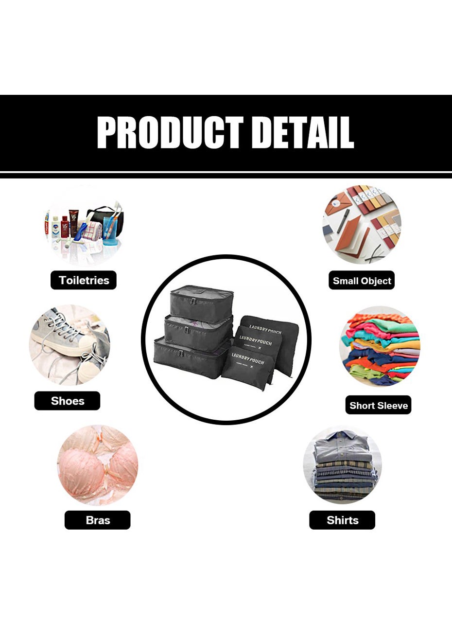 6PCS Packing Cubes for Travel Luggage Organiser Bag Black<br>Material: Polyester<br>Product dimensions (LWH): 40×30.cm<br>Package dimensions (LWH): 20 x 15 x 4cm <br>Weight:180 g<br>KEY FEATURES:<br> High Quality: Packing cubes made of high quality waterproof Nylon, reusable, easy to clean and carry on;<br> 6 Packing Organizer: 3 packing cubes for travel + 3 Pouches allow for neatly organzing items with easy.Satisfy all your travel needs;<br> Save Space: Save space in your luggage/bag ,help you classifying your belongings,make full use of the spare, also avoid the luggage overweight;<br> Clothes Protector: They can keep your clothes, footwear, toothbrushes, dirty laundry and so on in organization, they also can protect suits from dirt, dust, damp and bacteria;<br> The Best Choice for Travel: Perfect travel accessories to keep your luggage neat and tidy suitable for for household, travel, vacation, business trip and outdoor camping, lodging.<br> Package Include <br> 1 x 6PCS Packing Cubes for Travel Luggage Organiser Bag