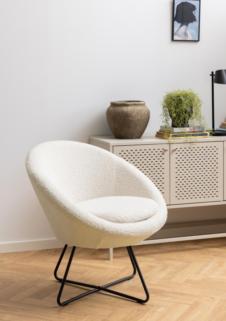 Increase the cosiness in your home with this round lounge chair. Its peculiar look makes the cream chair anything but traditional. Such a design creates a visual point of difference and gives your home a unique feeling. It is fully padded and has a seat cushion to keep you comfortable, while the black metal cross base secures stability. Saying goodbye and getting back up from this chair may be difficult because it is just so soft and fluffy. Key features: - Contemporary design that easily warms up any empty corner - Organic round shape with expressive cross base - Soft and fluffy teddy-like fabric for a warm and cosy atmosphere - Contrasting colour combination of cream and black - Crossed black metal legs increase visual interest Product Dimensions: 82cm (W) x 71cm (D) x 81cm (H) Max weight capability main surface: 110kg