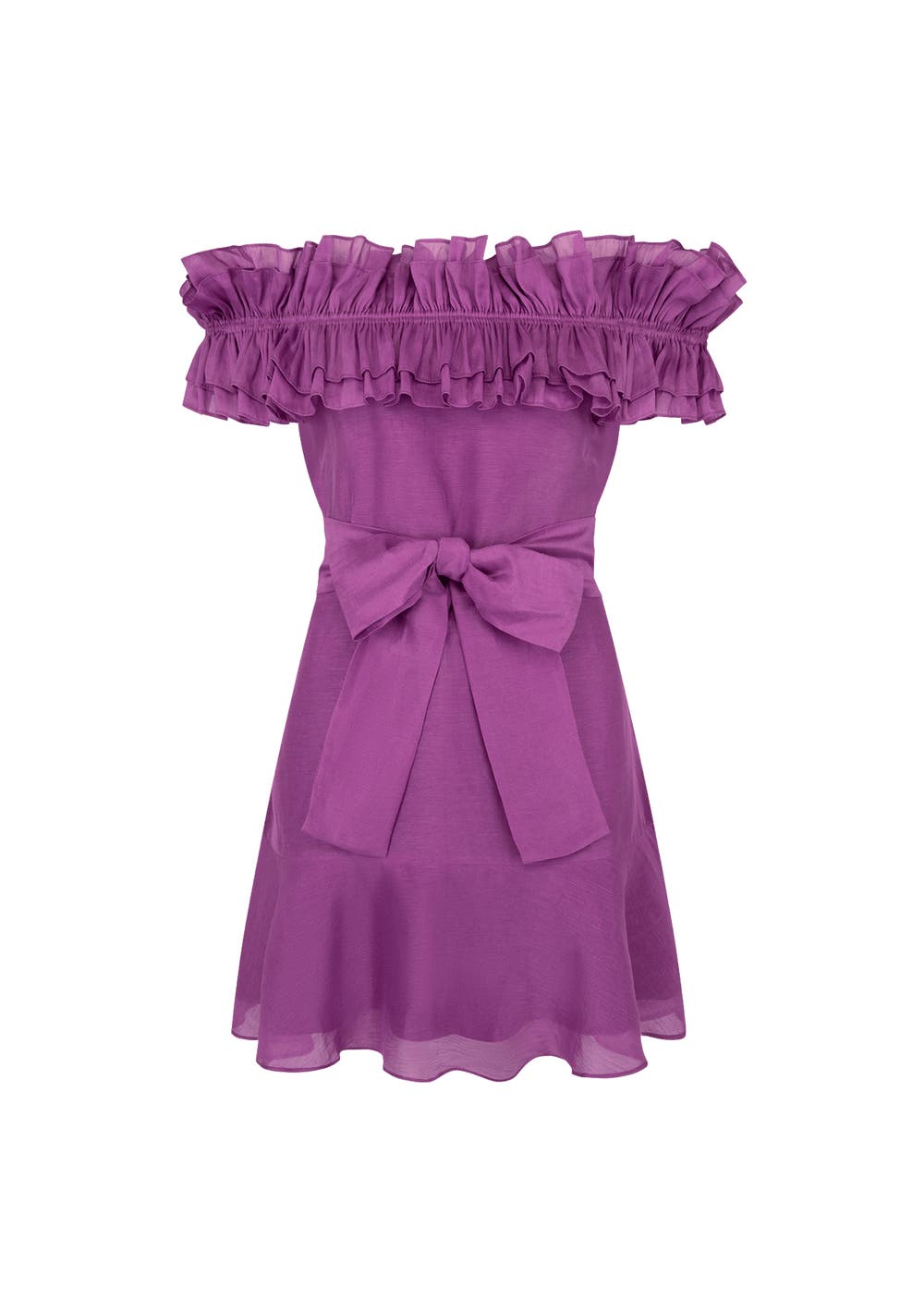 sensational combination of frill detailing cut in a sumptuous linen silk fabrication. This slip on design features a free waist to be gathered with the matching waist tie. Garment Details Premium delicate silk linen fabrication 30% Silk 70% Linen Exclusively designed La Maison Talulah Floral Print Off the shoulder flare skirt mini dress with free waist belted Dress is fully lined Detailed off shoulder frill design with gathering and elastic across top of chest Free wide waist – photographed belted in- see measurements. Soft silky 98% Polyester 2% elastane fully lined dress Skirt has a circle cut flare skirt. Dress is pull over head with no zip or closures Fabric & Wash Care Gently cold hand wash turned inside out. Do not soak, only a light hand wash or spot clean recommended. Do not tumble dry. Line dry in shade Warm iron inside out very gently Dry cleanable Light steaming only Due to the delicate nature of this natural fabric, we recommend washing after numerous wears and only when needed to keep the longevity of the garment and delicate fabric. Designed in Australia Assembled in China Size & Fit The Starflower fits true to size and our mannequin body measurements on our size chart, we recommend you select your normal size. We provide detailed measurements if you need to check lengths or proportions.Style is very relaxed in the bust and waist and easy fit for many bodies, and relaxed through skirt. Belt bring the dress in for fit and flare look.