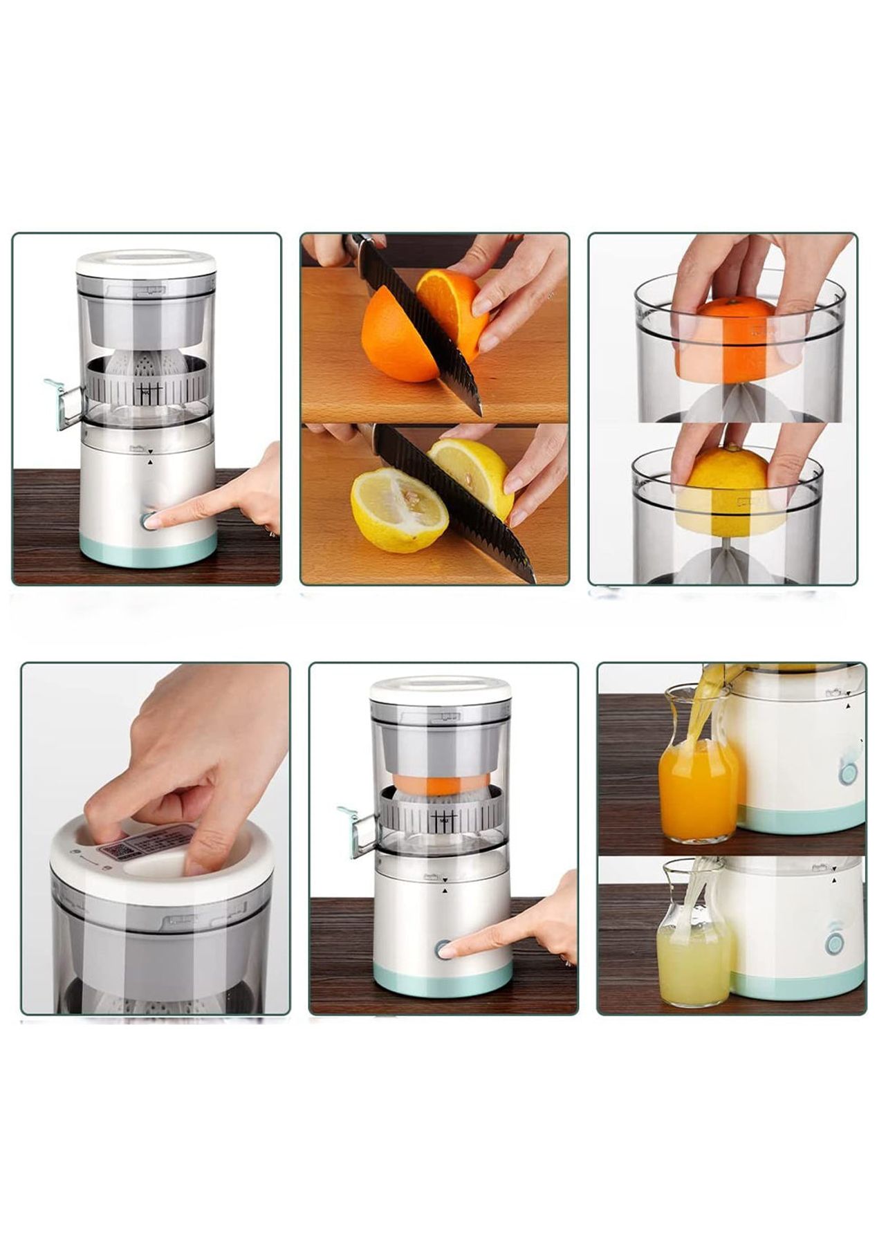 Product Description: The electric juicer has excellent quality and aesthetics. Its 45-watt motor allows you to make a cup of juice in 20 seconds with less noise and no shaking or tipping. With this juicer, you can give your loved one s fresh juice every day and enjoy your time together!Our juicer is portable, allowing you to take it with you wherever you go. The electric juicer uses USB-C technology for charging, making it more convenient to charge your juicer while you're on the go or traveling, without having to worry about running out of power.The rechargeable juicer is suitable for all citrus fruits - oranges, lemons, limes, and other organic citrus fruits (up to 2.9 inches in diameter) - allowing you to enjoy fresh, seedless fruit juice at any time.Our electric juicer is super easy to clean because of its detachable parts. but please do not wash the electric main body, other parts can be washed by hand.The electric juicer is made from BPA-free ABS material so that can juice fresh and healthy juice for both kids and adults. When you receive your juicer, please fully charge it before use. For safety reasons, it cannot be used while charging. If the button shows a red light, it means it needs to be charged. If it shows a white light, it's fully charged and ready for use. Press and hold the switch for 3 seconds to start the electric juicer, and press it again to start juicing.Product Specification:Color: White + GreyWeight: 1150gPower: 45WCapacity: 401ml-600mlMaterial: Plastic + Stainless SteelSize: 112 x 237.5 x 138 mmPower Supply: USB RechargeableCharging Time: 1.5 ¨C 2hoursFunction: Mini Portable Juice ExtractorPackage Inclusion:1 x Juice Extractor1 x USB Charging Cable 1 x Manual