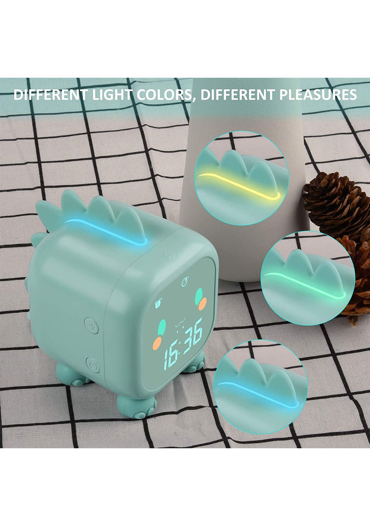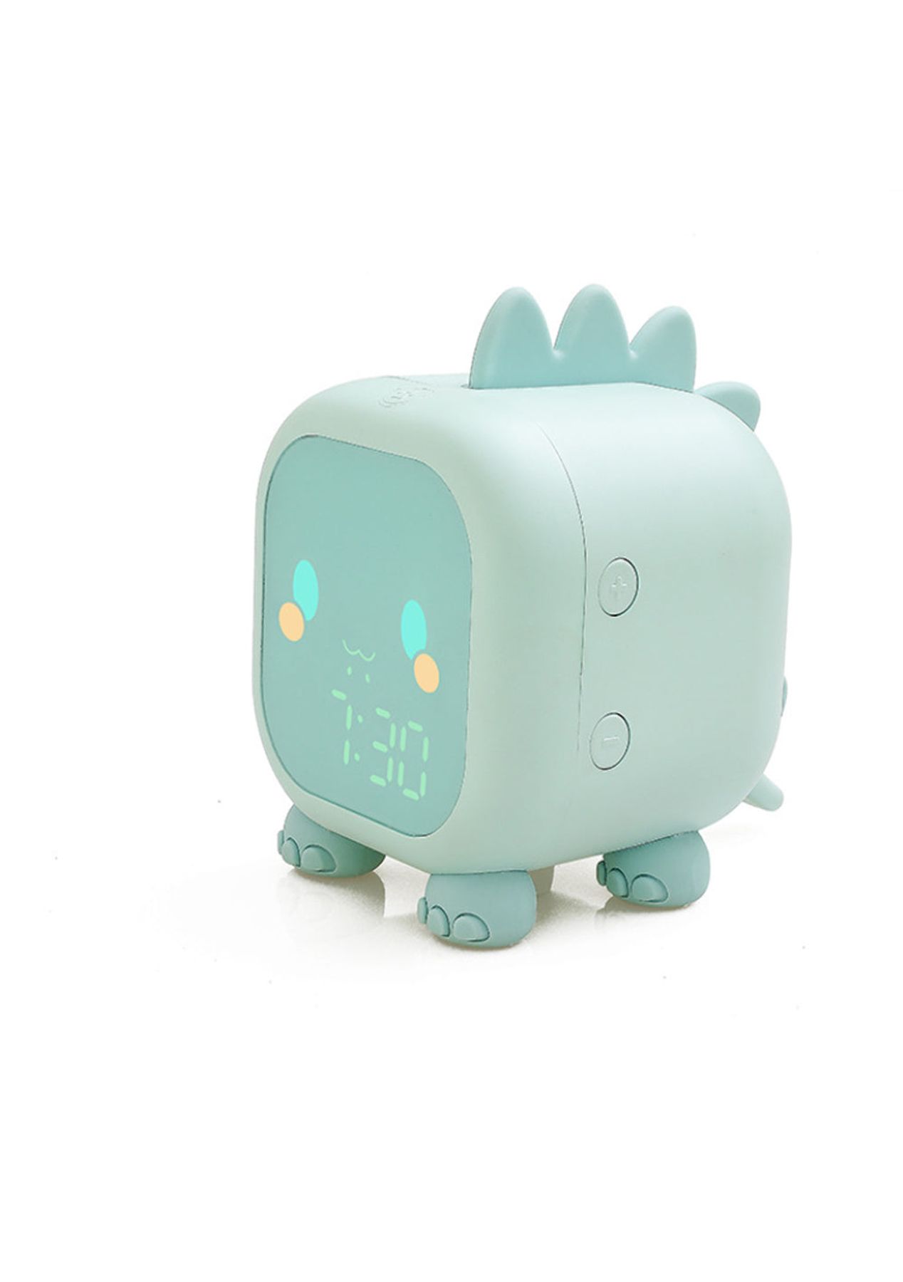 Product Description: Sleep Training Clock: The cute dinosaur design alarm clock uses environmentally friendly and safe silicone material, which feels soft and comfortable. The alarm clock with soft and colorful lights is an essential option to train children to develop good sleep habits.Talking alarm clock: The dinosaur alarm clock has a report time function. Select B00 to turn off the report time function, select B01 will report the time all day, and select B02 will report the time during the day (6 to 8 pm).Sensor Smart Watch: Before going to bed, you can set a 30 minute / 60-minute sleep mode. When you want the screen to turn on, you can wake up the screen by making a sound louder than 56 dB (clapping your hands) or by touching the watch. When the watch detects sound, the screen will automatically light up and turn off after 15 seconds.Multifunctional Design: The cute dinosaur alarm clock not only has soft colored lights but also has a snooze function that can be activated by pressing the top button when alarms sound. At the same time, it also has a thermometer and date display function. The dinosaur alarm clock uses a rechargeable lithium-ion battery, which is more environmentally friendly and energy-saving.?Product Specification:Color:?Blue, Pink, GreenMaterial:?ABS, PC, SiliconSize:?8.8*11.7*11.5cmWeight:?230gFunctions:?Alarm ClockUsage Time: 10-15 days (depends on usage)Charging Time: 6 hoursBattery Information: 1000mAhRated Voltage: DC5VRated Power: 1.25W?Package Inclusion:1 * Dinosaur Alarm Clock1 * USB Cable1 * User Manual ?